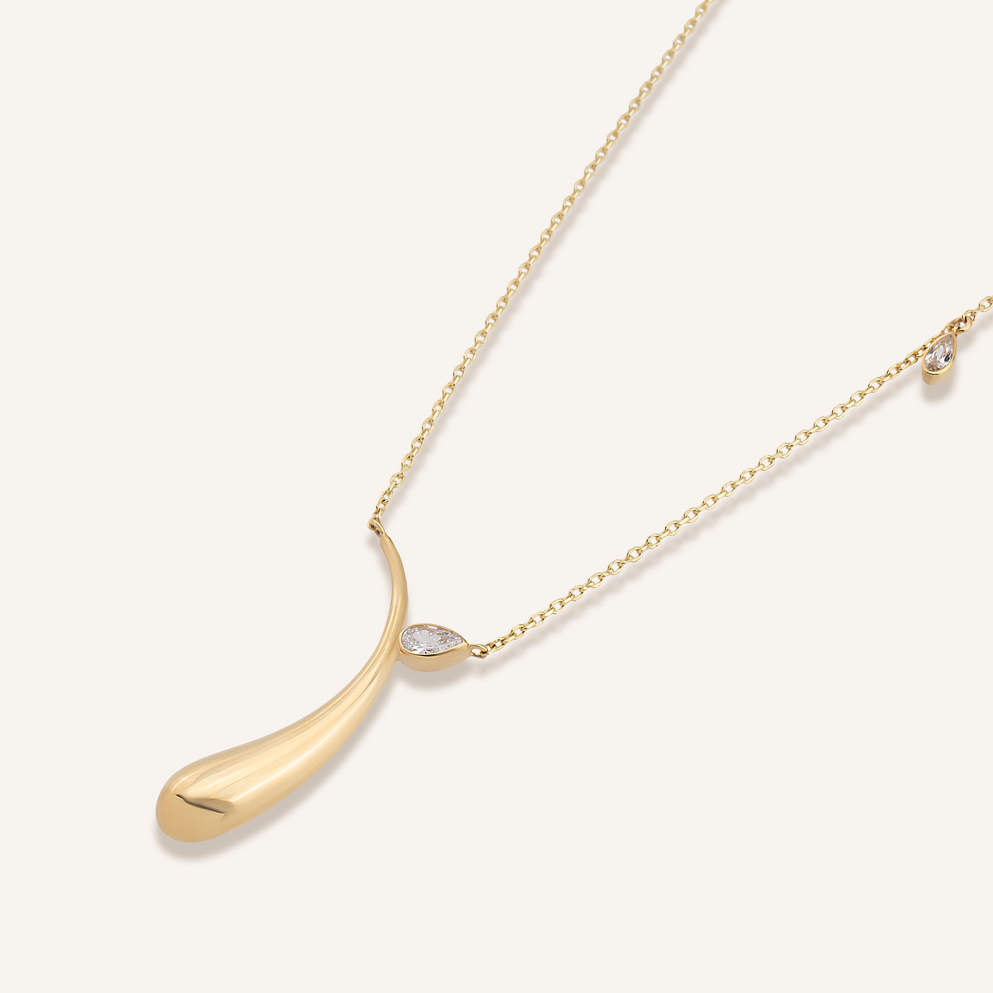 Brisca kolyesi, zarafetin ve yenilenmenin sembolüdür. Damla taş, ışığın yönünü değiştirir. Zincir boyunca akan altın detaylar, doğal bir denge hissi yaratır.