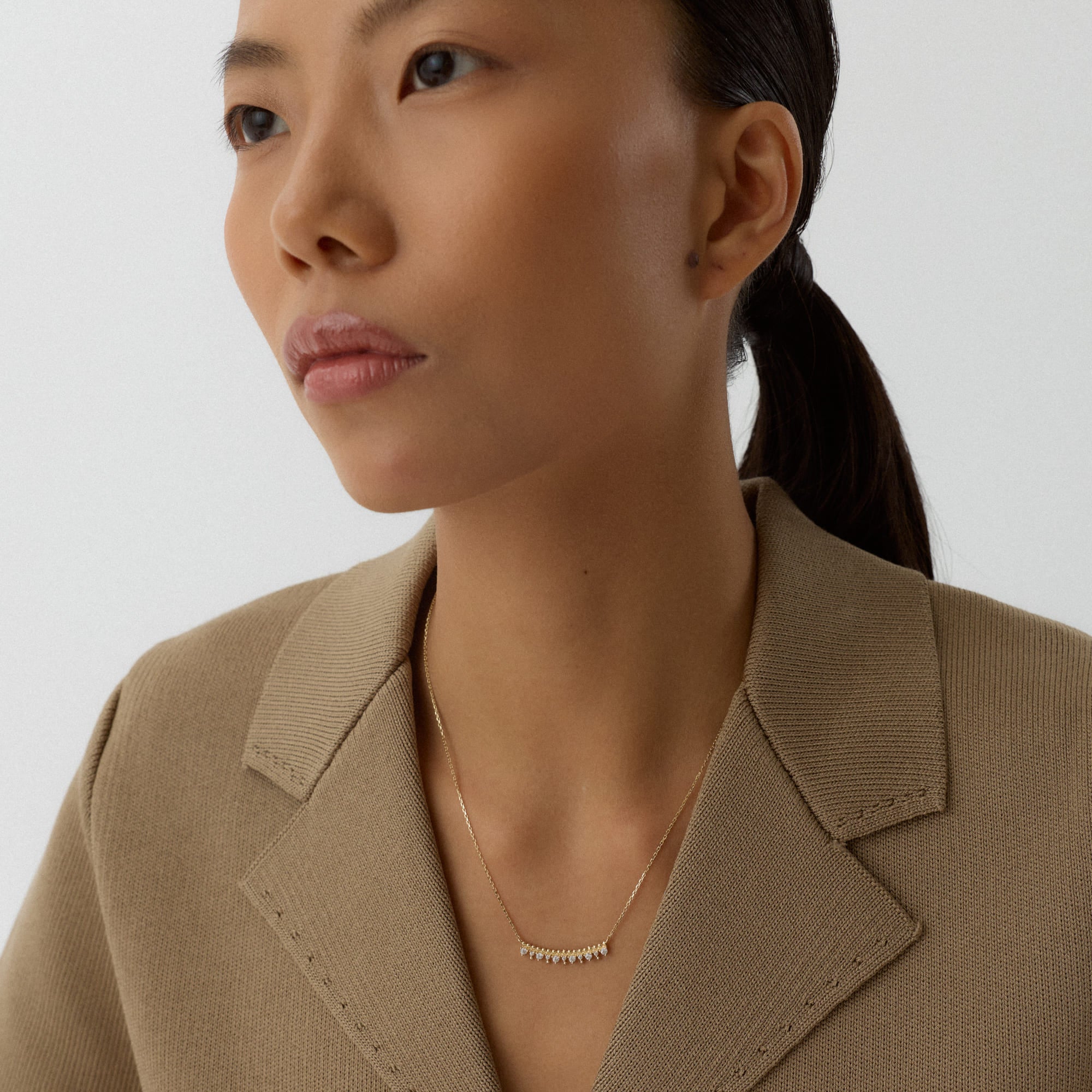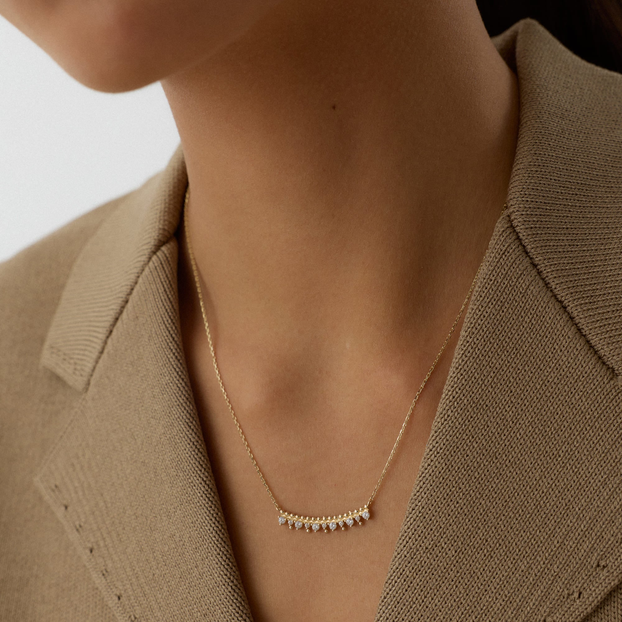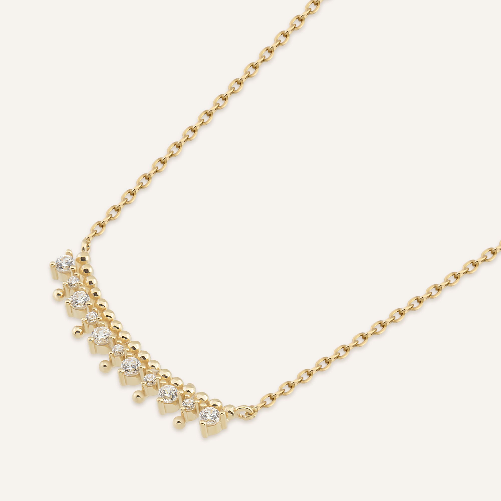 Delora kolyesi, boyunda modern çizgilerle birleşen klasik bir zarafet taşır. Zincir boyunca süzülen taşlar, ışığın yönünü her hareketle değiştirir. Her parıltı, özgüvenli bir şıklığın sembolüdür.