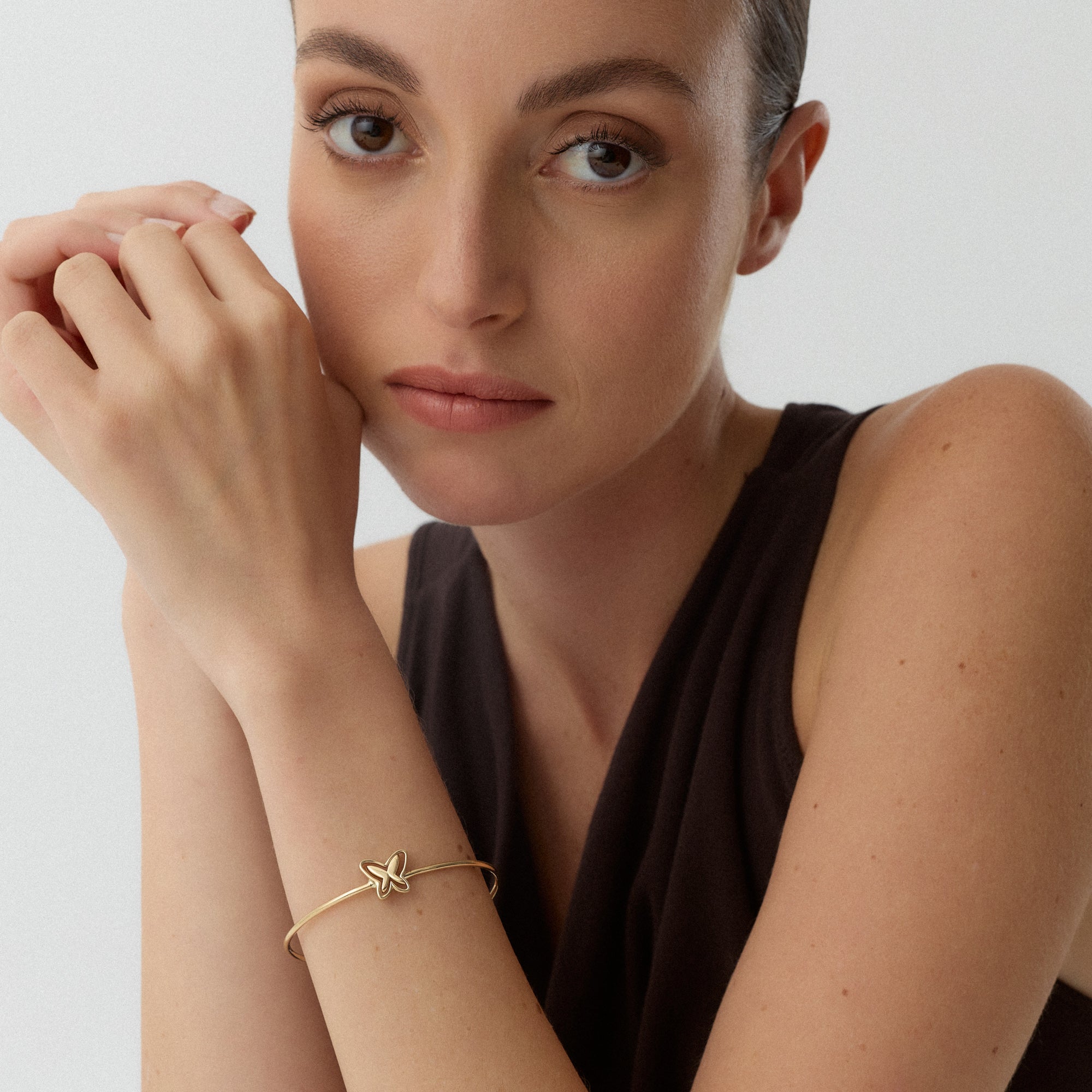 AJA Papillon, özgürlüğün ve aşkın ruhunu bileğinize taşır. İnce 14 ayar altın kelepçe formu üzerine işlenen iç içe geçmiş kelebek figürü, sevginin dönüşümünü ve hayata kattığı zarafeti minimalist bir dille ifade eder.
