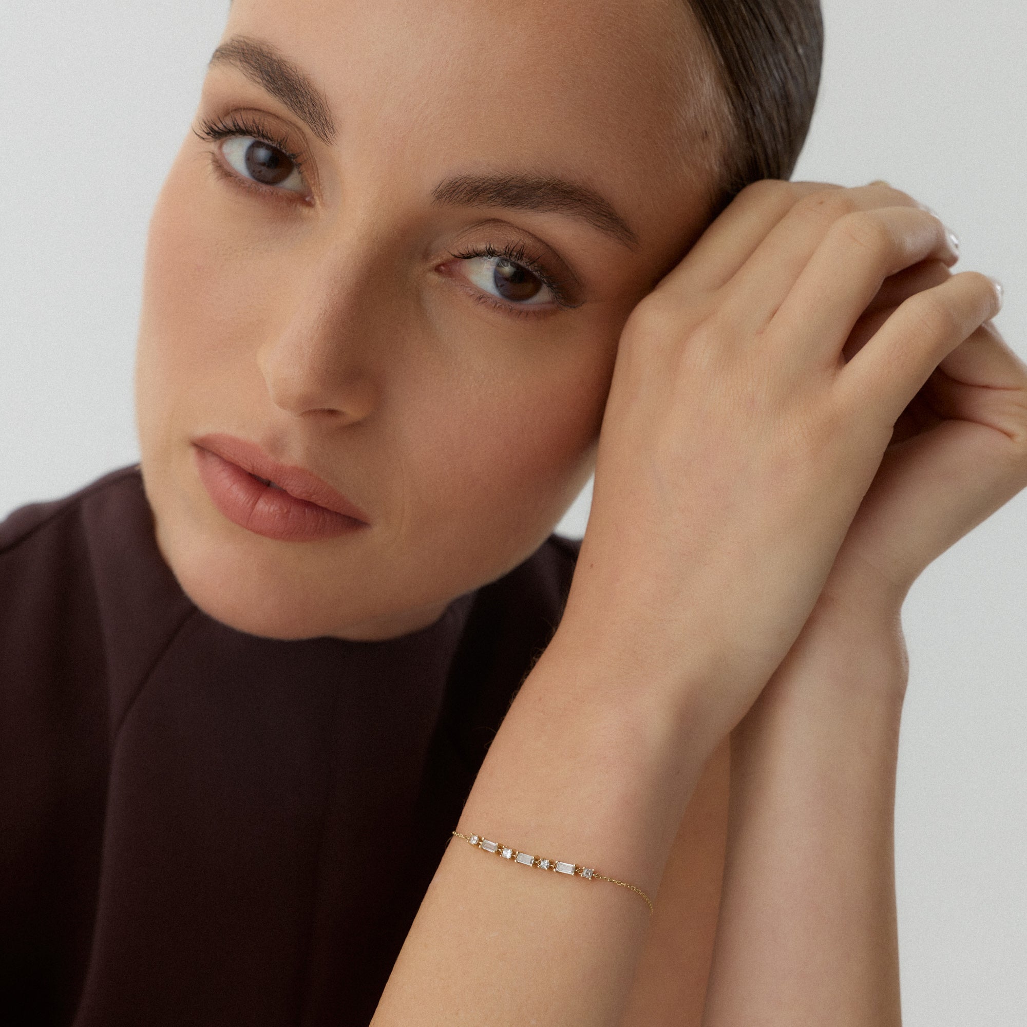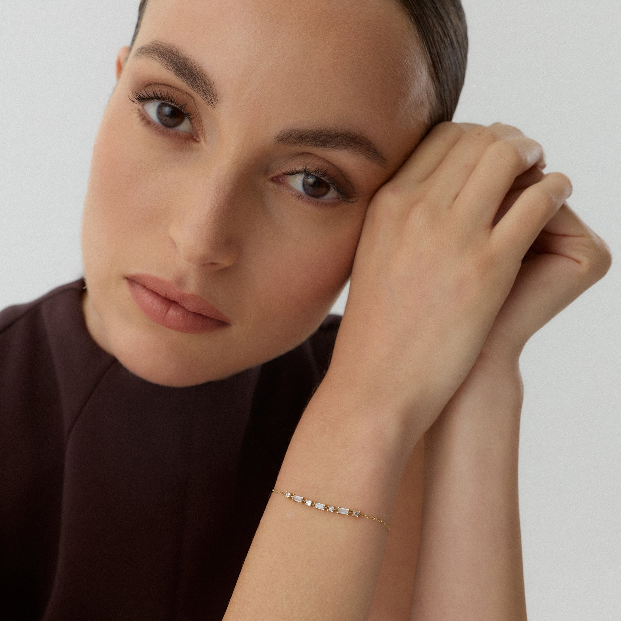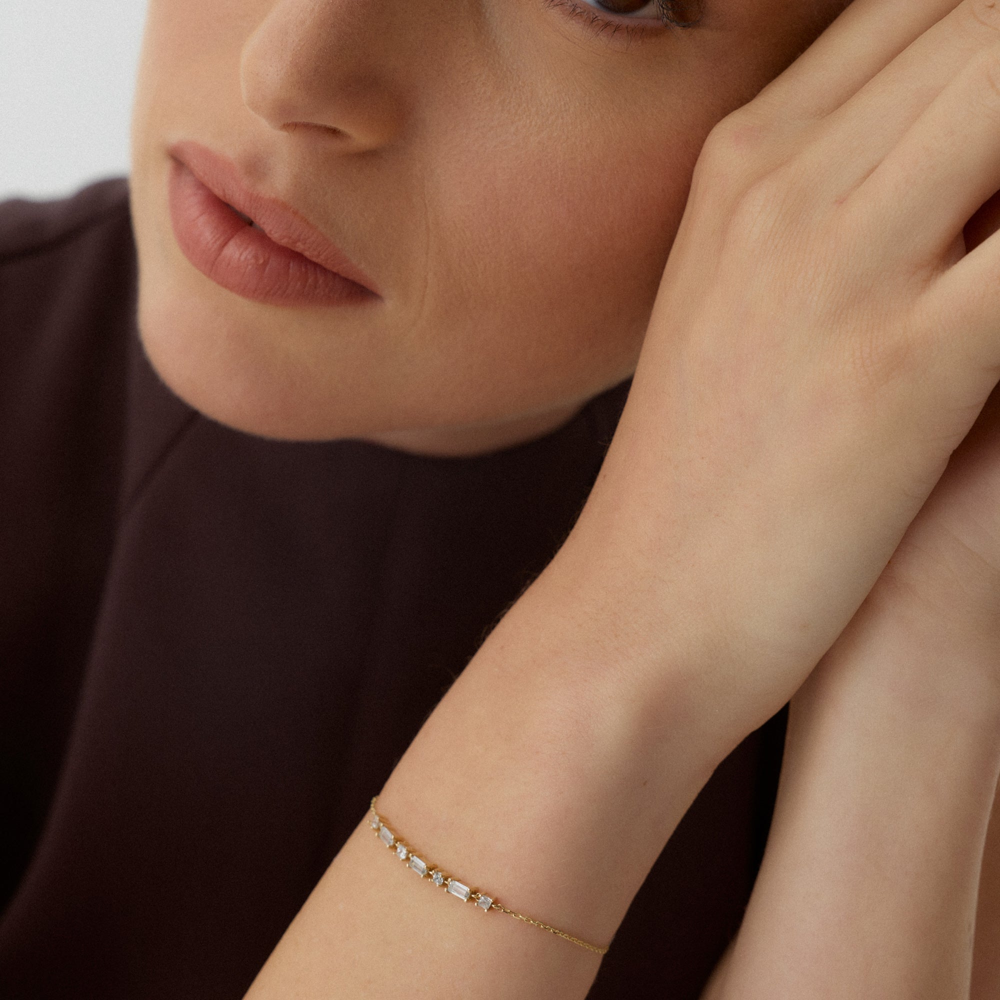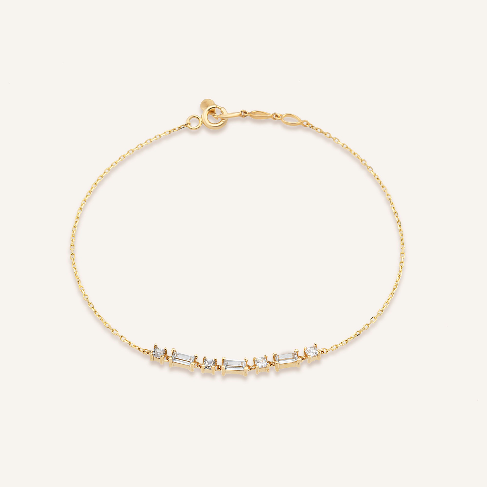 Arista bilekliği, geometrik düzenin zarif bir yorumu. Baget kesim taşlar, altın zincirin üzerinde ritmik bir simetriyle dizilir. Işığı yakaladığı her noktada modern bir parıltı oluşturur. İnce ama dikkat çekici formu, bileğe zarif bir yapı kazandırır. Günlük kombinlerde sofistike, gece stilinde ışıltılı bir vurgu sunar. Arista bilekliği, çizgisel tasarımın şıklıkla birleştiği mükemmel dengeyi temsil eder.