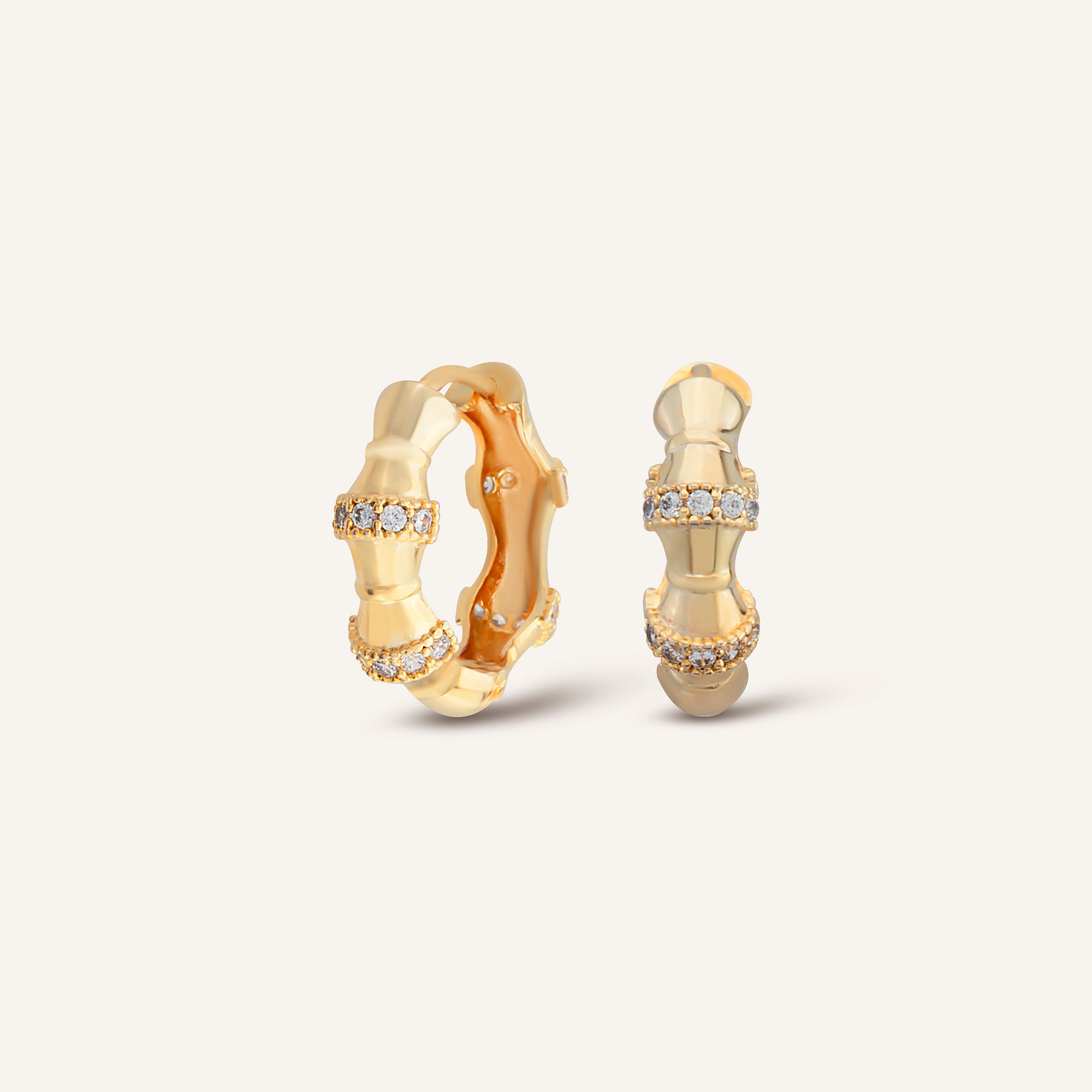 Bambu kesimin doğal ritmini çok taşlı dizilimin parlak enerjisiyle buluşturan AJA Bambira Bambu Figürlü Taşlı Halka Klips Küpe, 14 ayar altının sıcak dokusuna modern ve canlı bir yorum kazandırıyor. Yuvarlak zirkon taşların çoklu dizilimi ışığı ritmik bir akışla yansıtırken, bambu formunun organik çizgisi tasarıma dokusal bir derinlik katıyor. Halka formu bu doğal hareketi dengelerken klips mekanizması güvenli ve konforlu bir kullanım sunuyor.