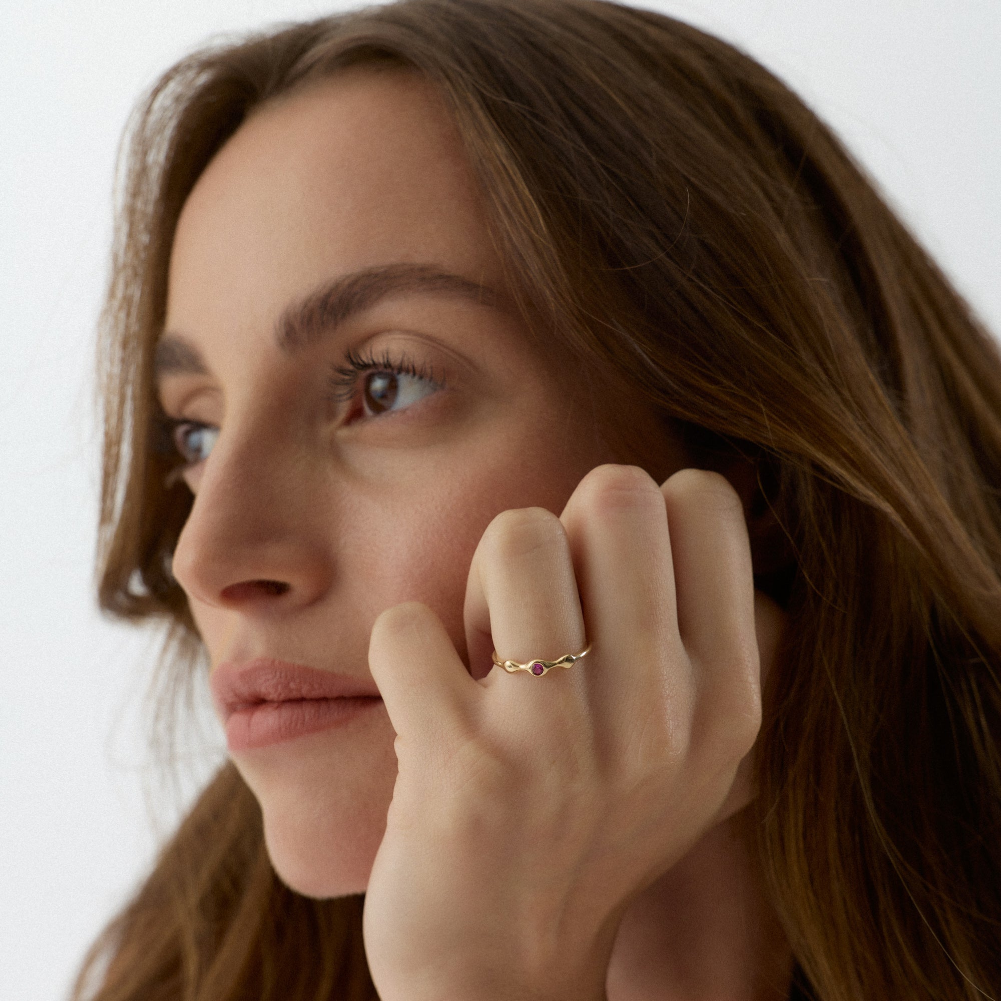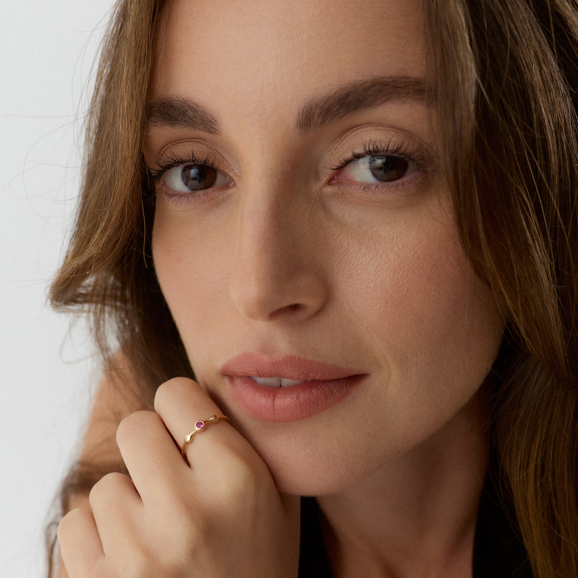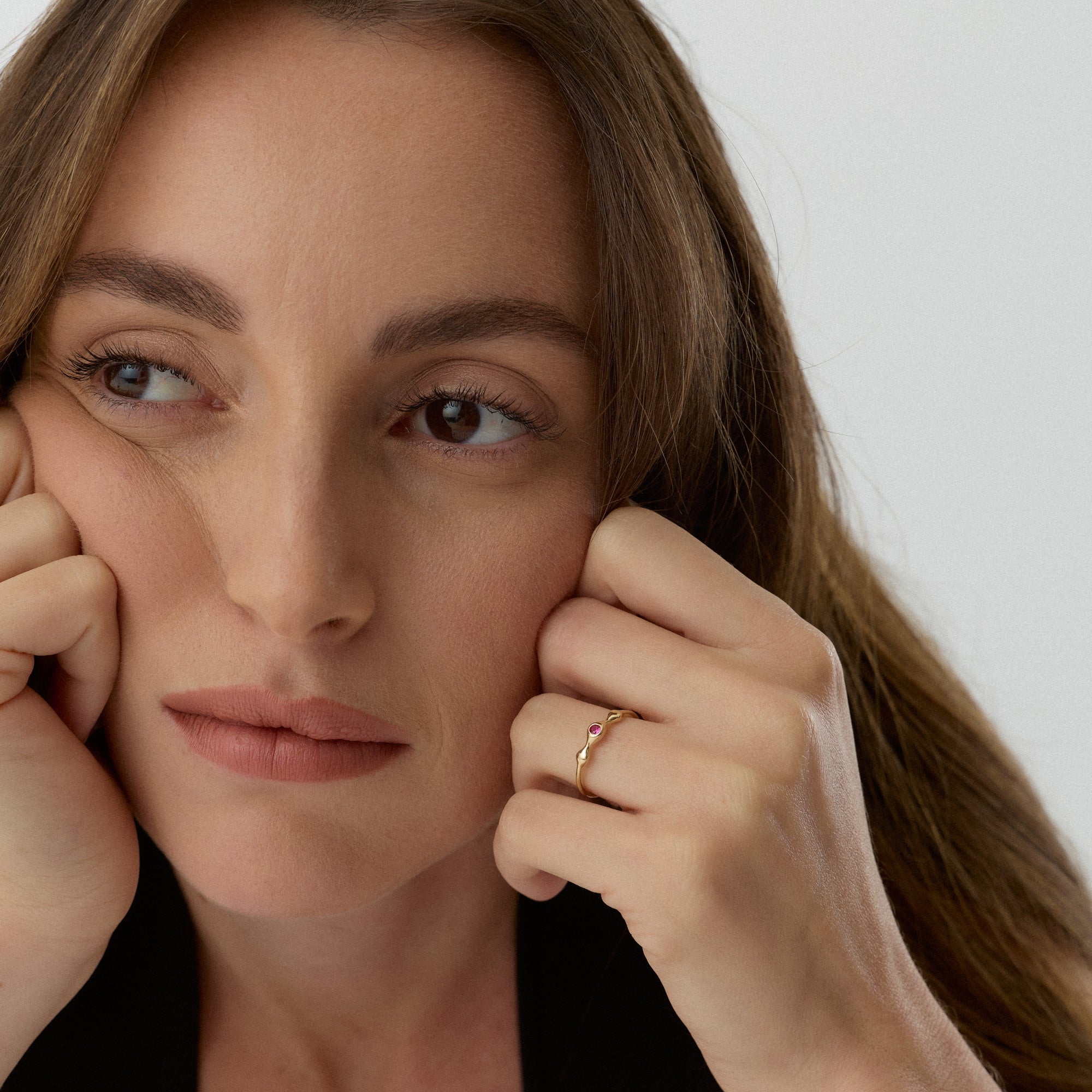 Voreno Ruby Yüzük, çizgisel sadeliği pembe taşın sıcak ve canlı ışıltısıyla buluşturur. Altın yüzeyin zarif parlaklığı, taşın renkli enerjisiyle birleşerek tasarıma modern ve dikkat çekici bir ifade kazandırır. Yalın formu sayesinde güçlü bir vurgu yaratan yüzük, her harekette değişen ışık oyunlarıyla kendine özgü bir parıltı sunar. Voreno’nun imza çizgisini koruyan bu ruby yorum, sade ama karakter dolu bir etki arayanlar için zarif ve unutulmaz bir tamamlayıcıdır.