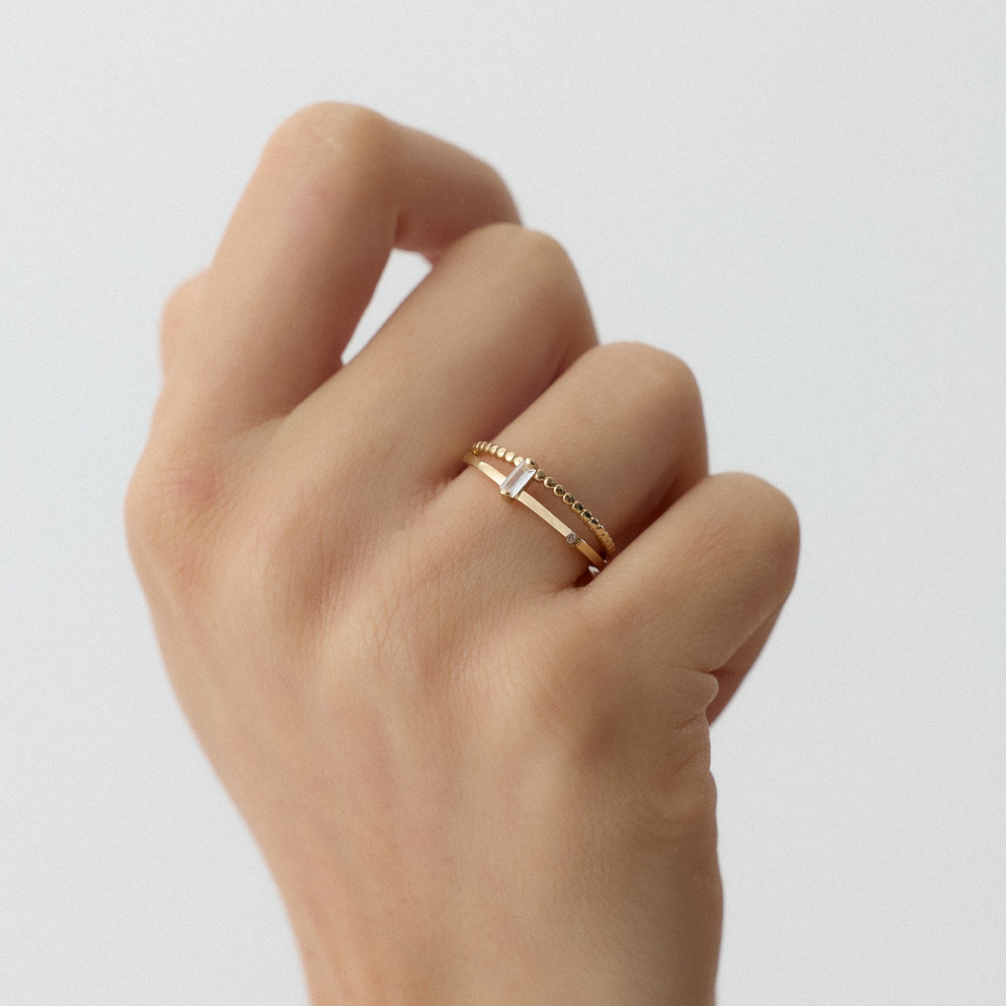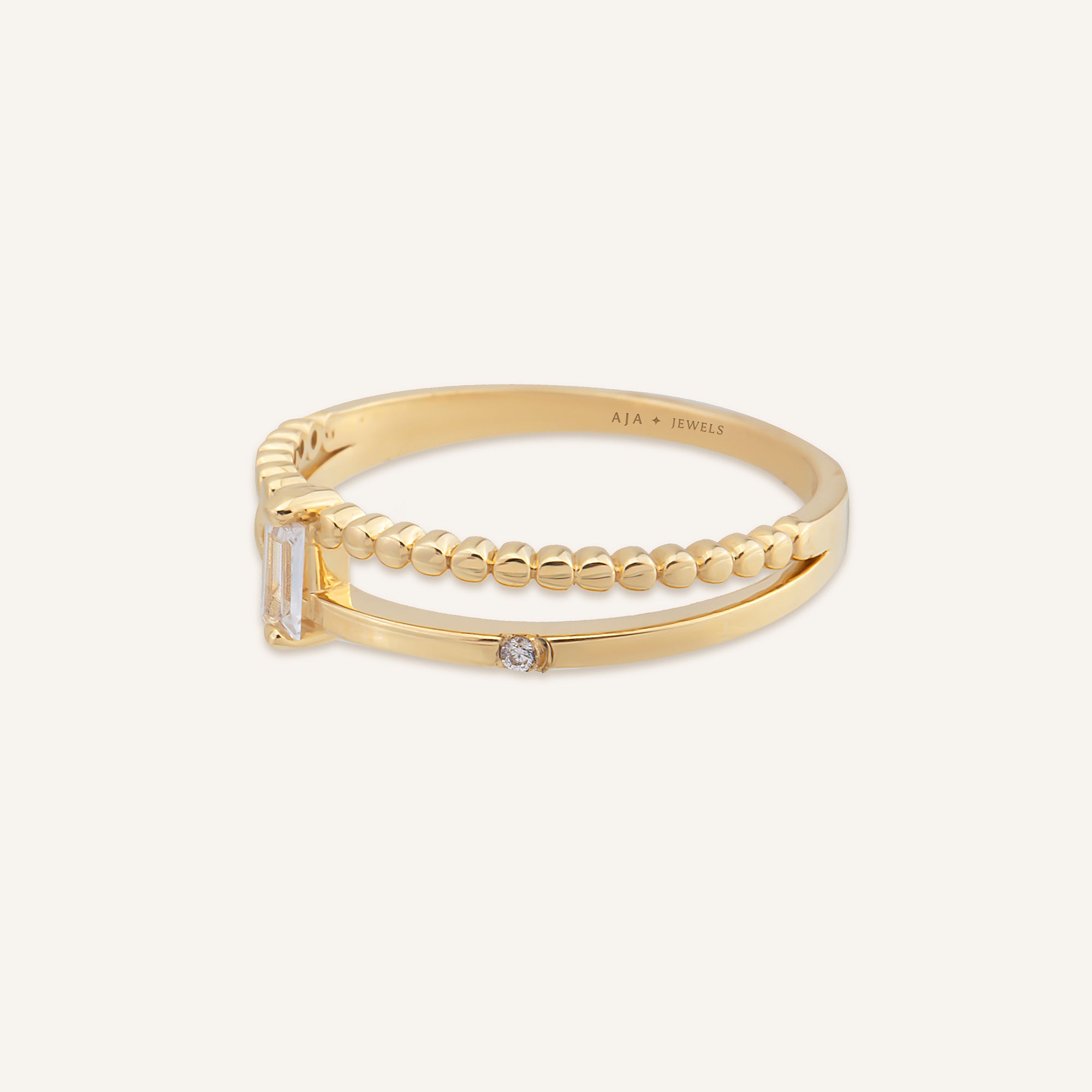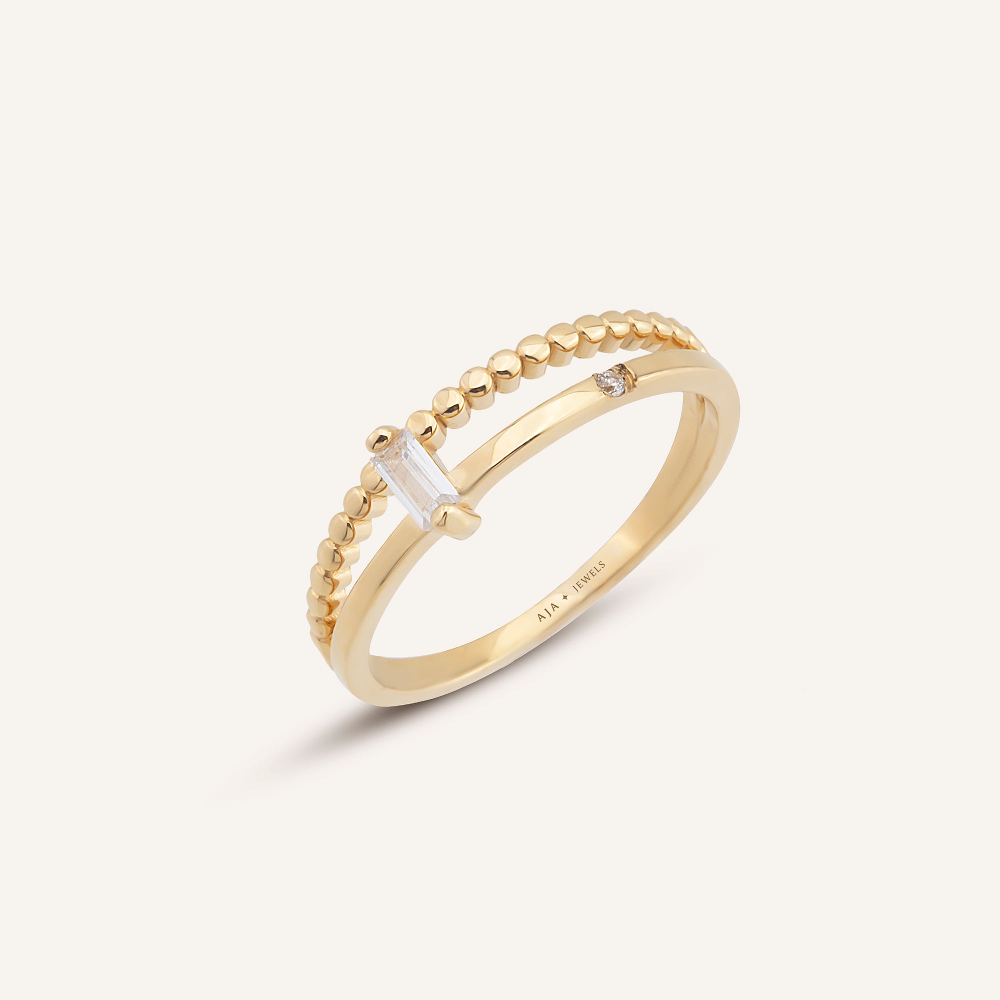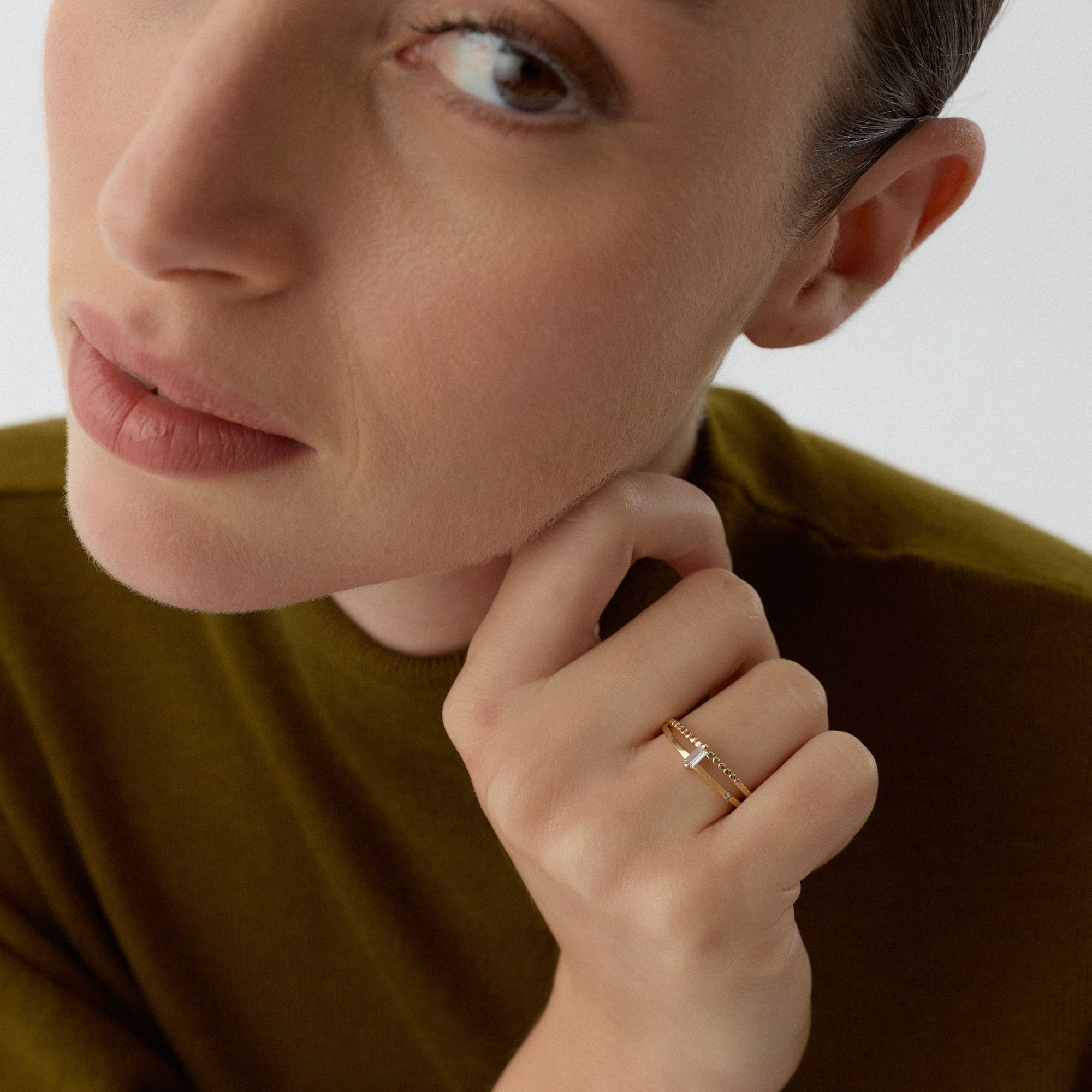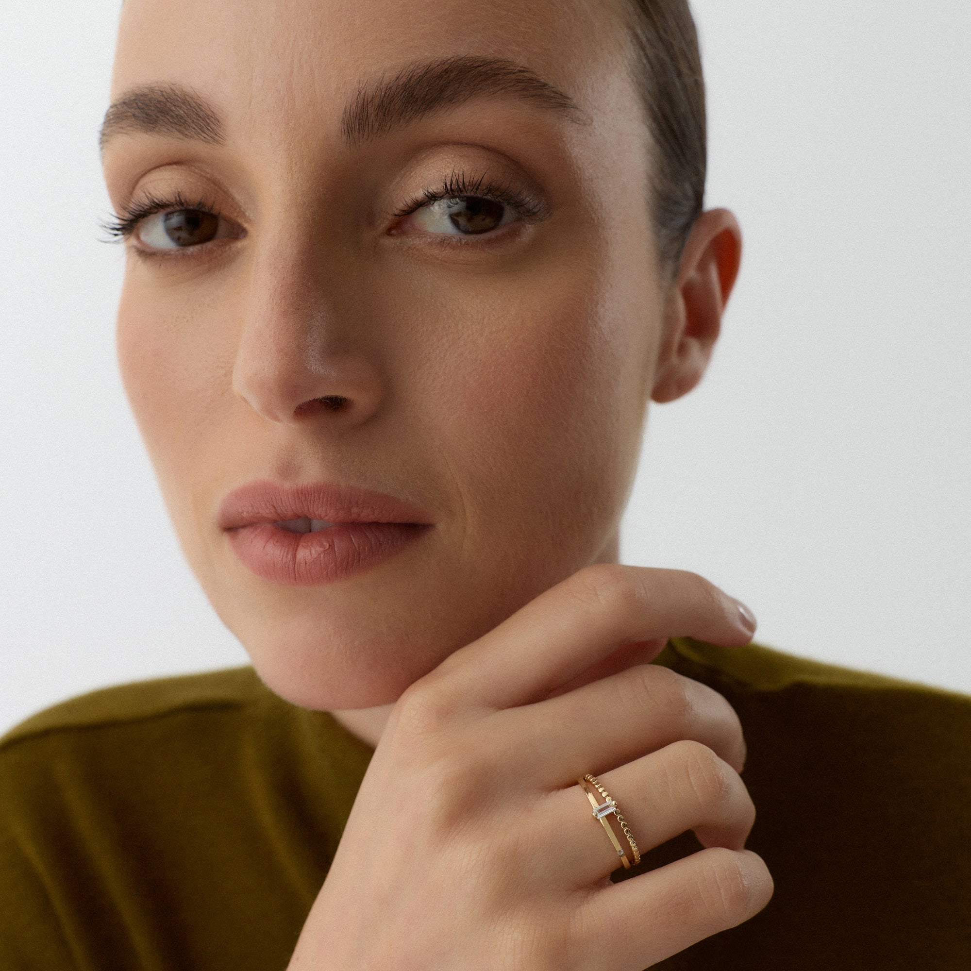 Crystallum yüzüğü, ışıltının doruk noktasını temsil eder. Çok taşlı formu, yüzeyde kristalimsi bir parlaklık yaratır. Her taş, ışığı farklı açılardan yansıtarak yüzüğe derinlik kazandırır. Altının yumuşak tonu, bu parıltıyı zarifçe dengeler. Crystallum yüzüğü, ölçülü ama etkileyici bir ihtişamın sembolüdür — modern kadının sade ama güçlü duruşunu anlatır.