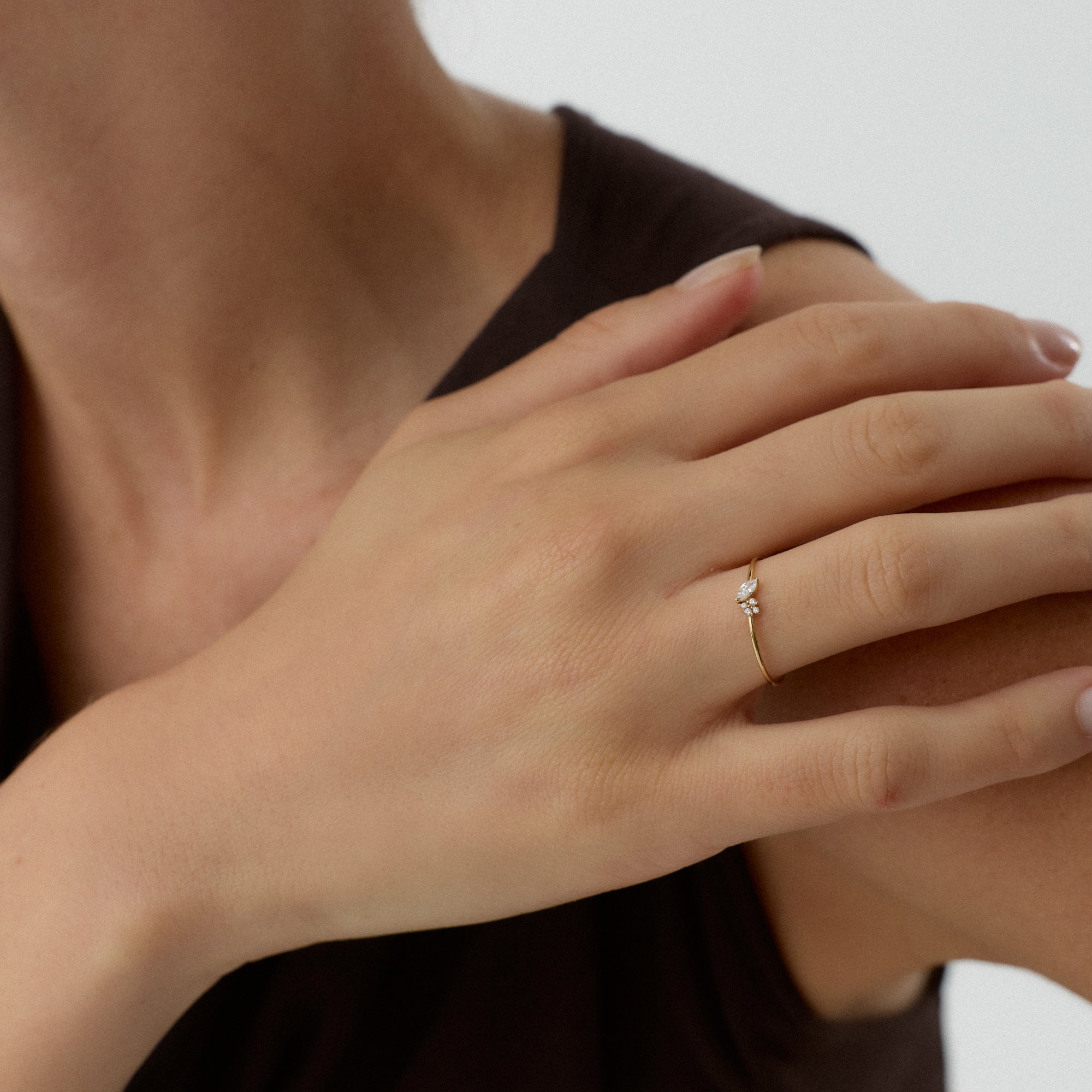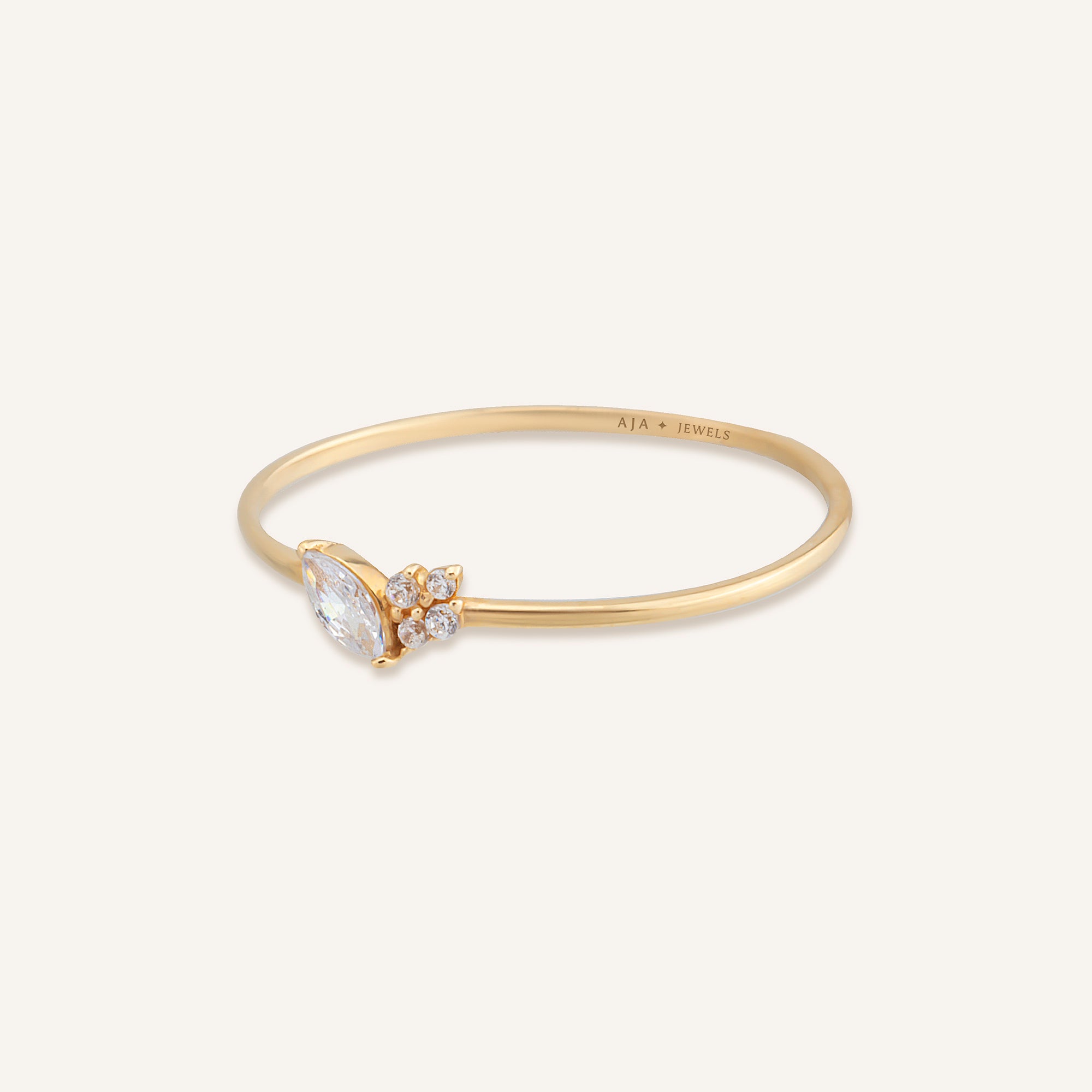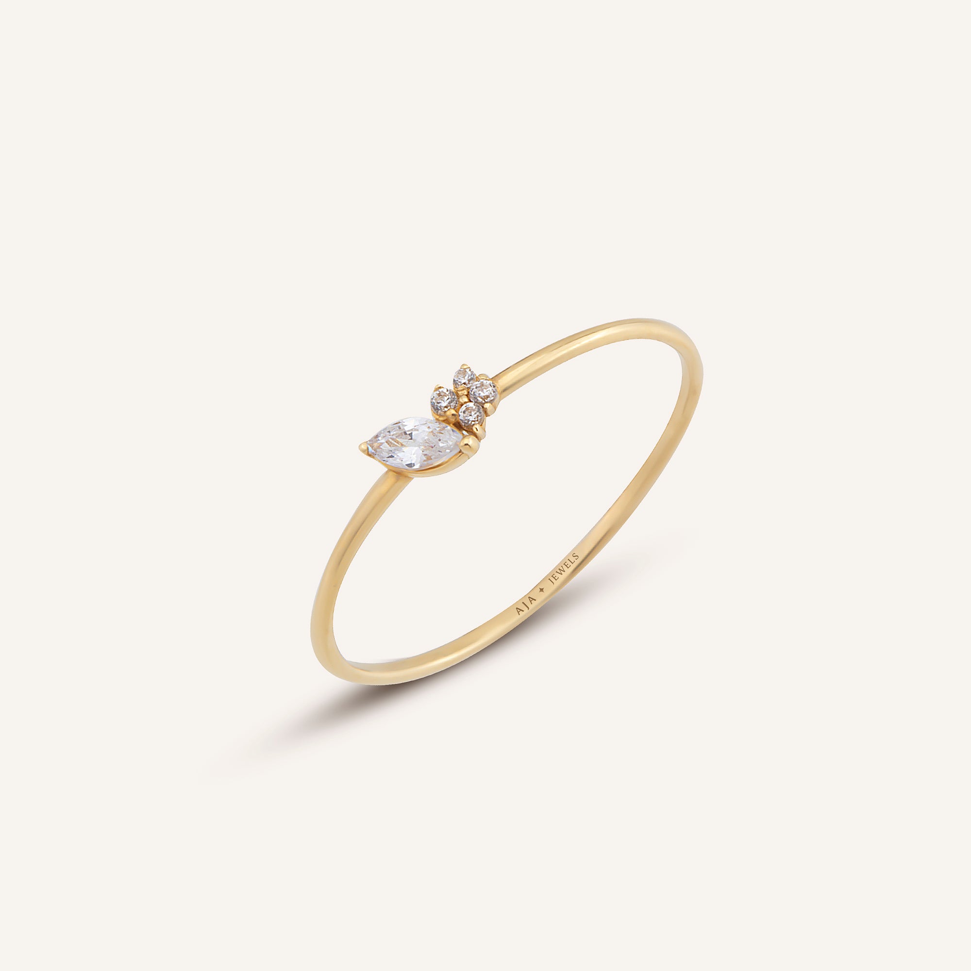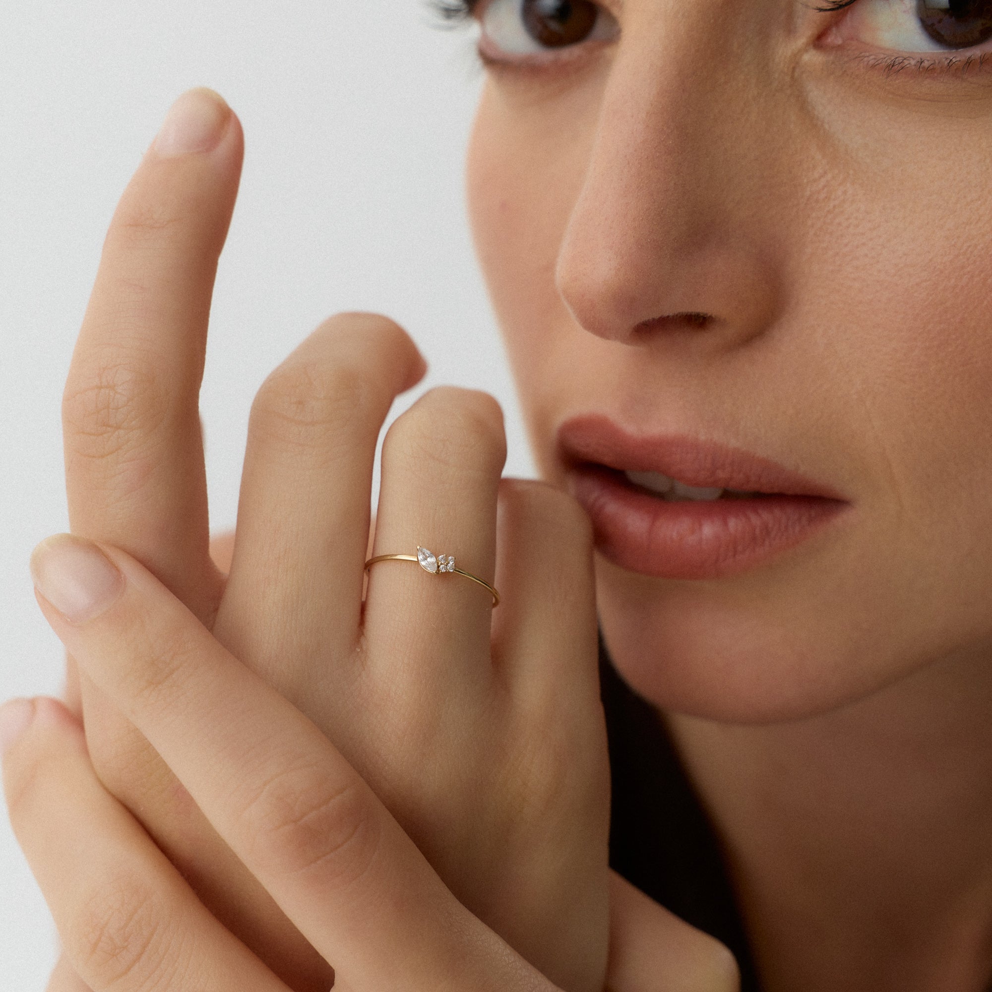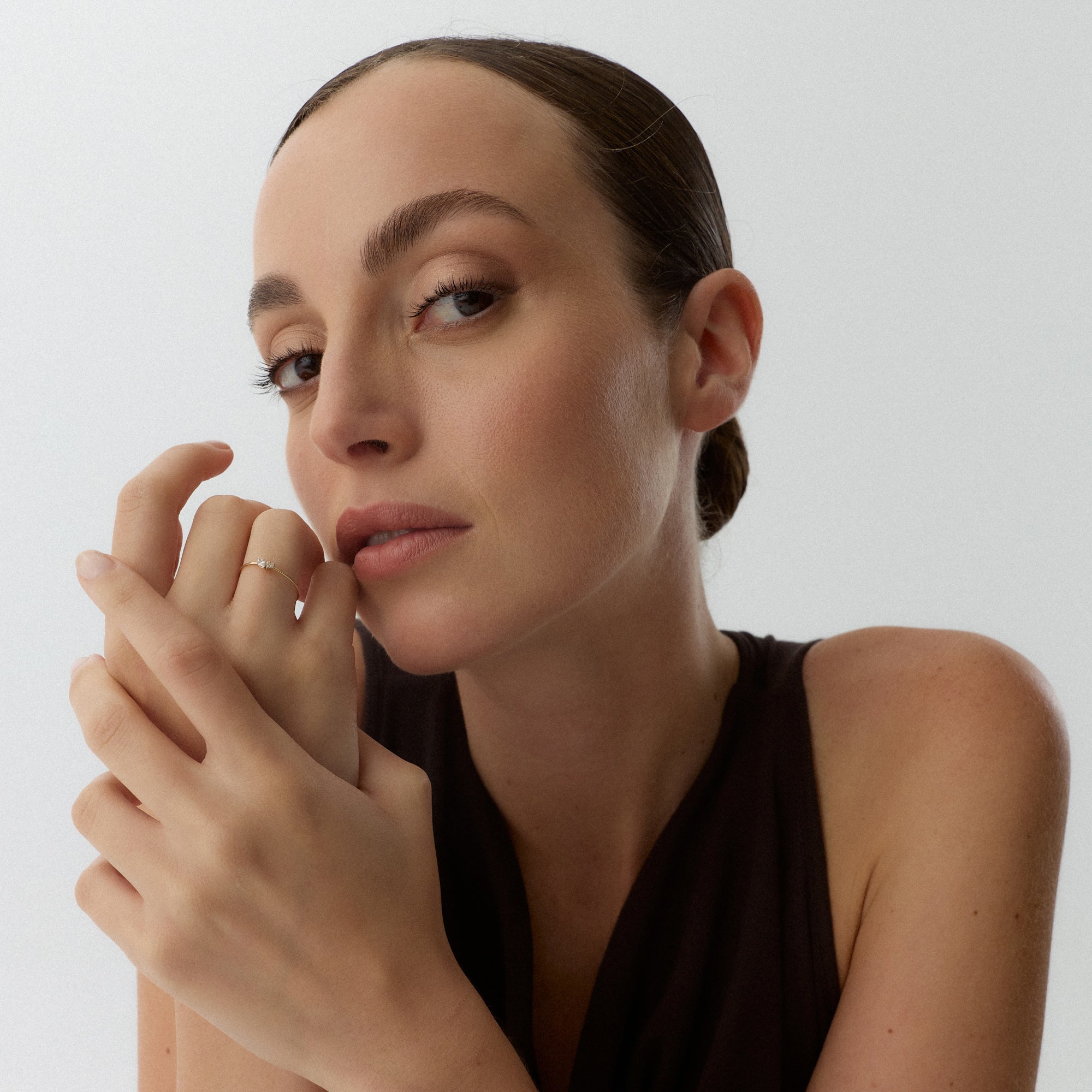 Esmira Yüzük, zarif bir form içinde güçlü bir enerjiyi taşır. Altının sıcak dokusu, ışığın yumuşak tonlarıyla birleşir. Feminen bir zarafeti modern bir dengeyle sunar. Esmira Yüzük, sade ama göz alıcı bir ışıltı arayanlar için kusursuz bir seçimdir.