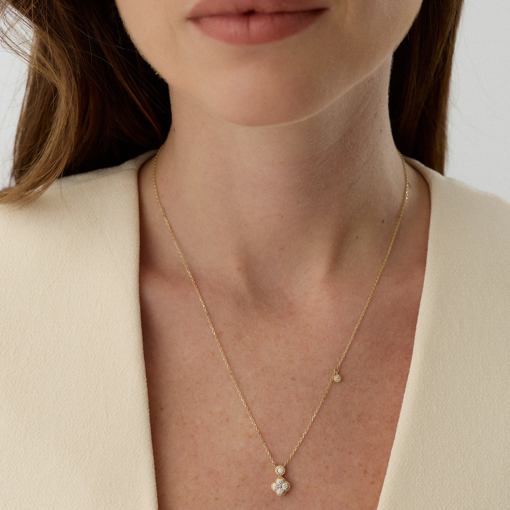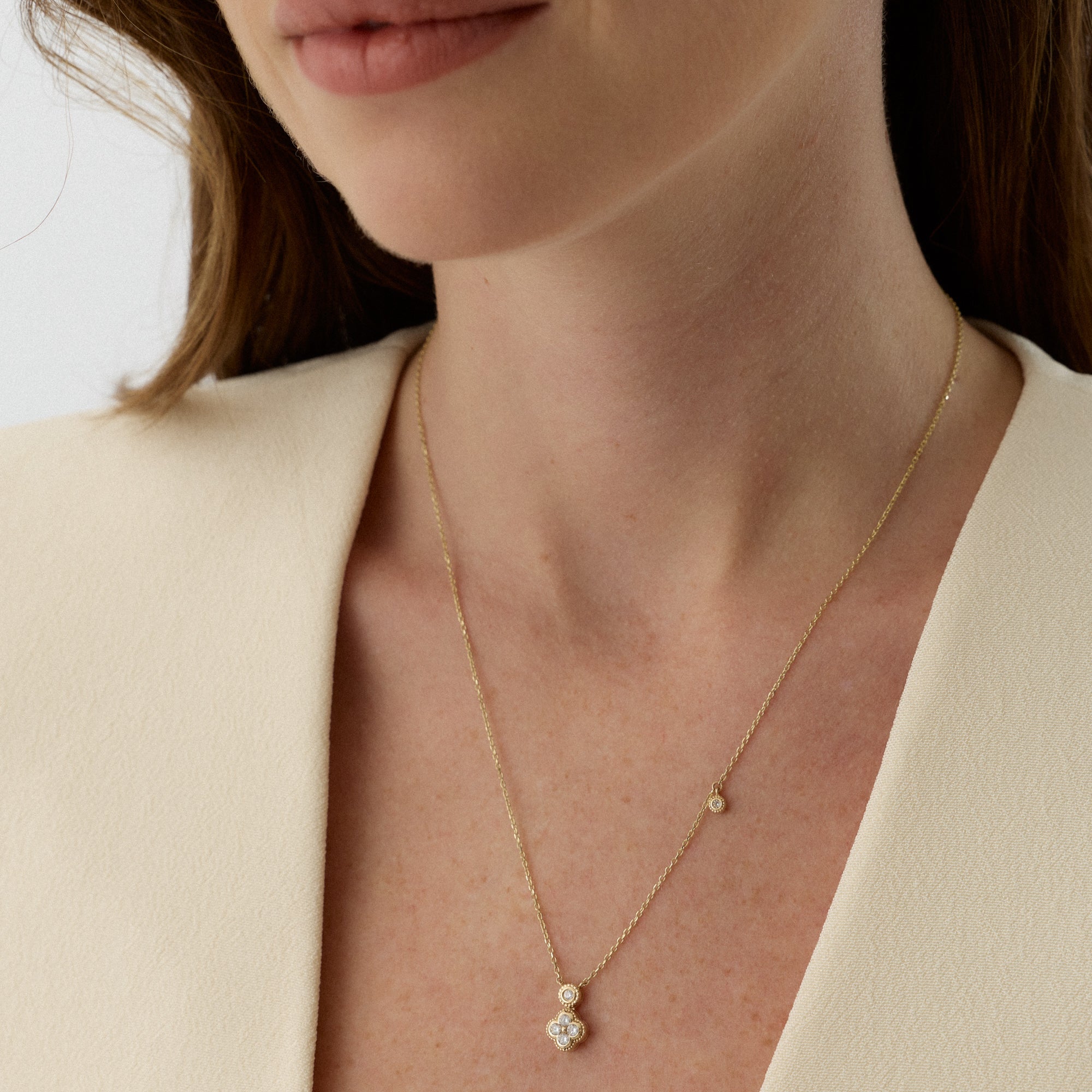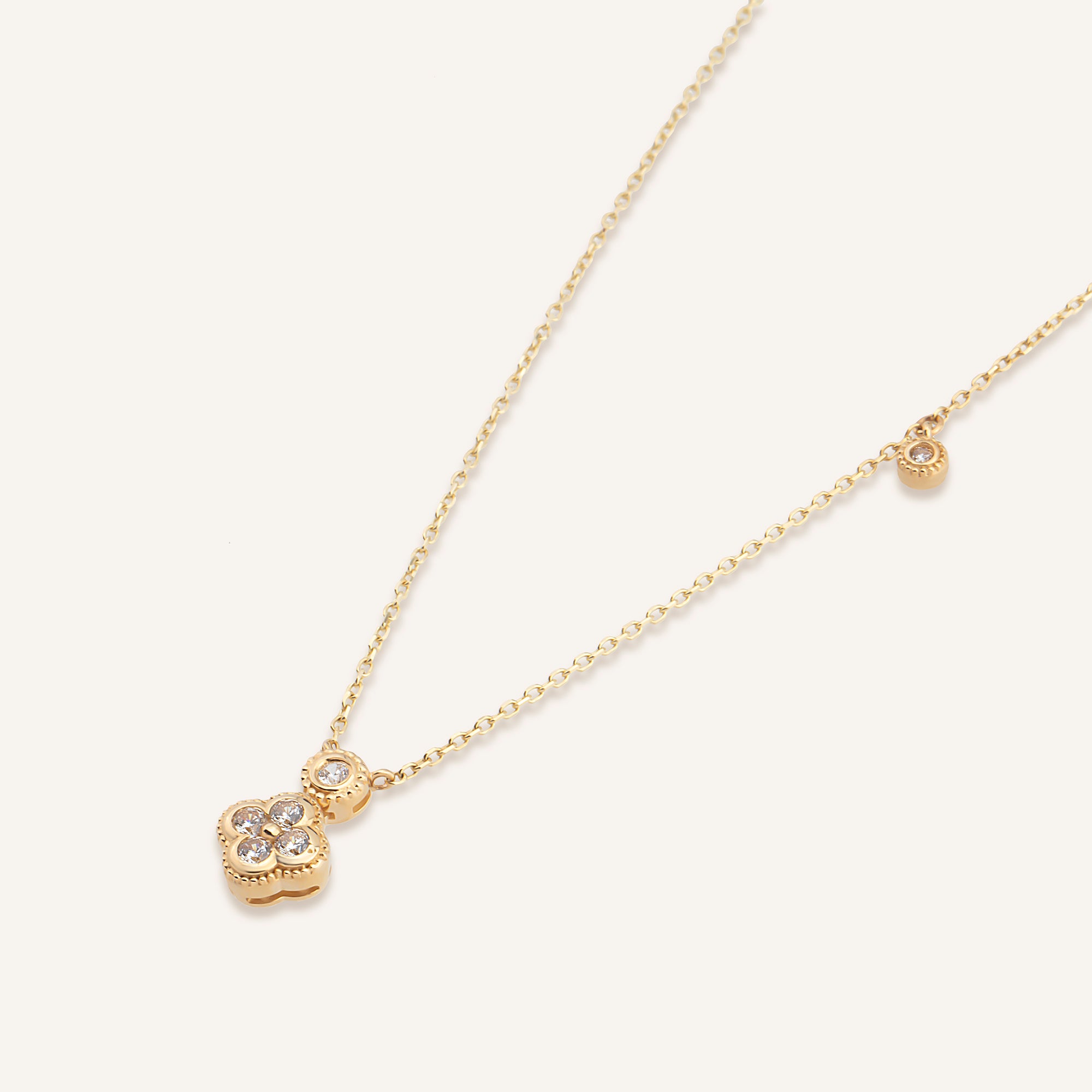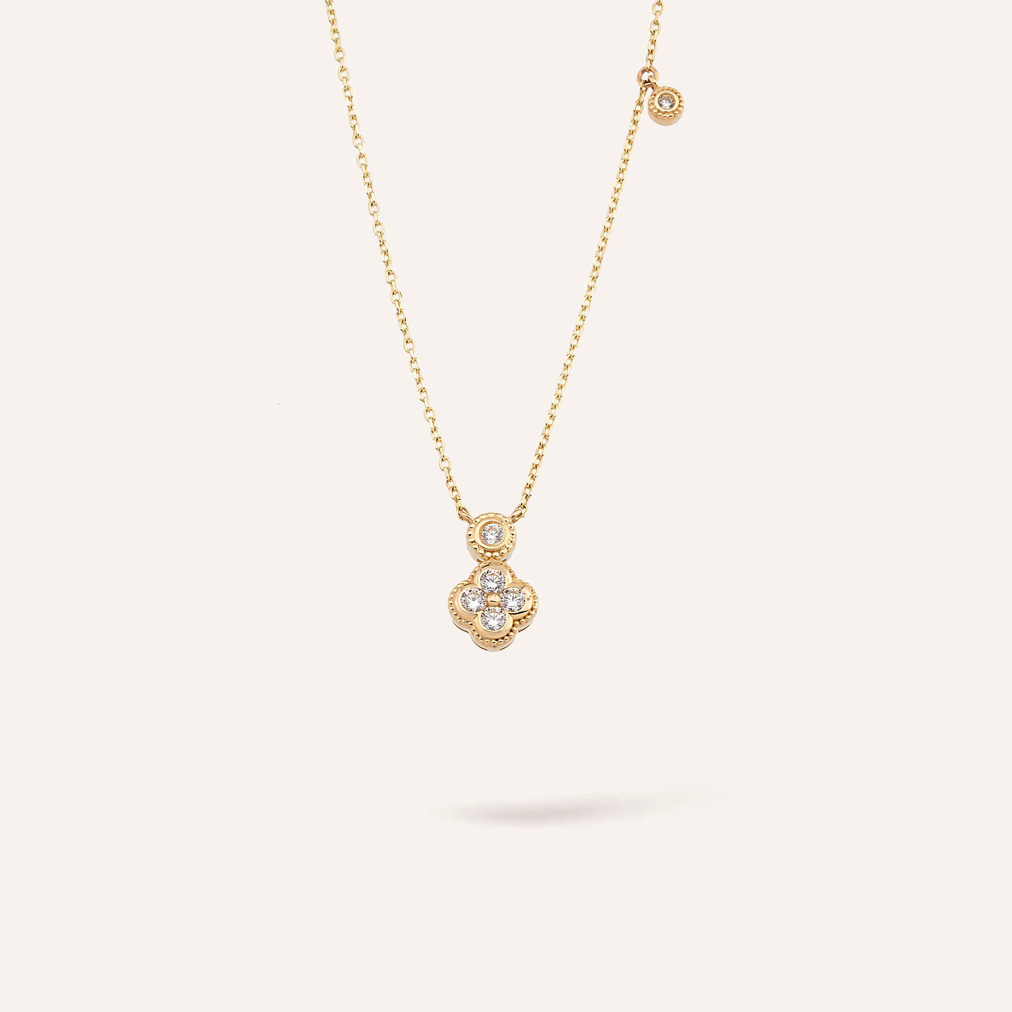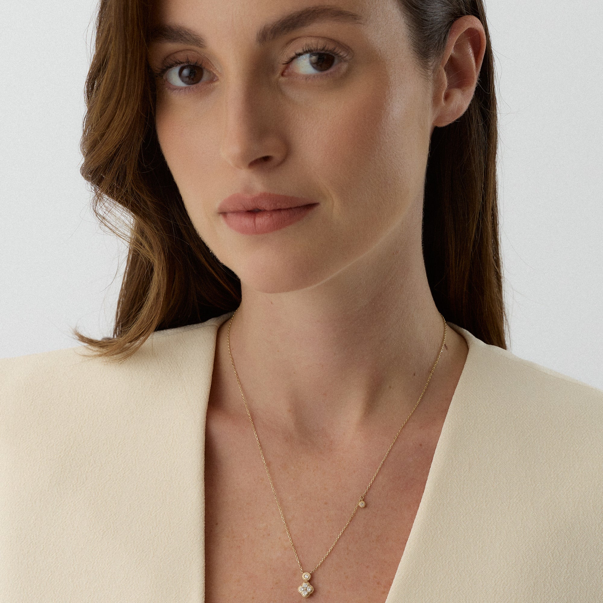 Fluxora kolyesi, zincir boyunca hareket eden ışığın zarif bir sembolüdür. Merkezdeki çok taşlı figür, enerjinin birleştiği noktayı temsil eder. Her taş, farklı bir açıdan yansıyarak canlı bir ışıltı oluşturur. Altının sıcak tonu, bu enerjiyi zarifçe çerçeveler. Kolye, kadının içindeki sürekli yenilenme gücünü vücut bulmuş bir formda taşır; her harekette parlayan bir zarafet ifadesidir.