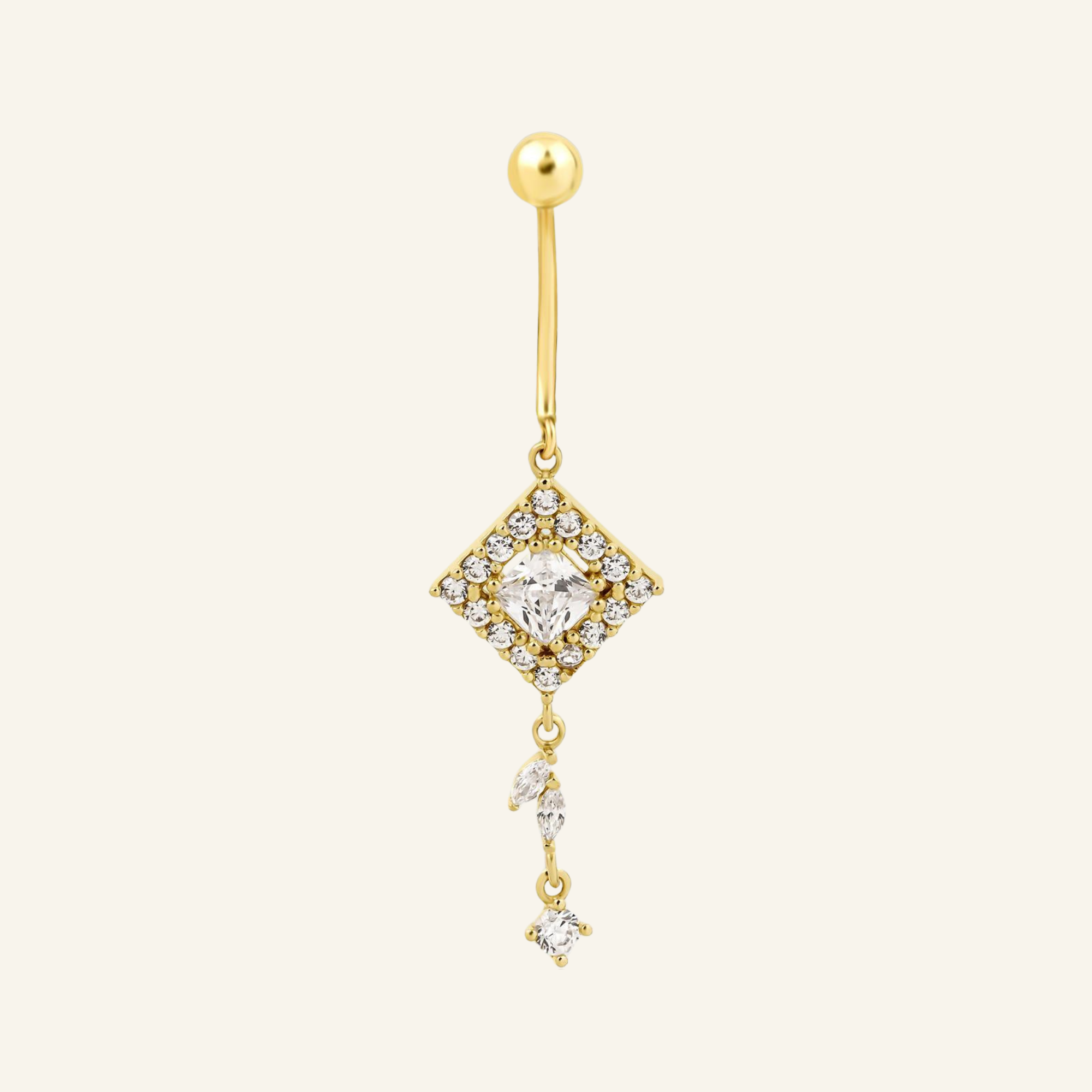Golden Line Baklava Motifli Prenses Kesim Taşlı Sallantılı Altın Göbek Piercing