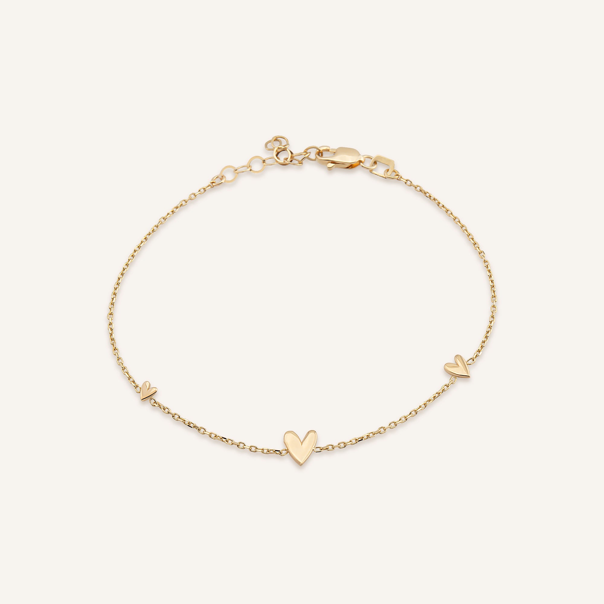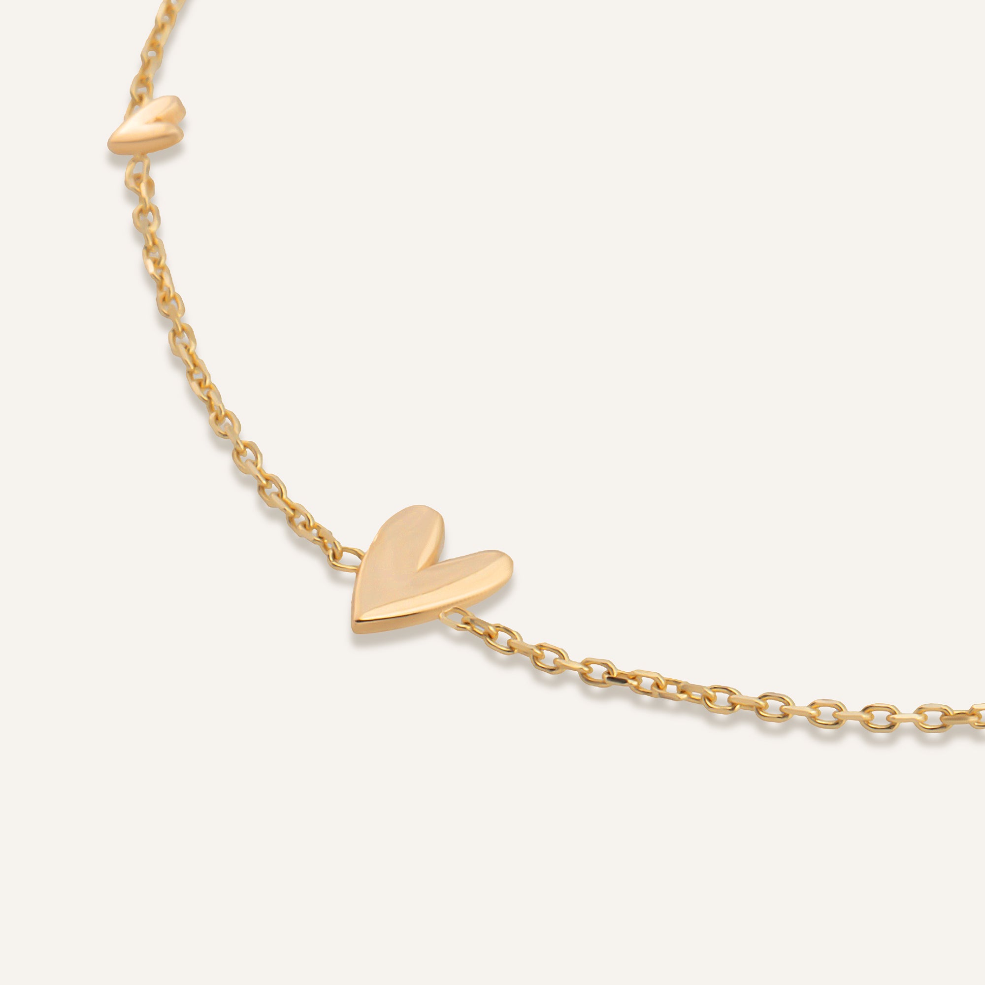 Kalbin ritmini zarif bir formda taşıyan Heartstring Bileklik, üç kalp figürünün sembolik anlamını 14 ayar altının sıcak ışıltısıyla birleştirir. Üç kalp; sevginin sürekliliğini, bağlılığı ve duygusal dengeyi temsil ederken, ince bileklik formu tasarıma modern ve sade bir duruş kazandırır. Parlak altın yüzey, ışığı yumuşak şekilde yansıtarak bileklik üzerinde dengeli bir akış oluşturur.