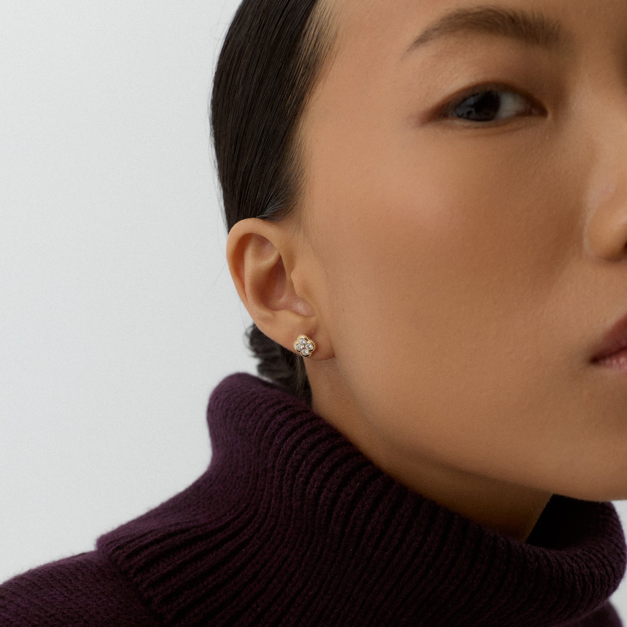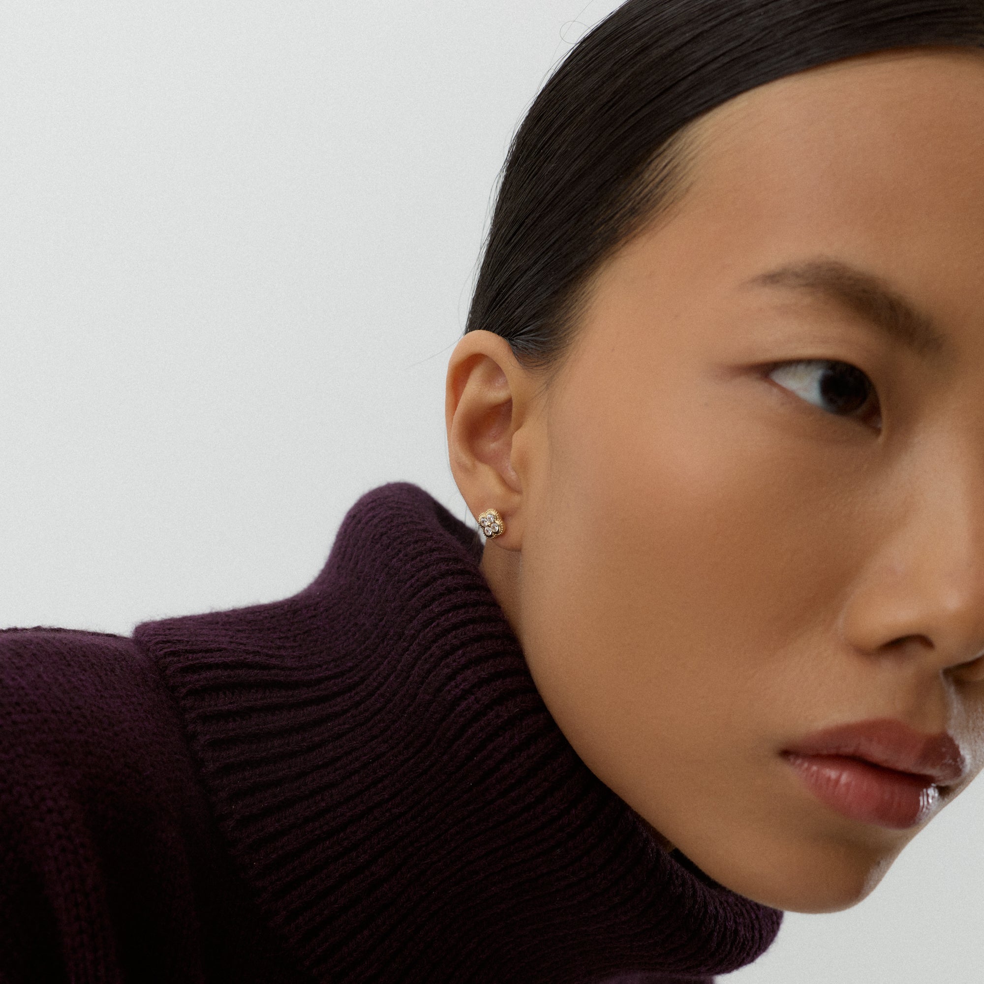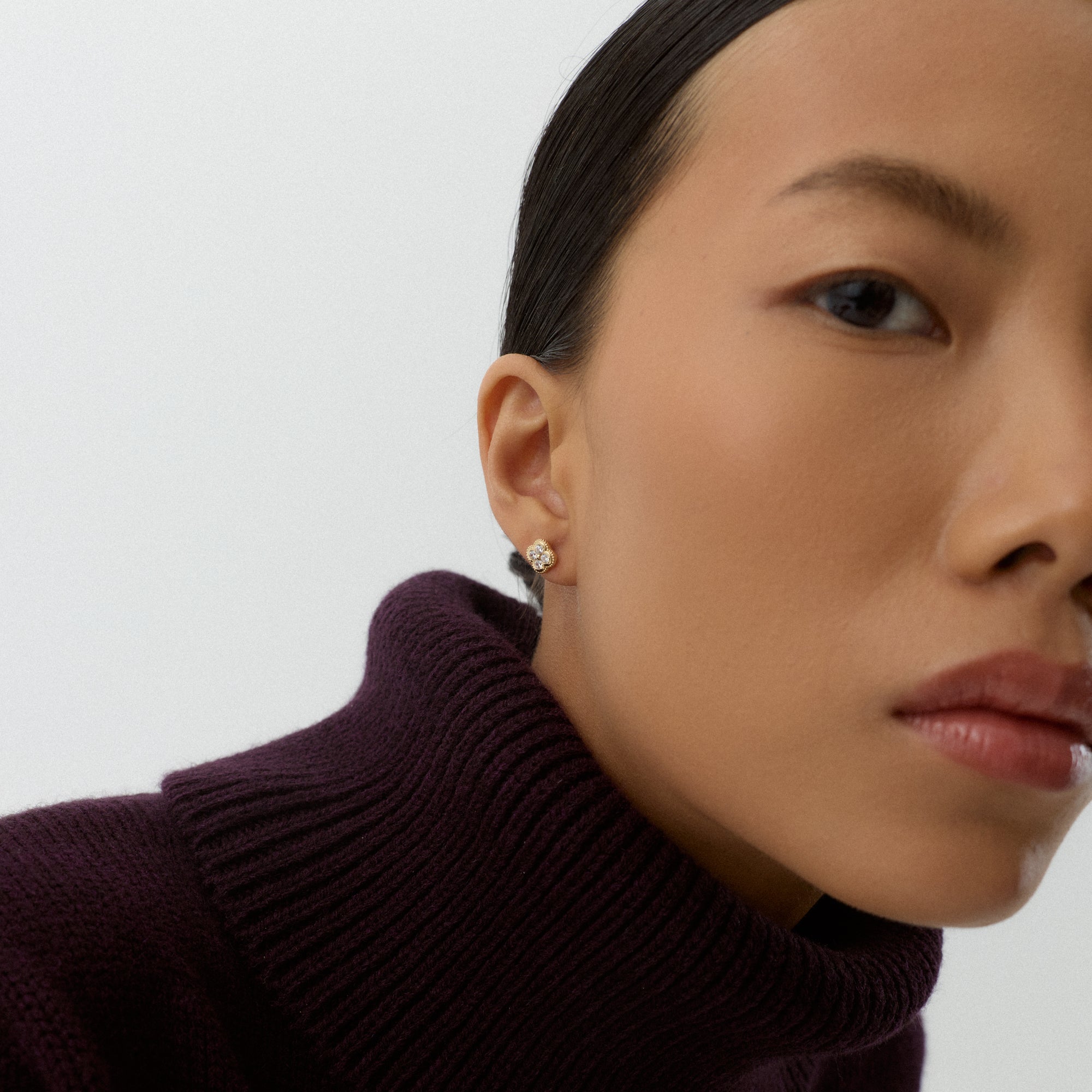 Spirra küpeleri, hareketin ışıltısını kulağa taşır. Çok taşlı yonca formu, her açıdan ışığı yakalayarak zarif bir enerji yayar. Altının sıcak dokusu, zirkon taşların parlaklığıyla birleşir. Her hareketle birlikte taşlar canlı bir ritim oluşturur. Spirra küpeleri, hem zarif hem enerjik bir duruşu temsil eder — modern kadının kendine güvenen tarzını yansıtır.