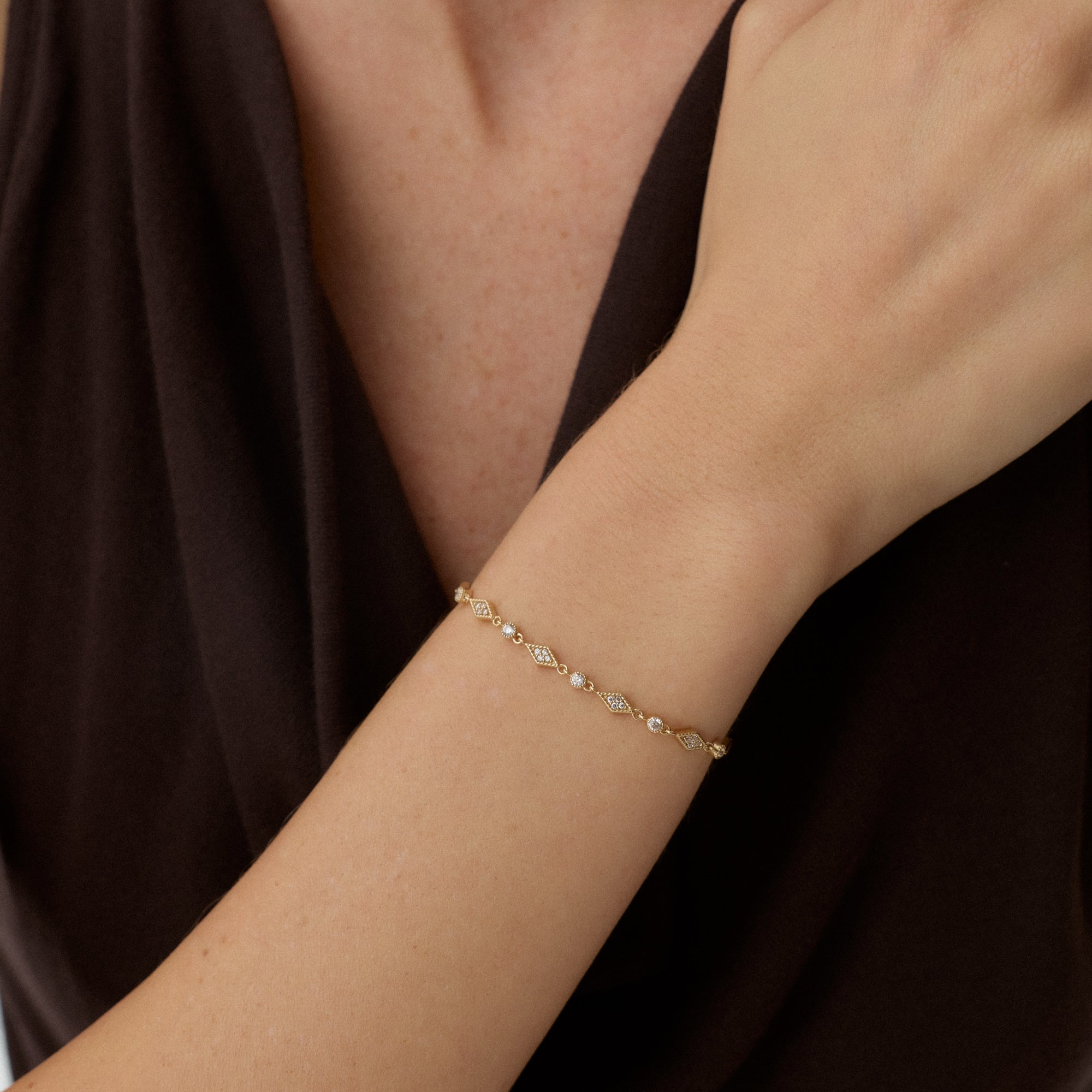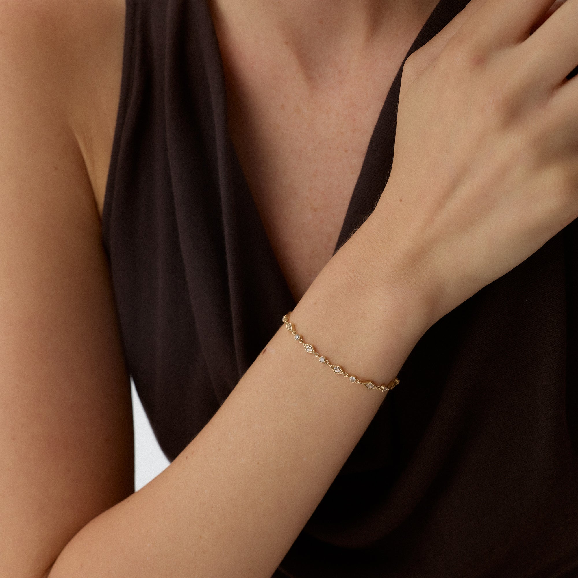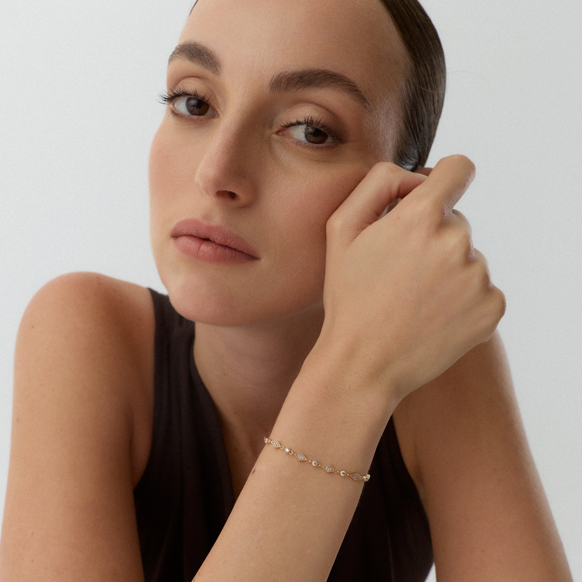 Lunelle Bileklik, ay ışığının zarafetini bileğin çevresinde nazik bir parıltıya dönüştürür. Altının sıcak dokusu, ışığın yumuşak akışını zarif bir biçimde yansıtır. İnce formu, sadeliğin içinde güçlü bir duruş sergiler. Gün boyu fark edilmeden parlayan bu tasarım, gece ışığında sofistike bir ışıltıya dönüşür. Lunelle Bileklik, modern kadın için minimalizmin en zarif halidir.