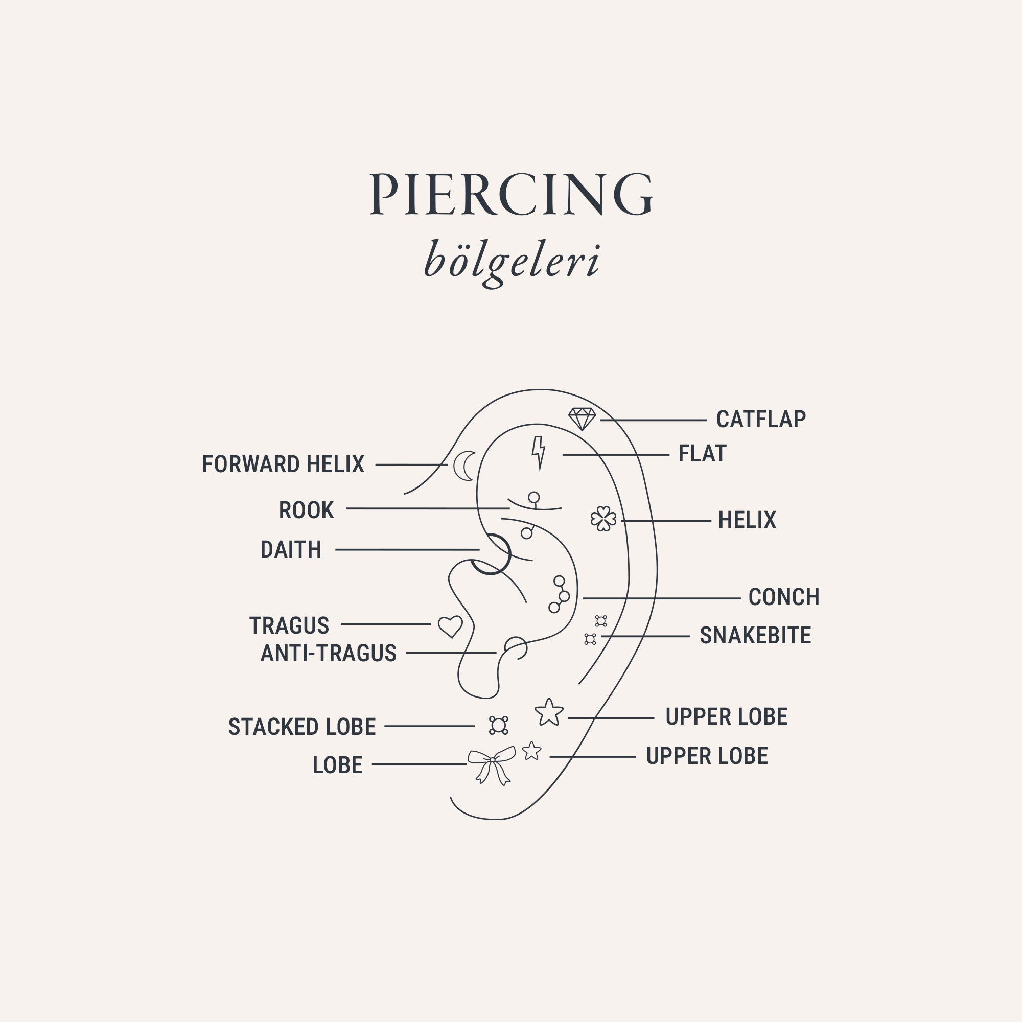 Altın kulak piercing seçenekleri her bölge için farklı özelliklere sahiptir. Helix kulağın üst kenarındaki kıkırdak bölgesidir ve halka modeller için idealdir. Conch, kulağın iç kısmındaki geniş düz alanı ifade eder ve büyük tasarımlar için uygundur. Rook ise kulağın üst iç kısmında bulunan kıkırdak katlanmasıdır.