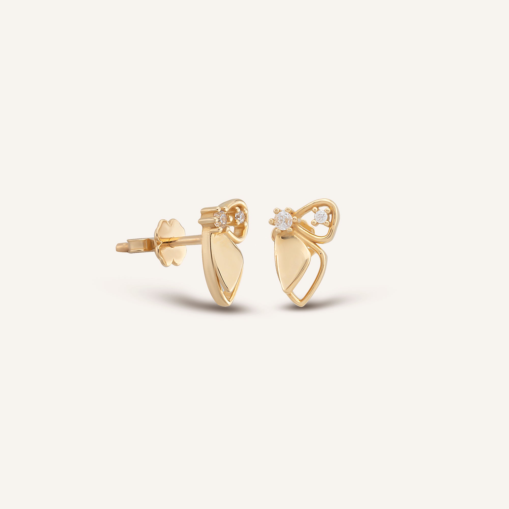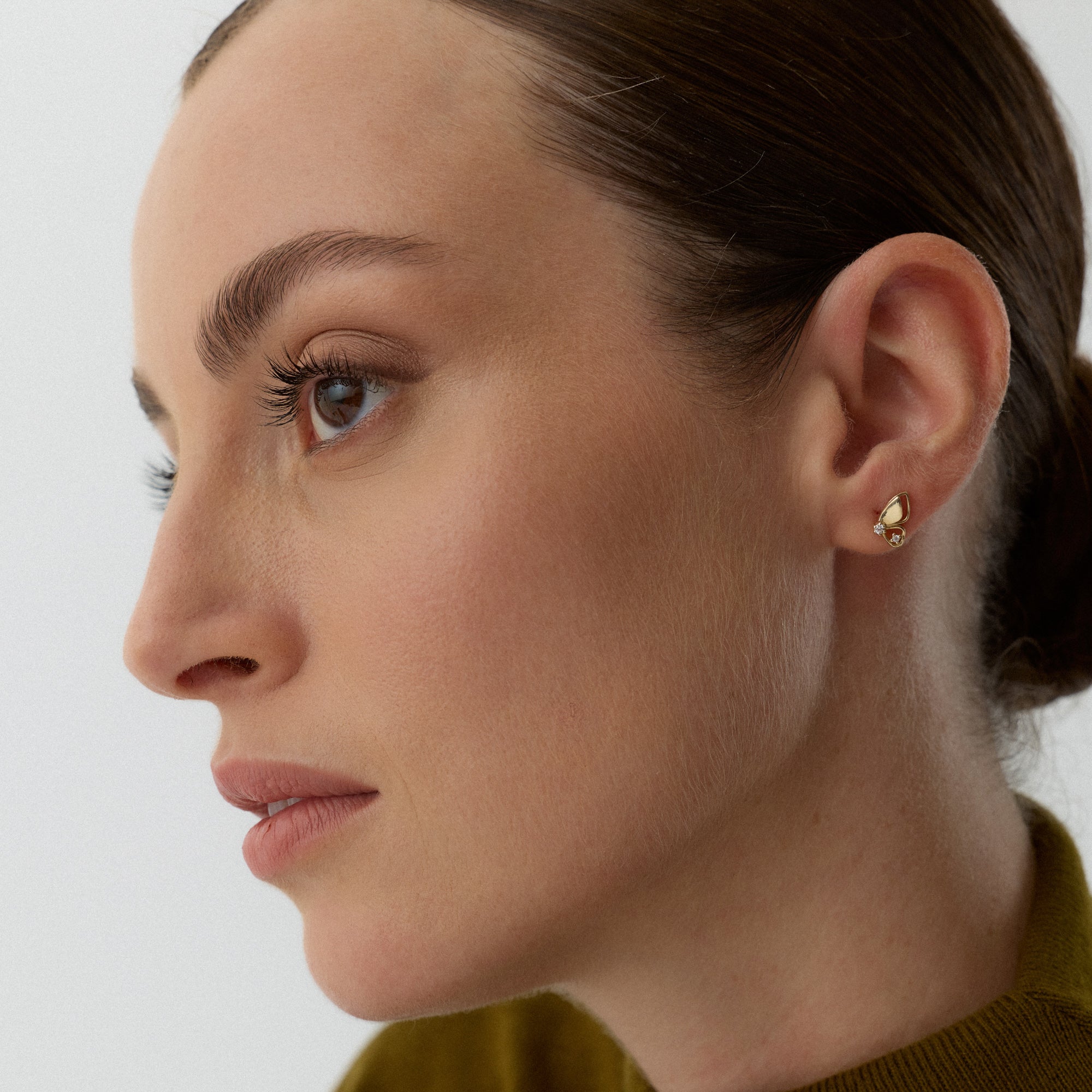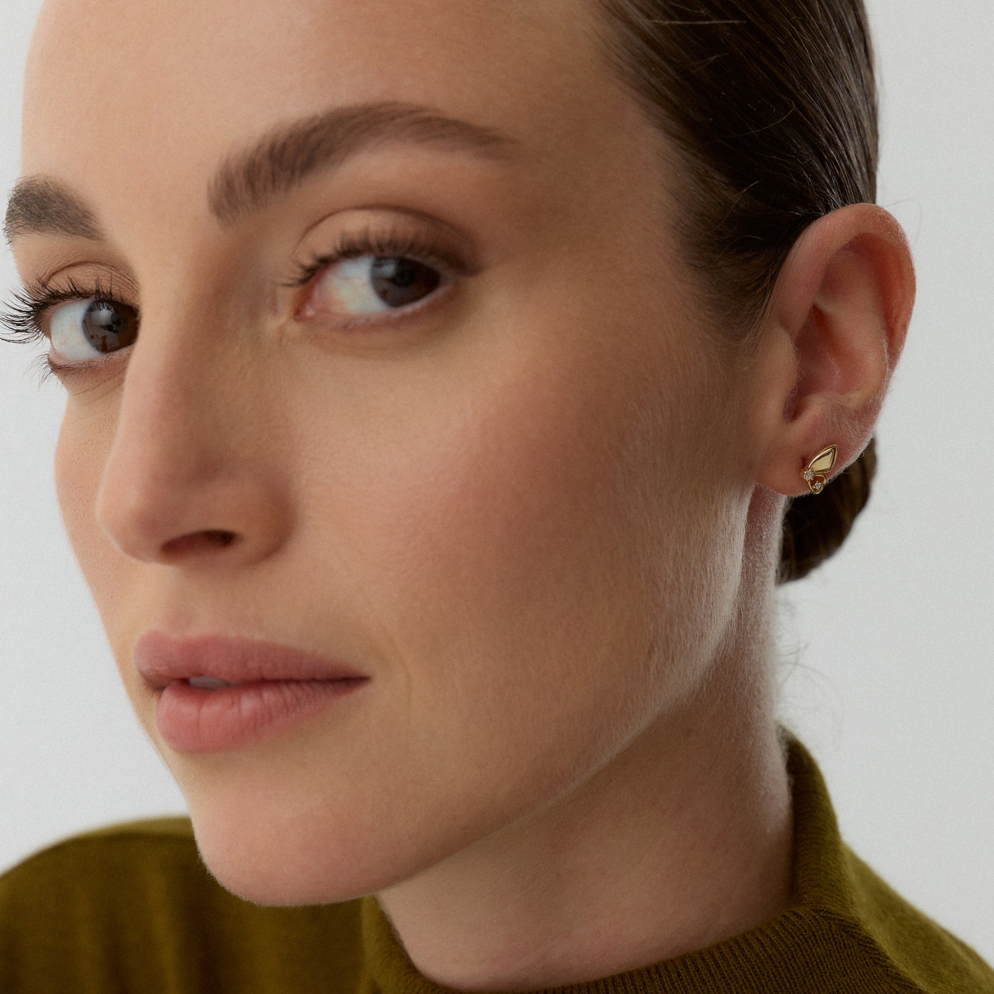 Emeris küpeleri, kelebek kanatlarının zarif hareketini taşınabilir bir sanat formuna dönüştürür. İnce altın hatlar, taşların etrafında narin bir ritimle kıvrılır. Her harekette kanat çırpışı gibi bir ışık oyunu oluşur. Doğadan ilham alan bu zarif form, kulağa sadece bir aksesuar değil, özgürlüğün sesi gibi dokunur. Emeris küpeleri, her kadınla birlikte yeniden doğar.