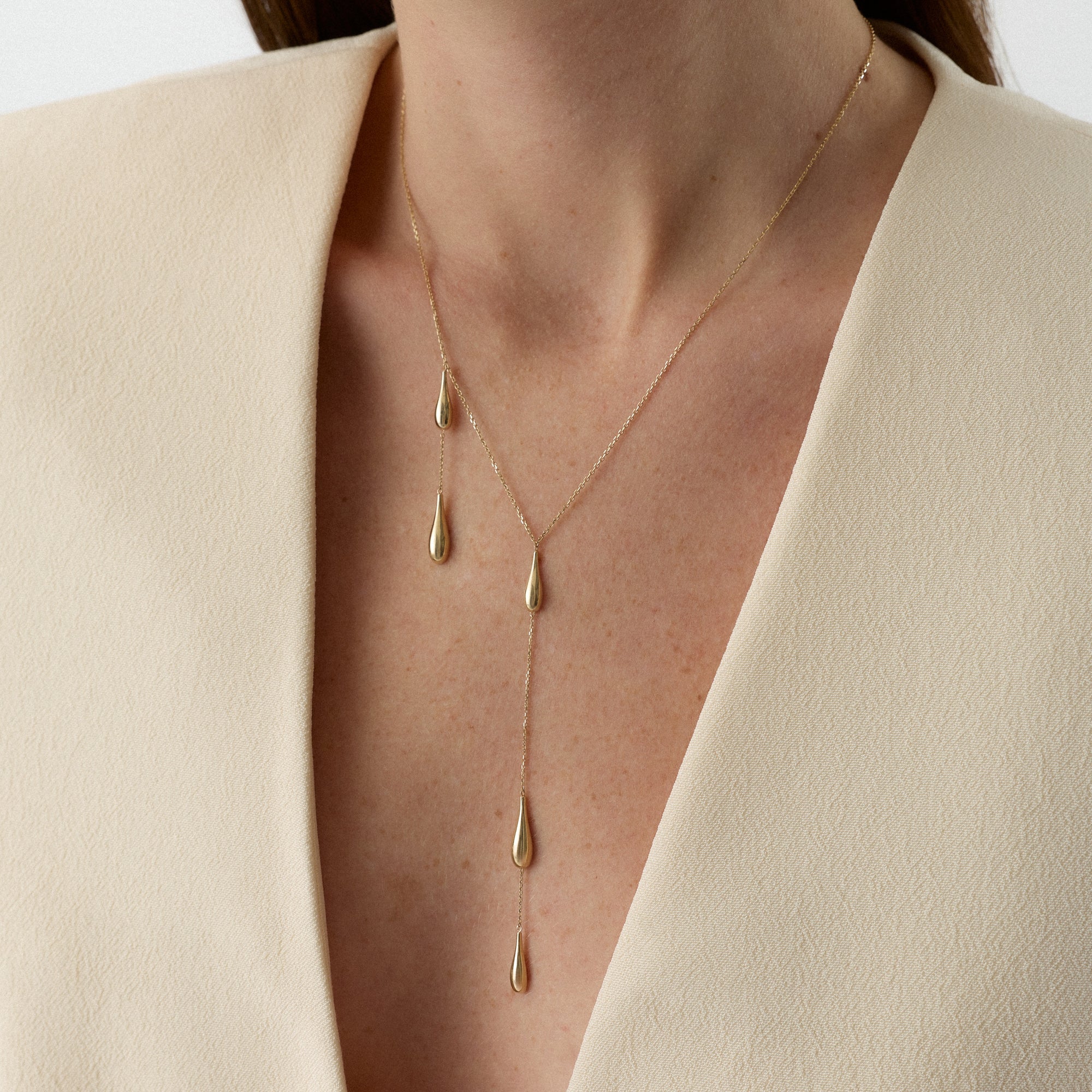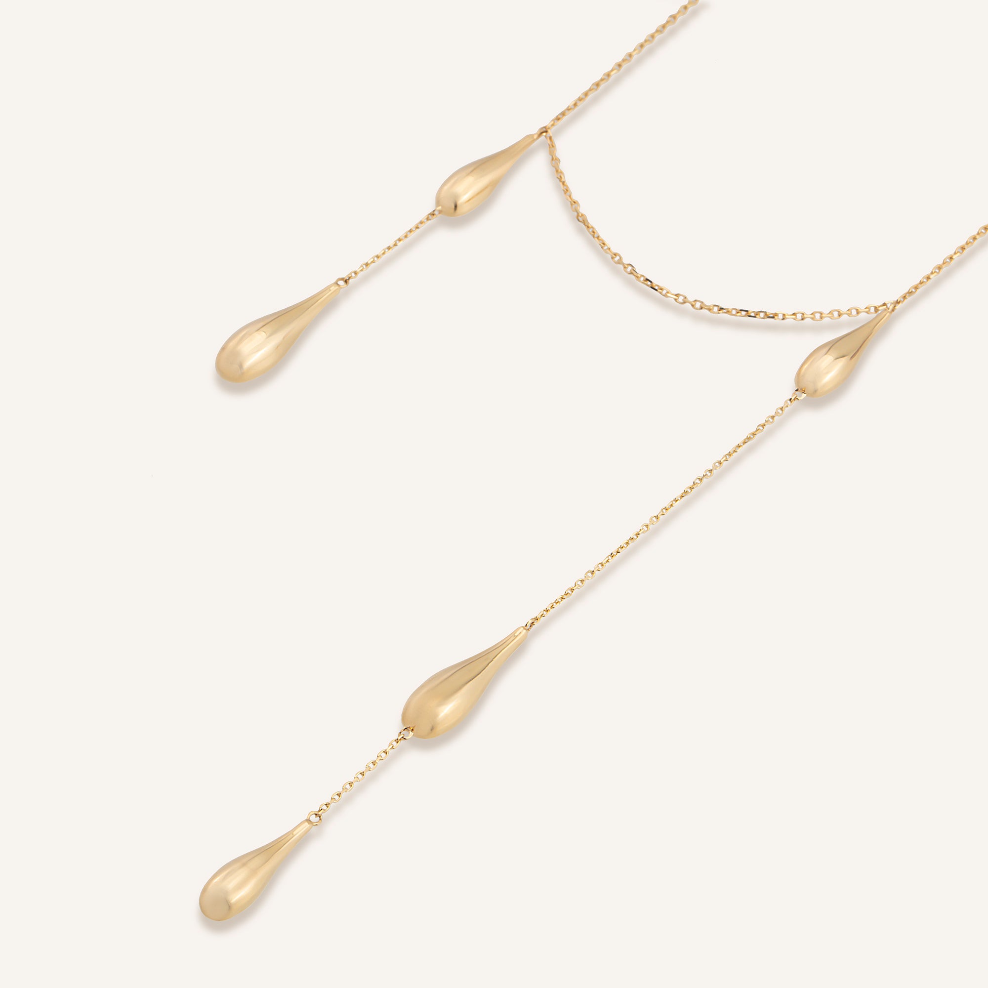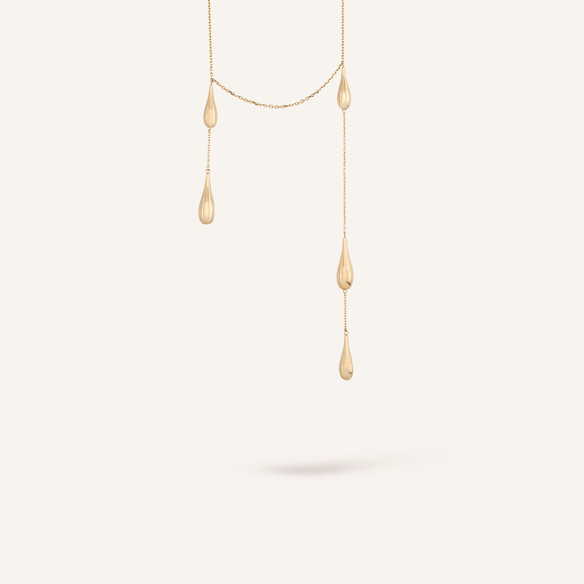 Pluvia kolyesi, boyunda süzülen bir yağmur damlası gibi zarif bir hareket yaratır. Asimetrik dizaynı, doğadaki rastgele mükemmelliği yansıtır. Damla taşlı merkez, ışığın ritmini taşır. Kolye, dinginliğin ve zarafetin birleşimidir.