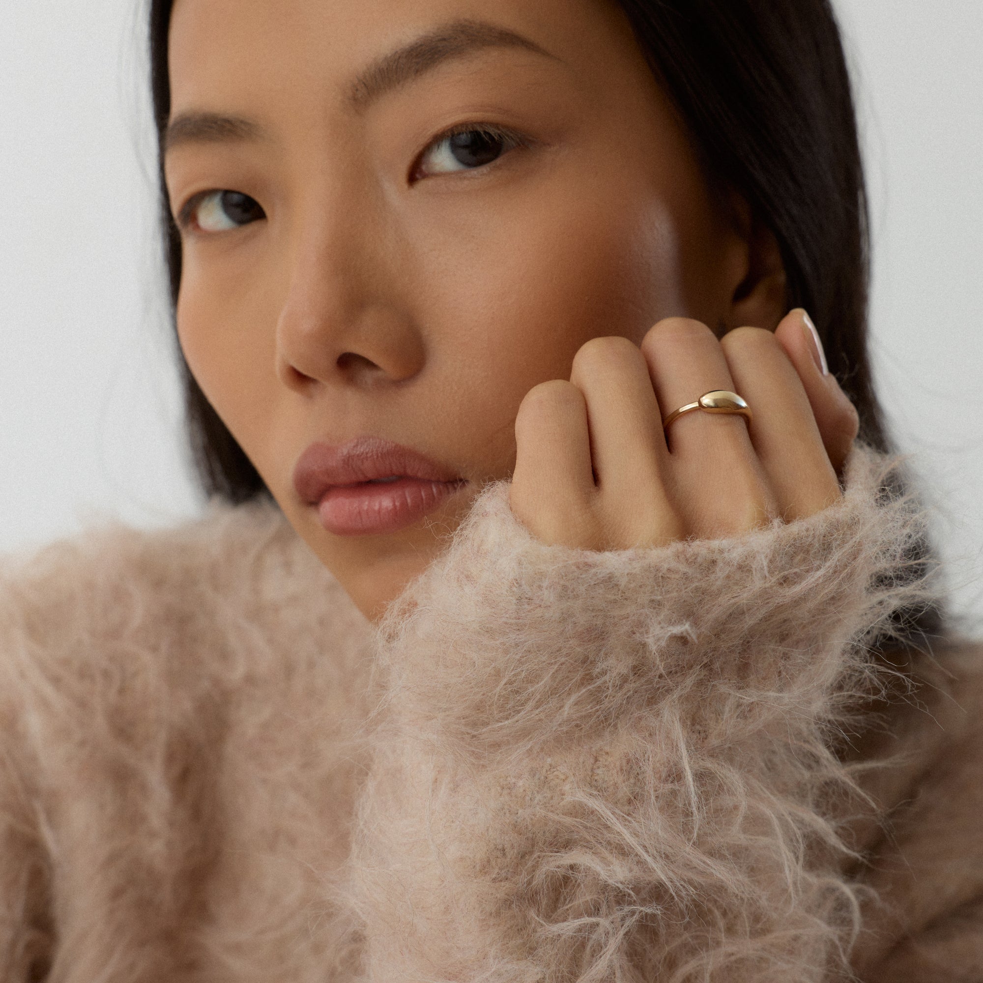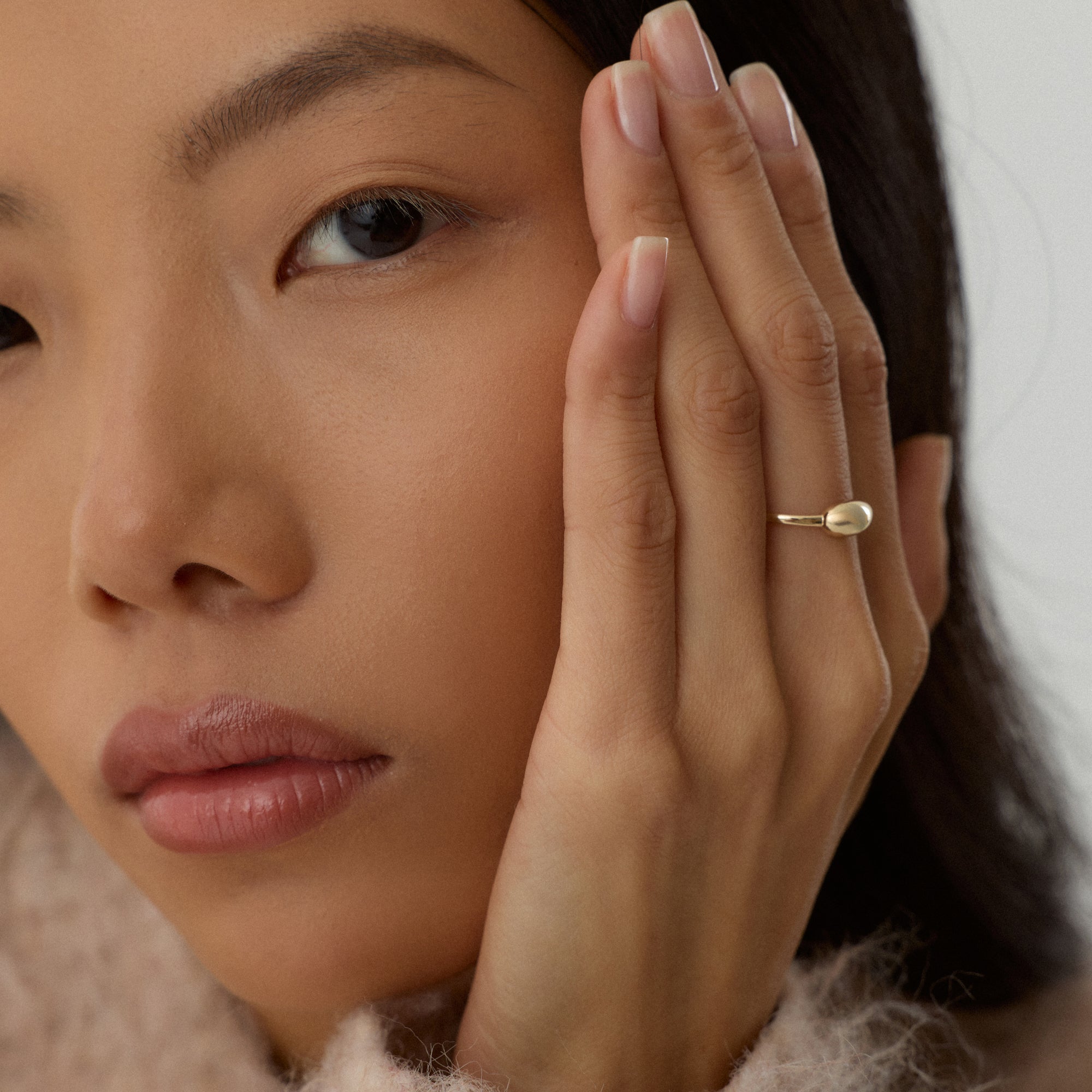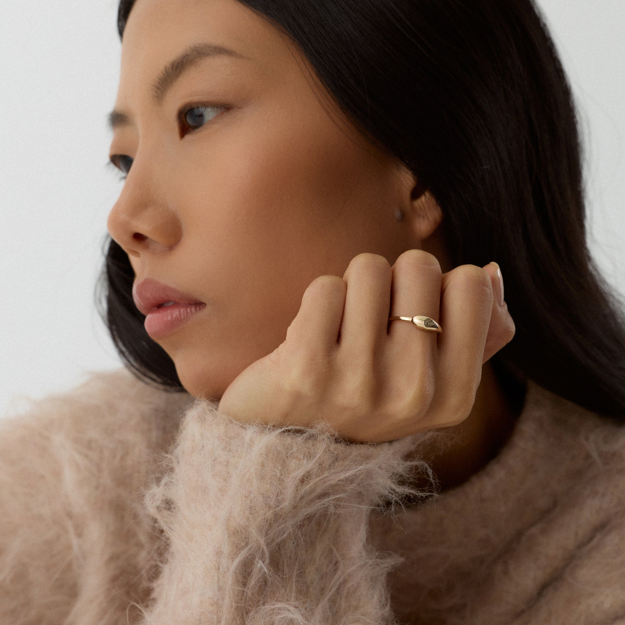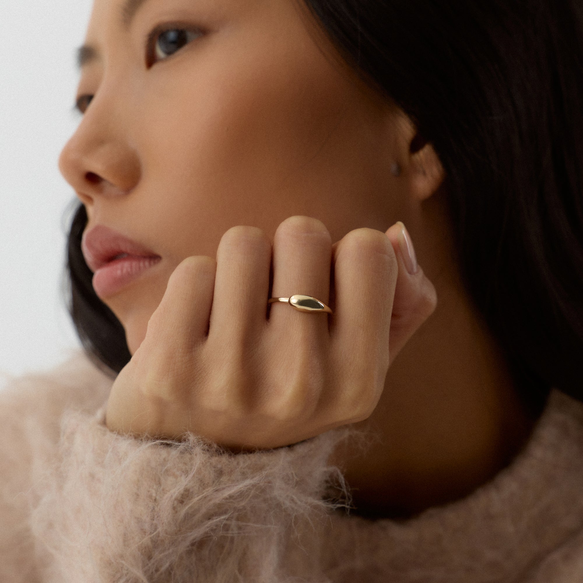 Pluvia yüzüğü, damla formunun zarafetini merkezine alan bir tasarımdır. Taşın parlak yüzeyi, suyun berraklığını yansıtır. Altın çerçeve, bu doğallığı sıcak bir dokuyla dengeler. Her parıltı, doğanın yenilenme enerjisini taşır.