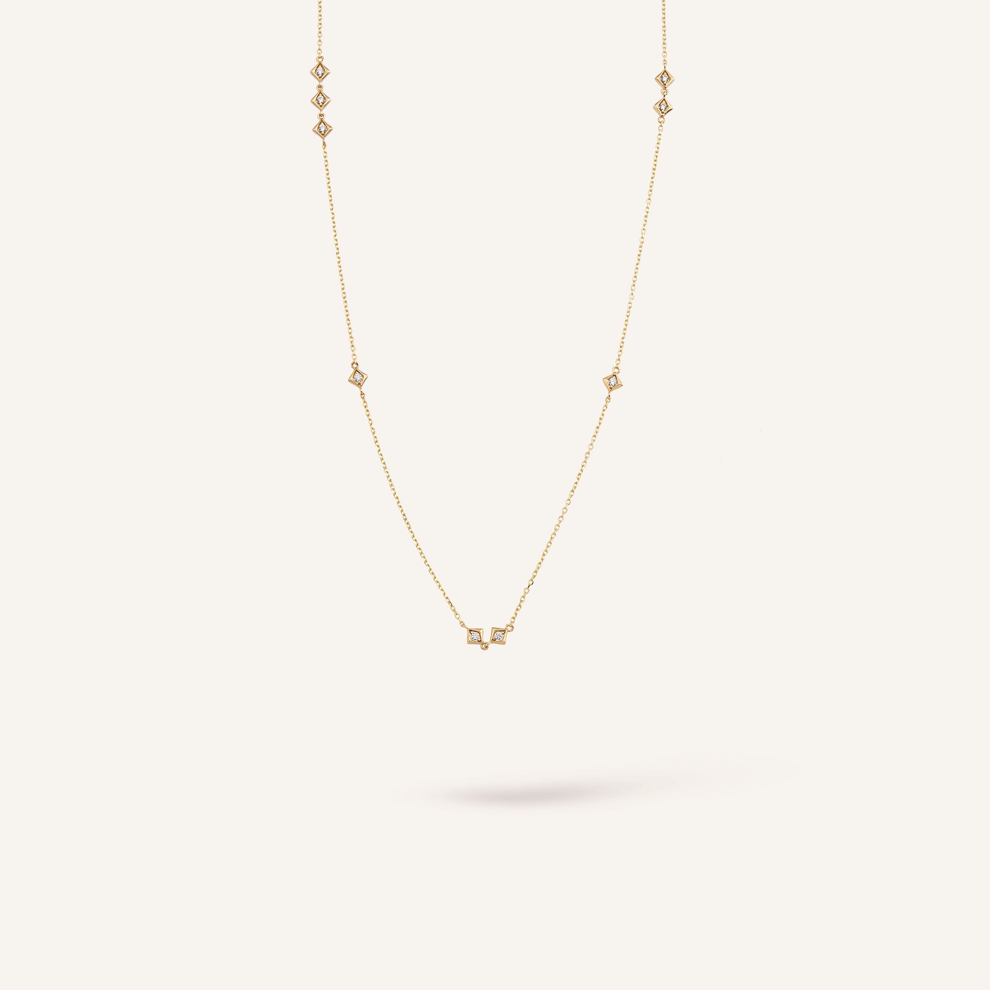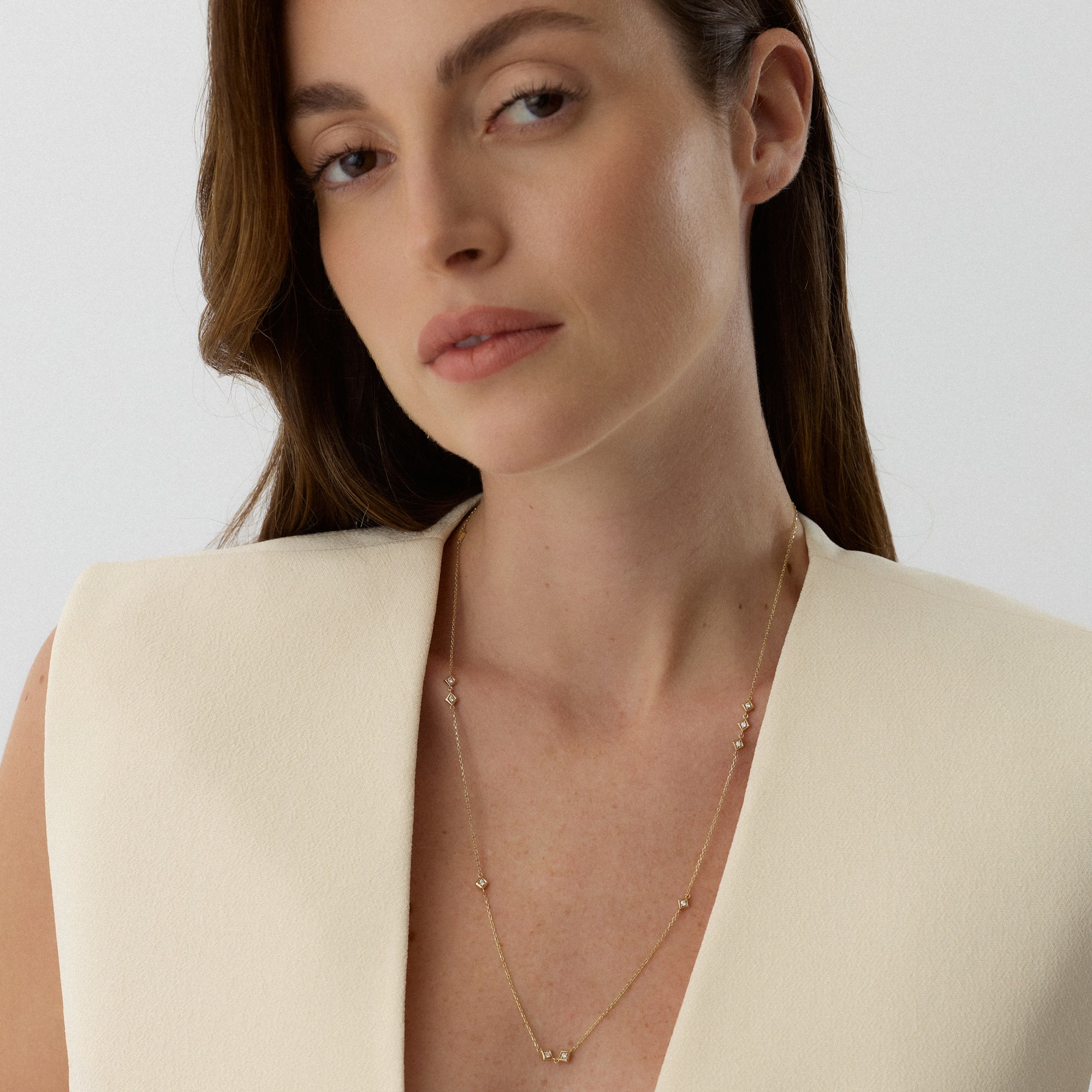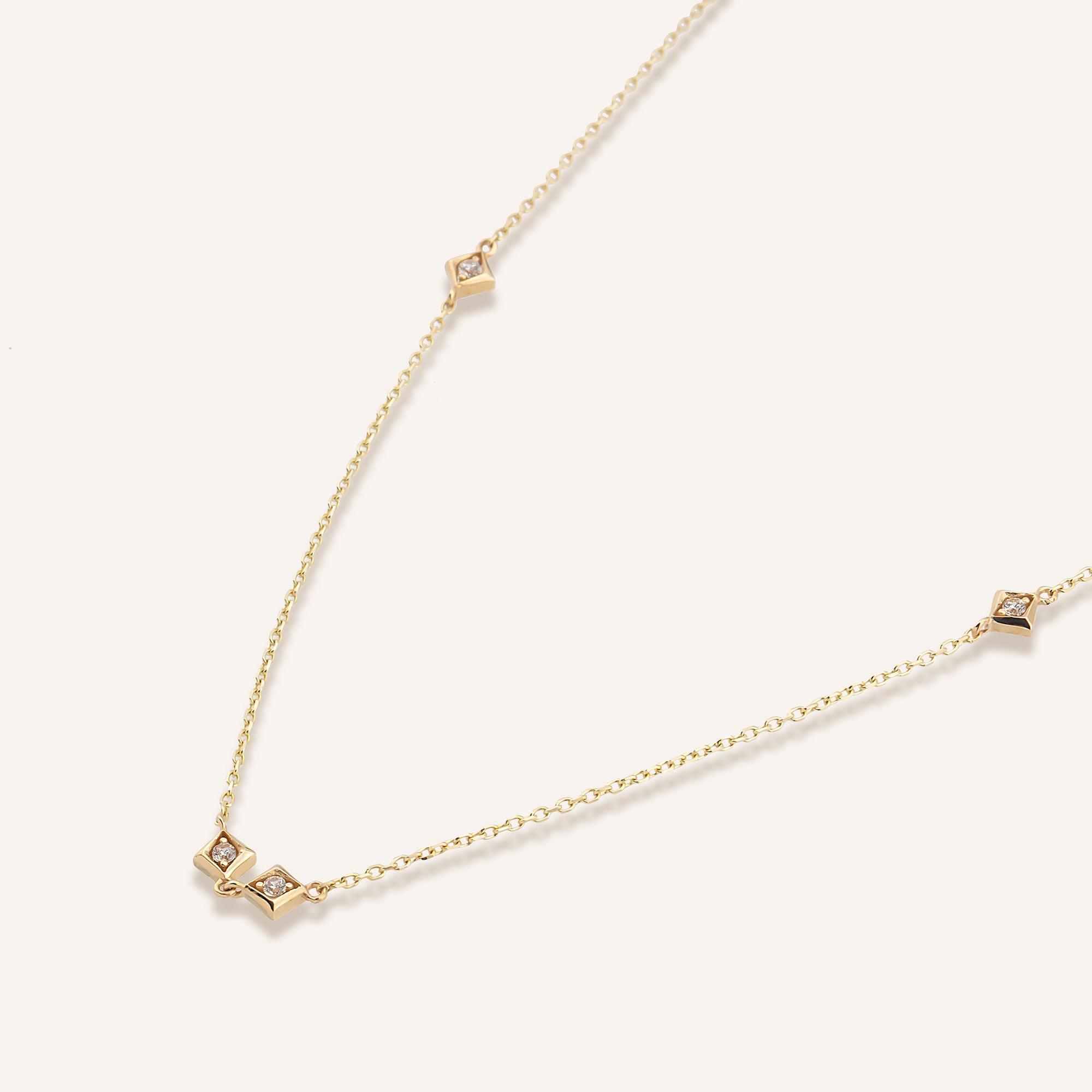 Angula kolyesi, boyun hattında kare formun net çizgilerini zarif bir akışla taşır. Taşın ışığı, her hareketle farklı bir parıltıya dönüşür. Altın zincir, bu enerjiyi dengeli bir zarafetle sarar. Kolye, modern çizgilerin zarif bir ifadesidir.