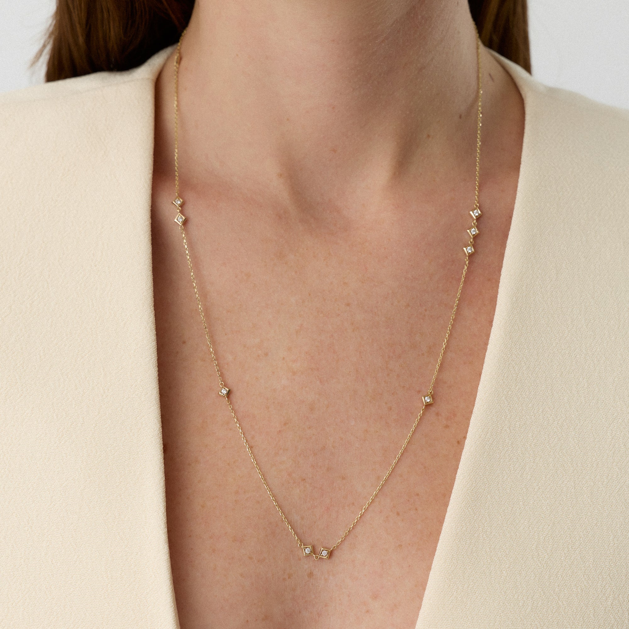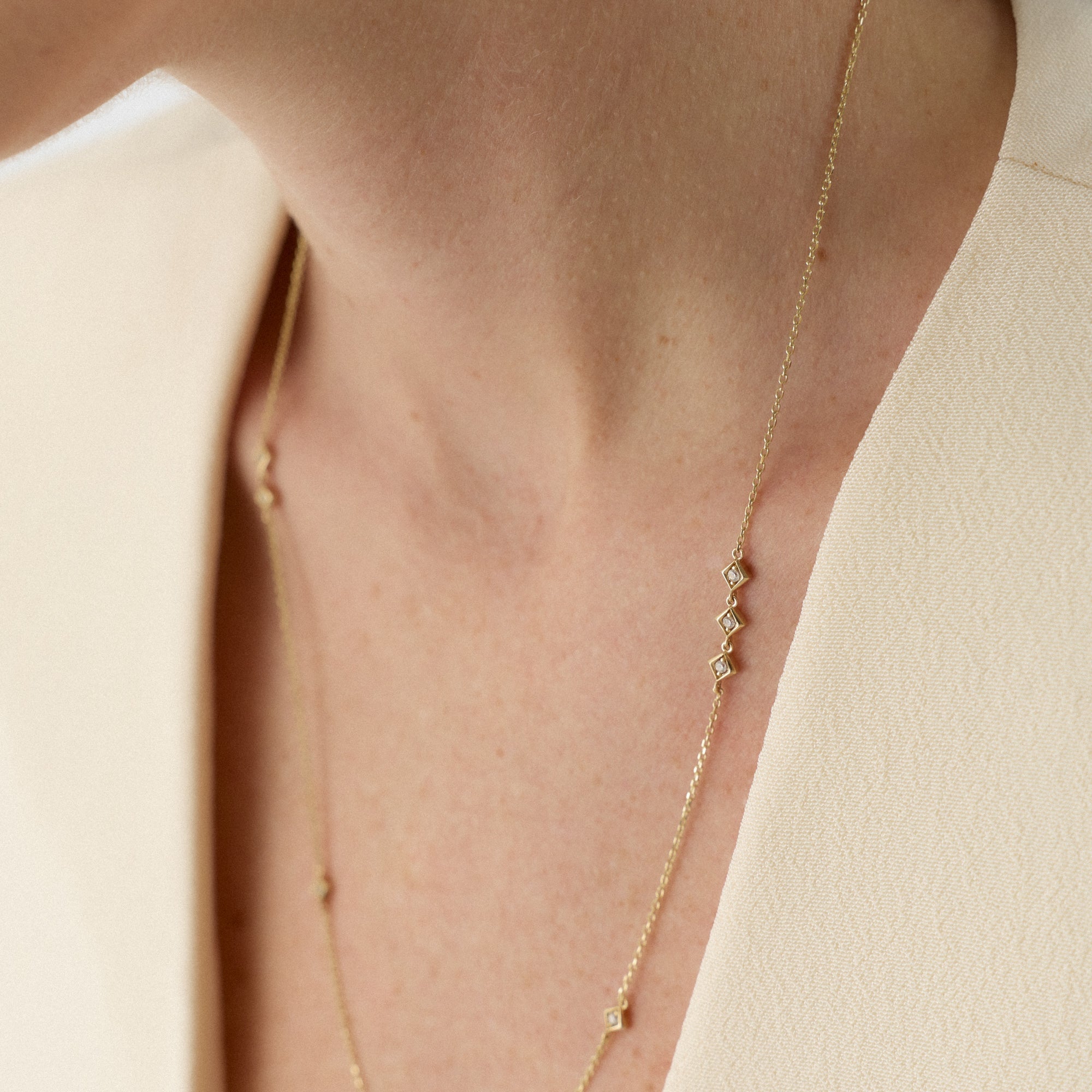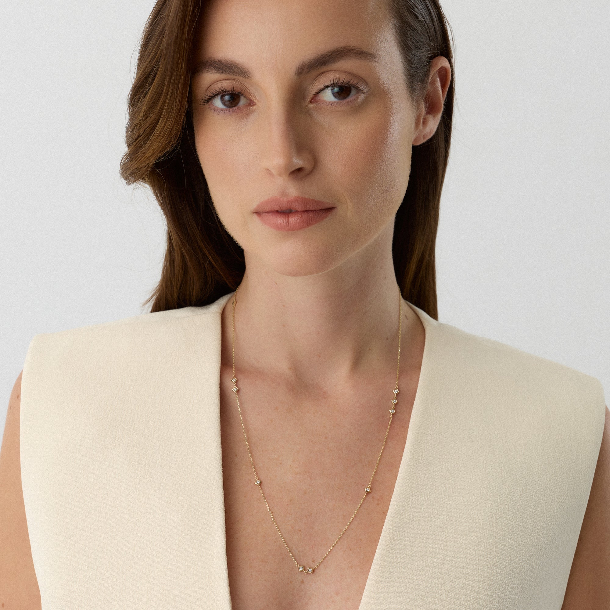 Angula kolyesi, boyun hattında kare formun net çizgilerini zarif bir akışla taşır. Taşın ışığı, her hareketle farklı bir parıltıya dönüşür. Altın zincir, bu enerjiyi dengeli bir zarafetle sarar. Kolye, modern çizgilerin zarif bir ifadesidir.