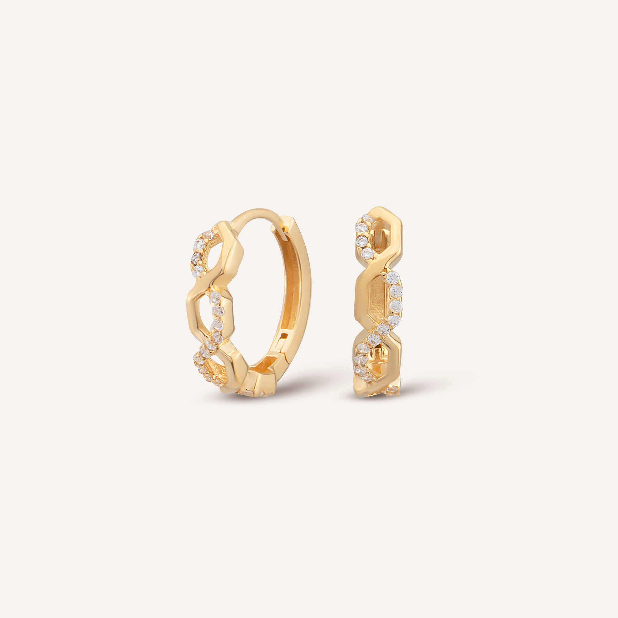 Zincir dokusunun modern enerjisini sıra taşların ritmik ışıltısıyla birleştiren AJA Ravena Zigzag Figürlü Halka Klips Küpe, 14 ayar altının parlak tonlarına dinamik bir karakter kazandırıyor. Zigzag taş diziliminin hareketli yapısı, zincir figürünün güçlü dokusuyla birleşerek tasarıma çok katmanlı bir derinlik katıyor. Halka formu ışığı farklı açılarda yansıtarak dikkat çekici bir canlılık oluştururken, klips mekanizması konforlu ve güvenli bir kullanım sunuyor.