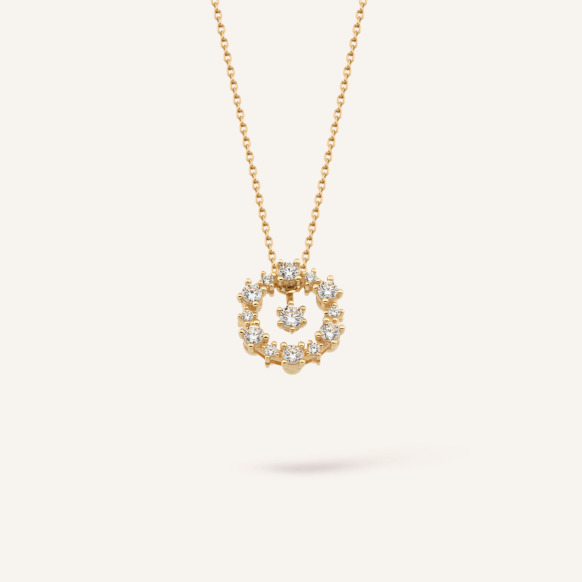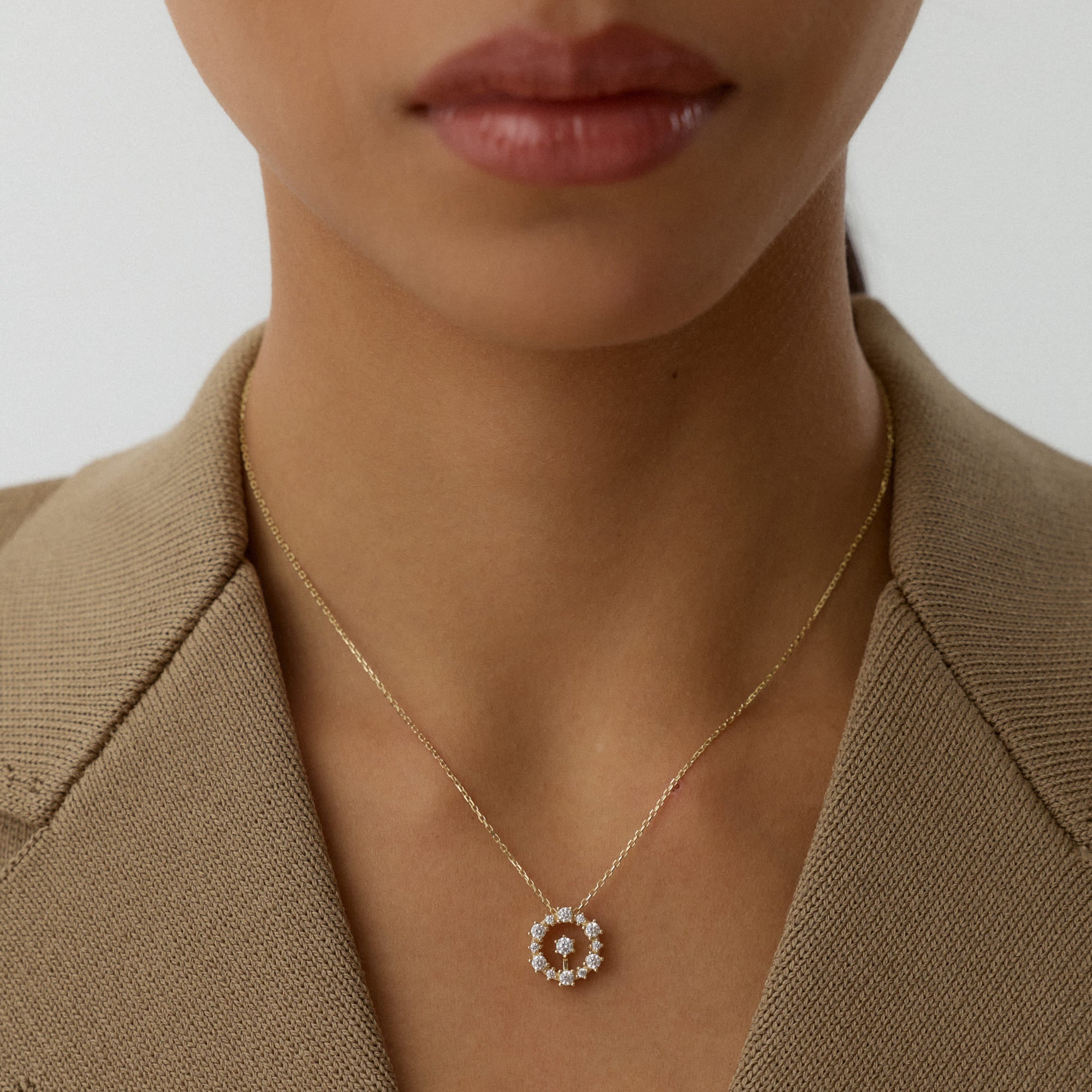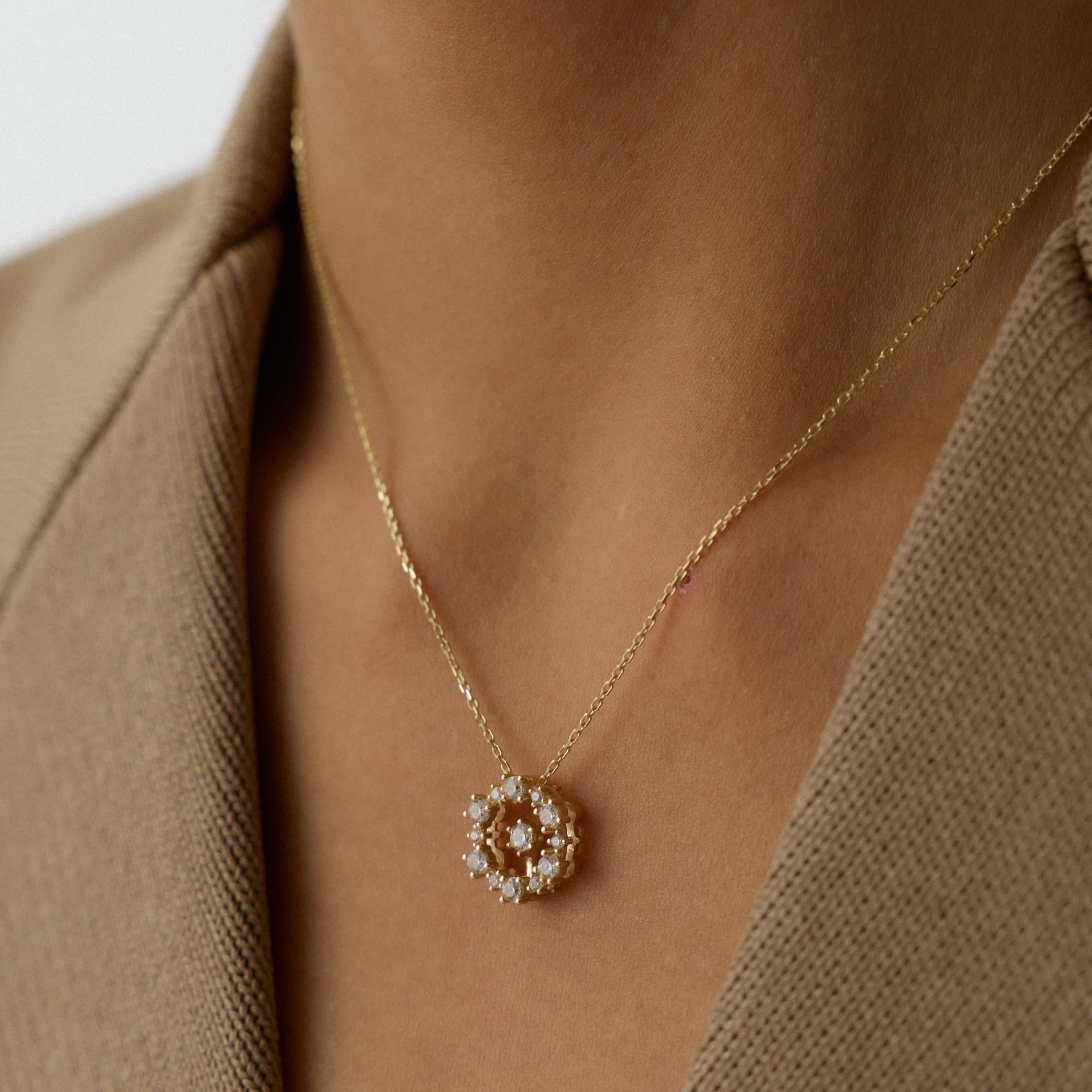 Revola kolyesi, zarafetin sürekli yenilenen enerjisini boyunda taşır. Merkezdeki taşlı yonca figürü, ışığın yönüne göre farklı parıltılar yaratır. Zincir boyunca süzülen altın detaylar, tasarıma canlı bir hareket kazandırır. Revola kolyesi, şansı ve zarafeti bir araya getiren modern bir semboldür.