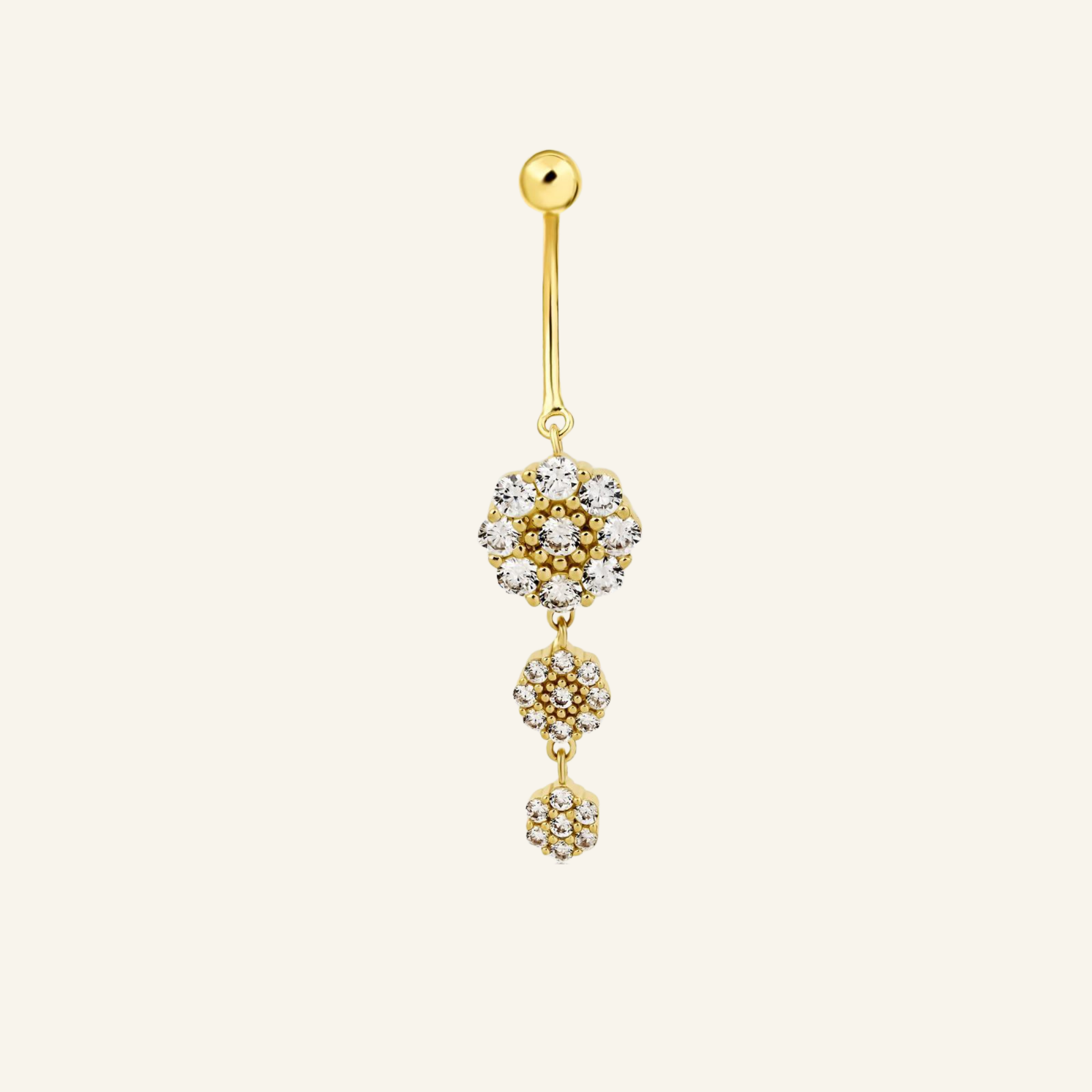 Rosette Flow Çiçek Motifli Yuvarlak Kesim Taşlı Sallantılı Altın Göbek Piercing