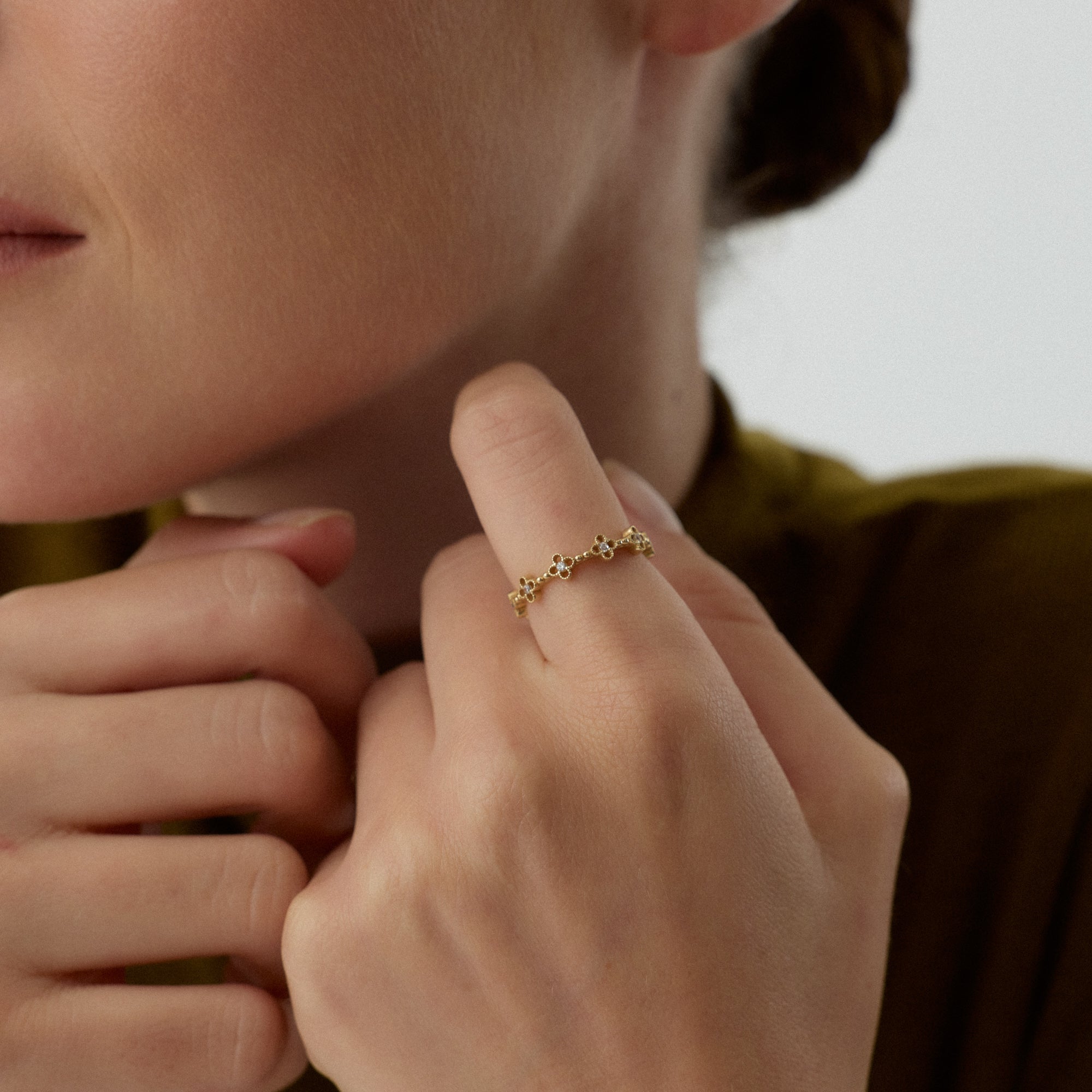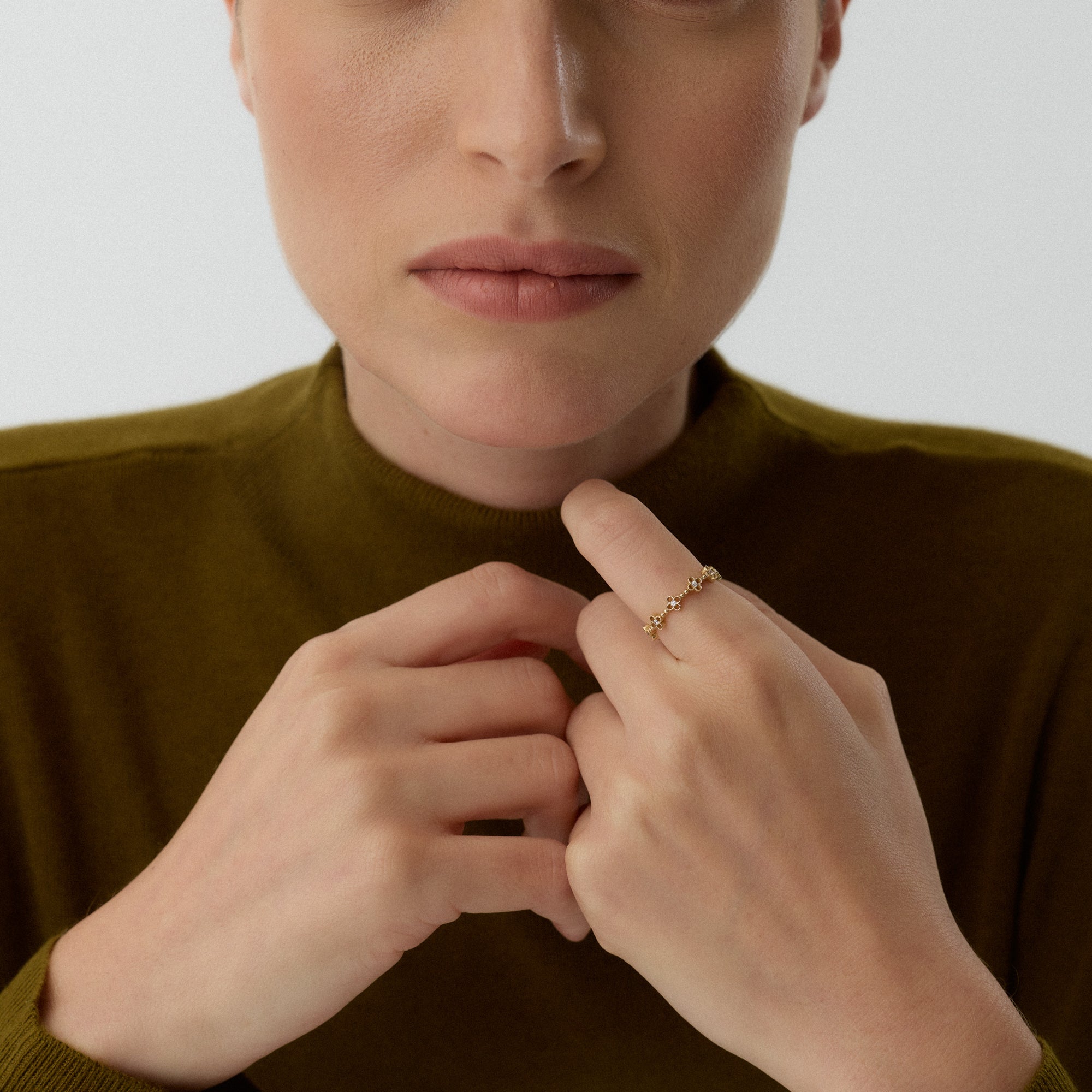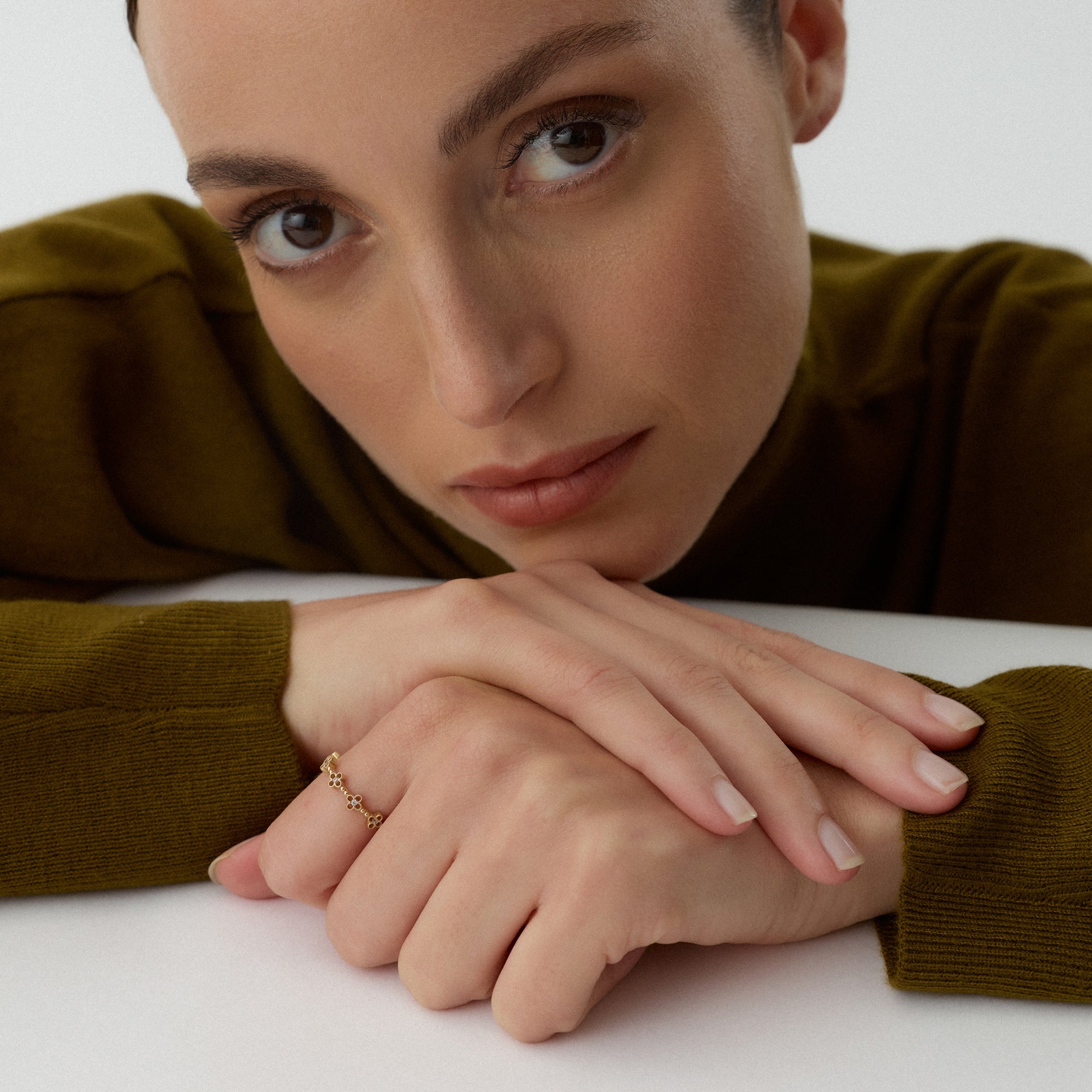 Sirelle Yüzük, zarafetin en yalın hâlidir. Altının sıcak parıltısı, sade formun üzerinde huzurlu bir denge yaratır. Işığın her yönünden yumuşak bir parlaklık hissedilir. Feminen ama güçlü bir enerji taşır. Sirelle Yüzük, günlük zarafeti kolaylıkla taşıyan modern bir klasik olarak tasarlandı. Sessiz bir şıklığın simgesidir.