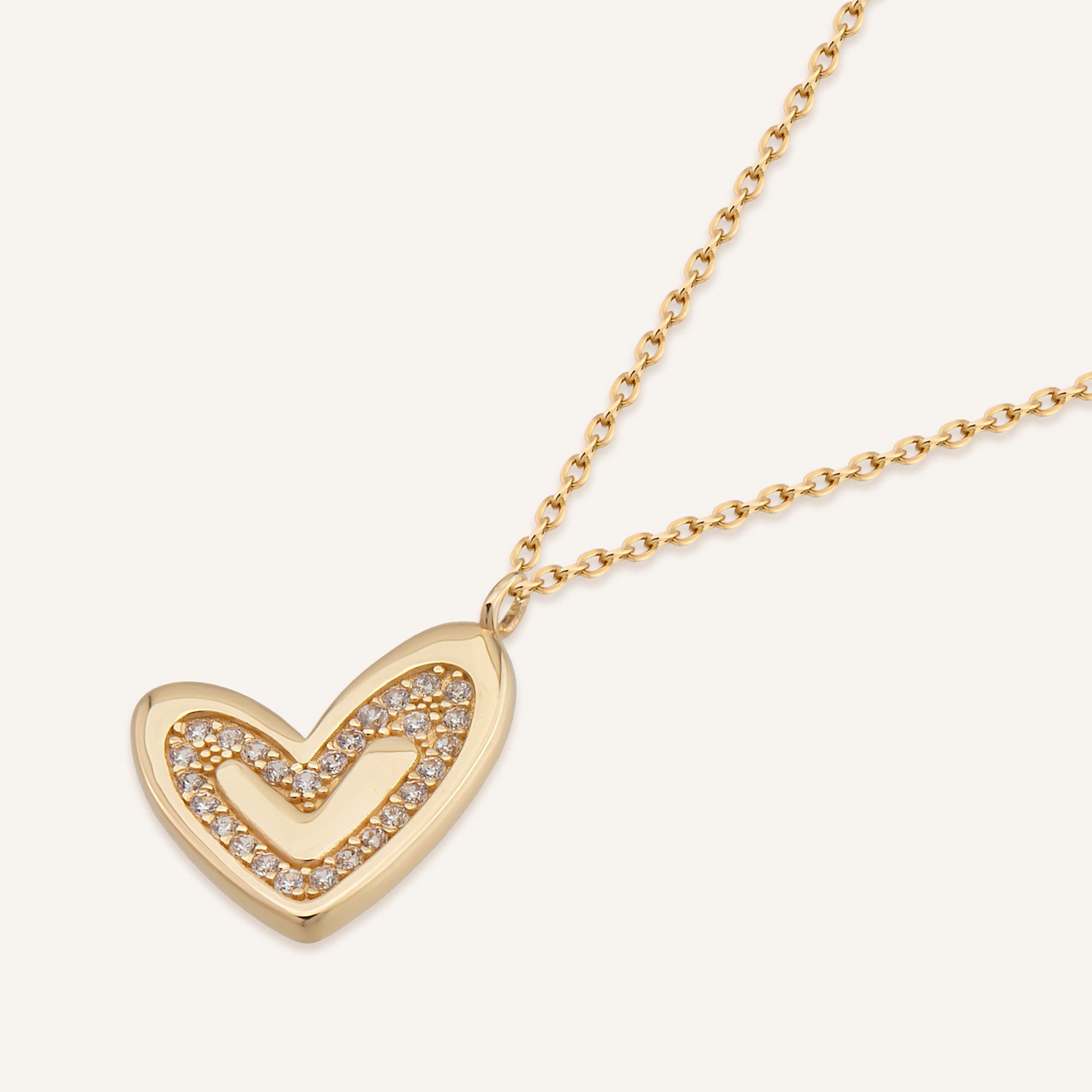 Soft Love Kolye, asimetrik ve çapraz duran kalp formu ile klasik kalp sembolüne modern bir hareket kazandırır. Yuvarlak kesim beyaz taşların kalp şeklinde dizilimi, duyguyu parlak ama ölçülü bir ışıltıyla anlatır. Zincirin sağ üst köşeden bağlanması, kolyeye dinamik bir duruş verir; iç içe iki taşsız kalp ve bir taşlı kalp formu ise katmanlı bir anlam yaratır.