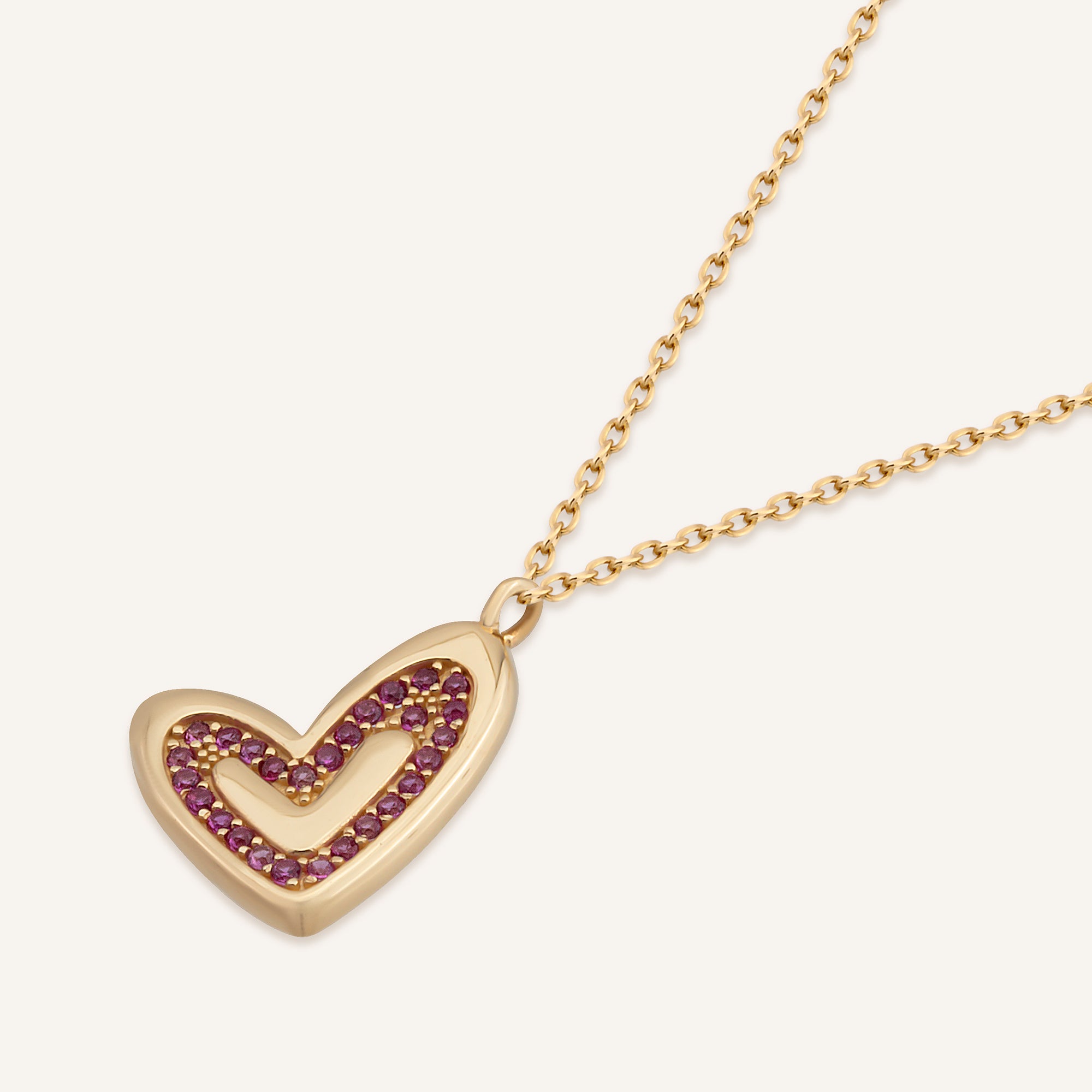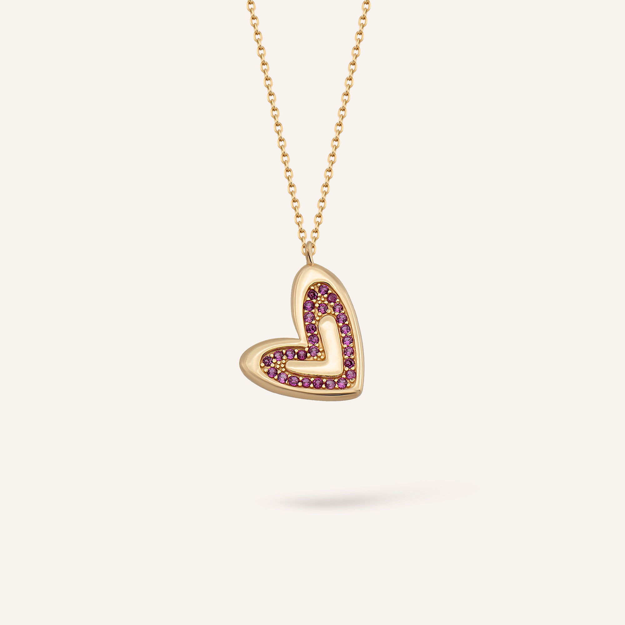Ametist tonundaki taş dizilimiyle Soft Love Ruby Kolye, kalp sembolünü modern ve duygusal bir çizgide taşır. 14 ayar altından üretilen bu parça, anlam yüklü bir hediye alternatifi sunar.