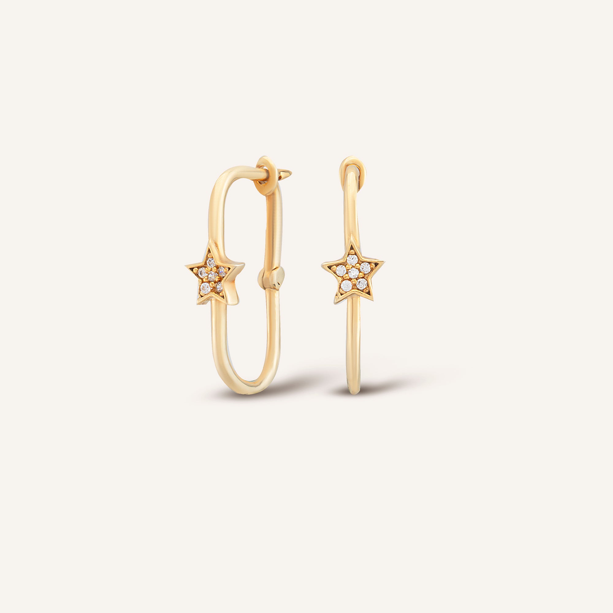 Yıldız figürünün parlak enerjisini çok taşlı dizilimin yoğun ışıltısıyla bir araya getiren AJA Starcella Yıldız Figürlü Taşlı Küpe, 14 ayar altının sıcak tonlarına göksel bir parıltı katıyor. Yıldız detayları ışığı her açıdan yakalayarak tasarıma hareketli bir derinlik kazandırırken çok taşlı yapı güçlü bir parlaklık sunuyor. İğneli form, küpenin zarif siluetini tamamlayarak modern bir duruş oluşturuyor.