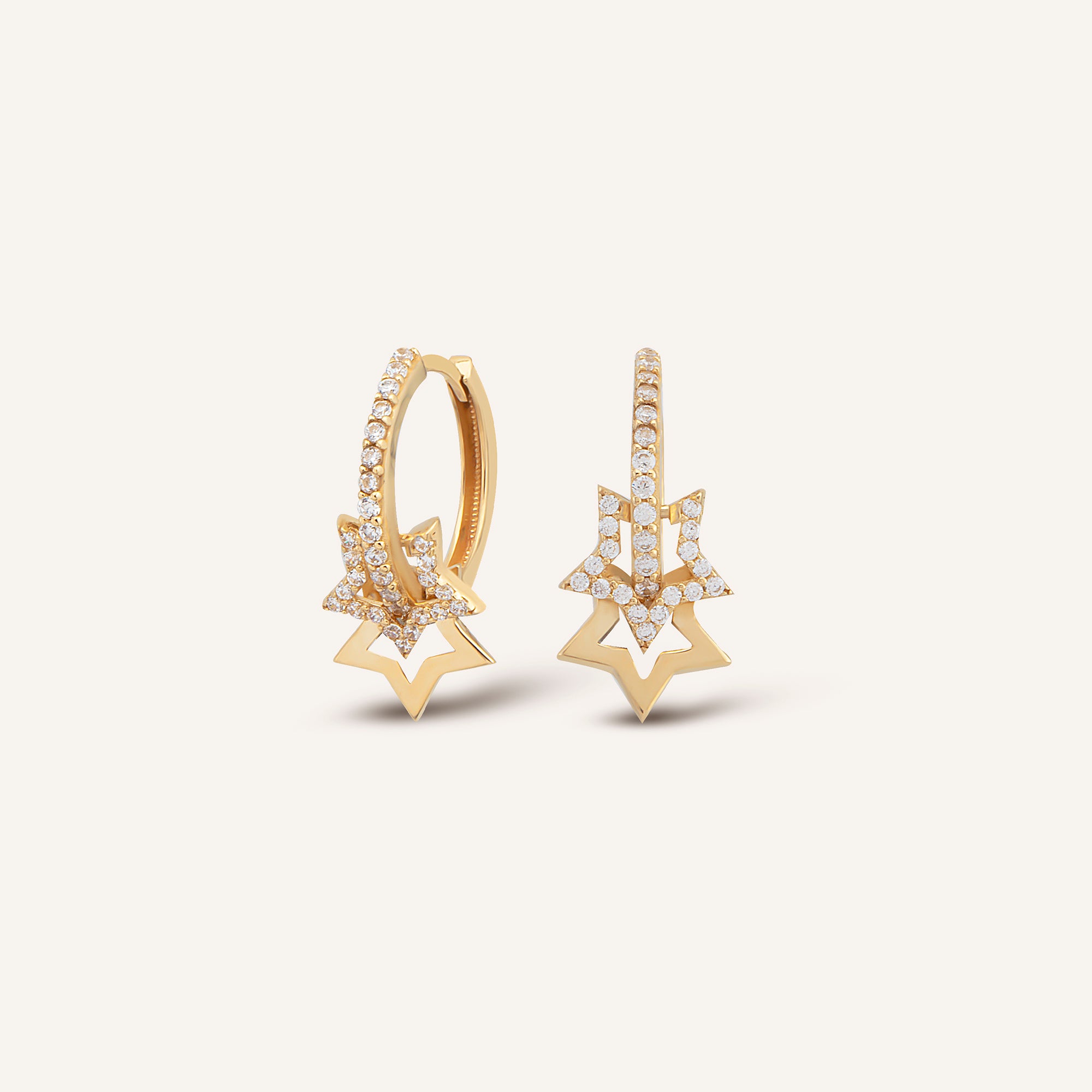 Göksel ışığı ve zarafeti modern bir formda bir araya getiren AJA Stellara Çift Yıldız Figürlü Çok Taşlı Halka Klips Küpe, 14 ayar altının sıcak ışıltısını çift yıldız figürünün sembolik anlamıyla buluşturuyor. Yıldızların çok taşlı parlaklığı halkanın akıcı silueti üzerinde çoğalarak, her hareketle farklı bir ışık yansıması oluşturur. Güvenli klips yapısı günlük kullanımda konfor sağlarken, yıldız formlarının ritmik dizilimi tasarıma hem dinamizm hem de seçkin bir zarafet katar.