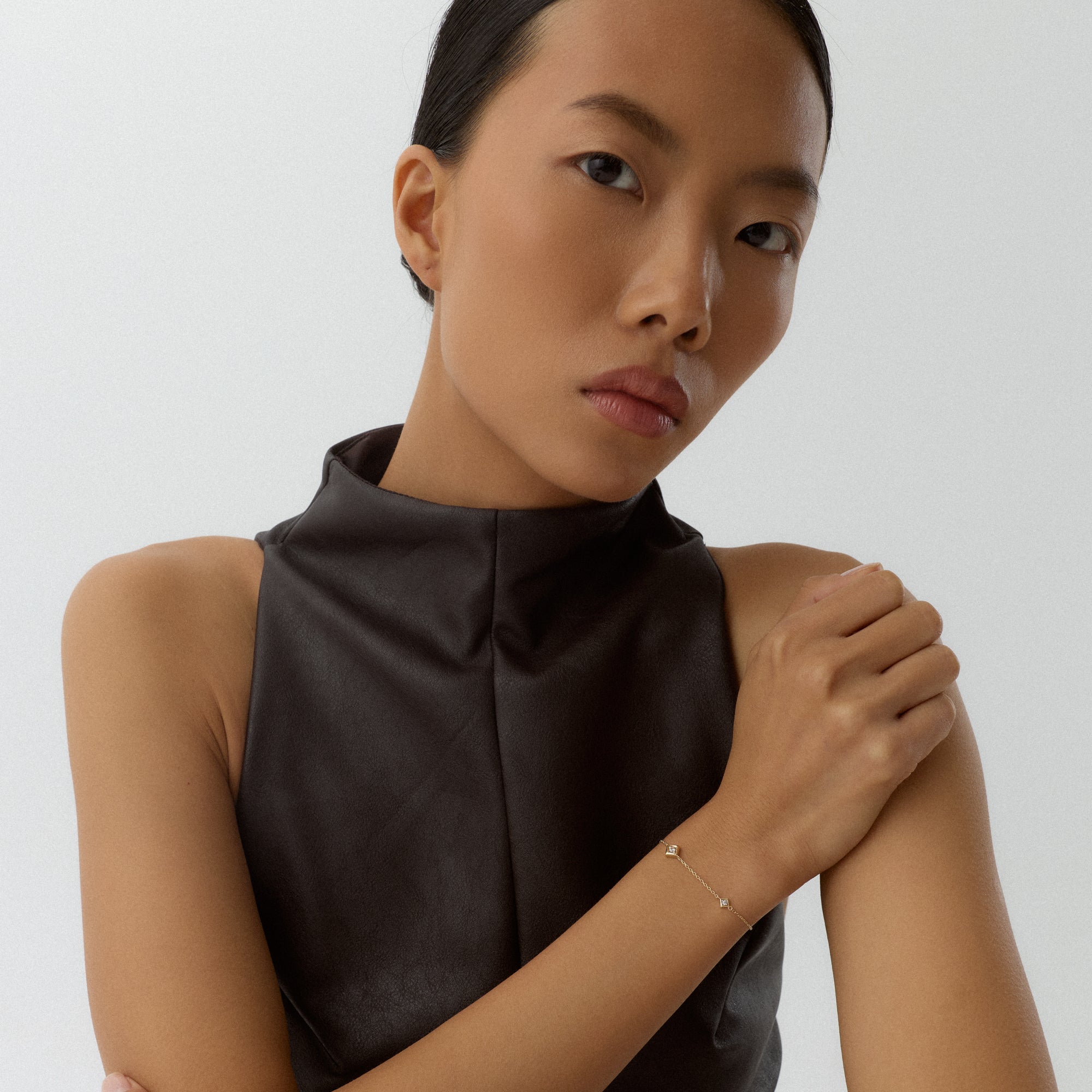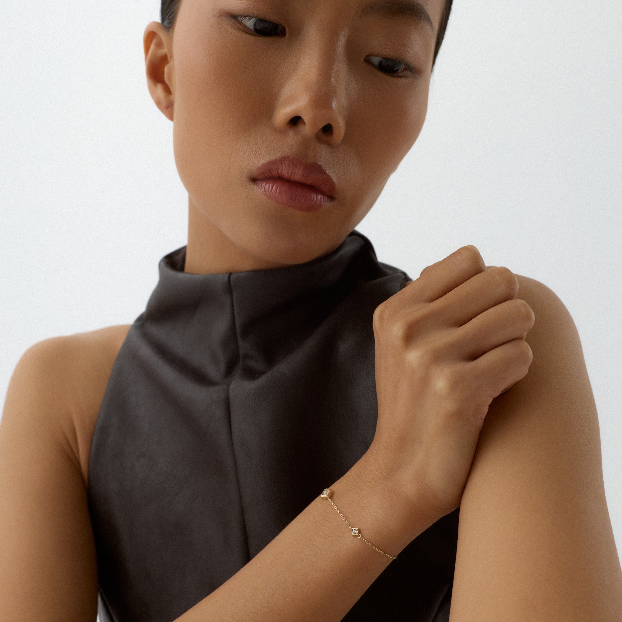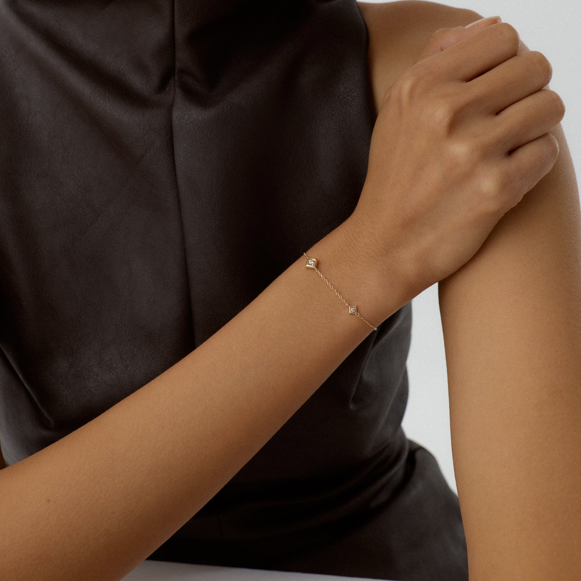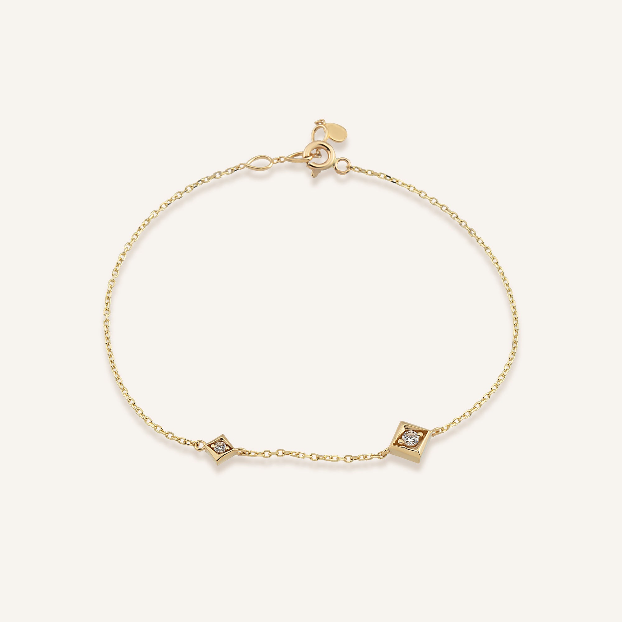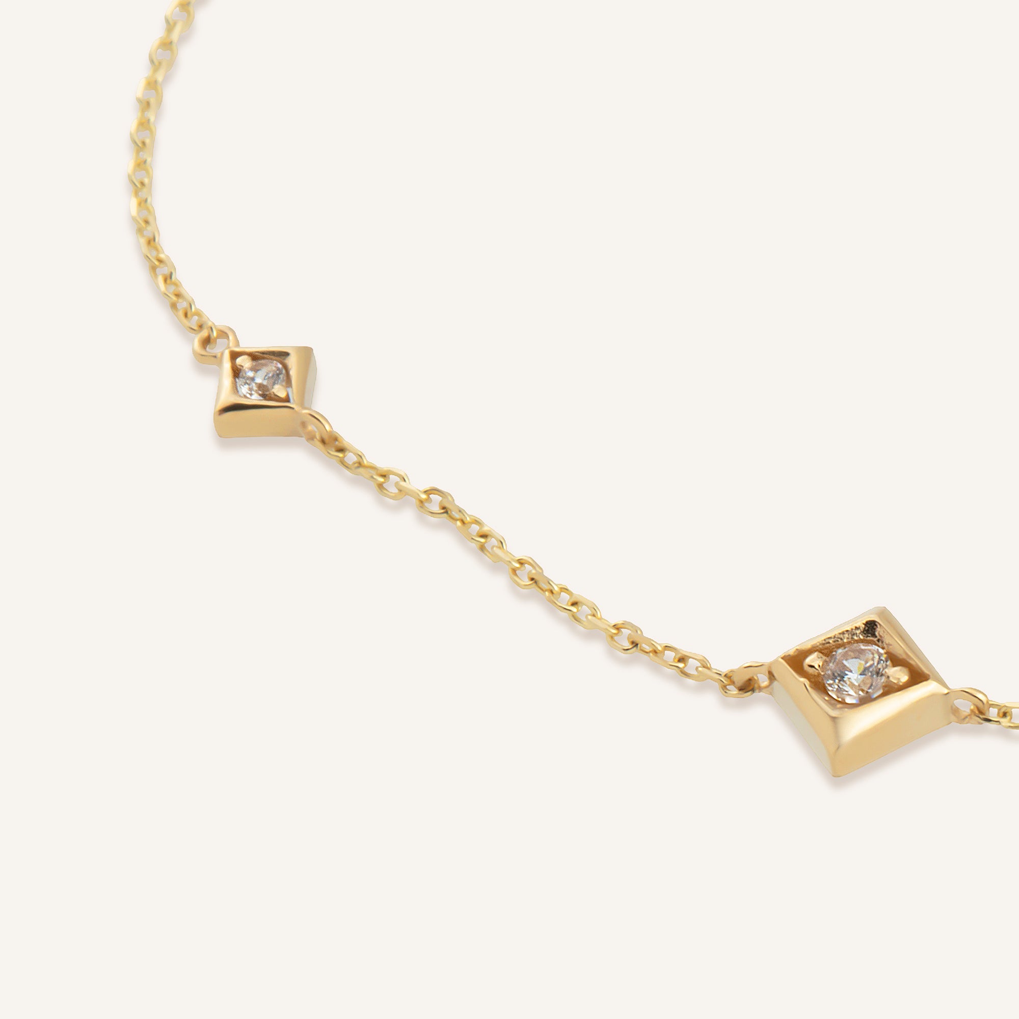 Tetria bilekliği, geometrik zarafetin bilekteki en dengeli halidir. Kare taşlar, her ışık değişiminde parıltısını yeniler. Altın detaylar, bu düzeni sıcak bir dokuyla çerçeveler.