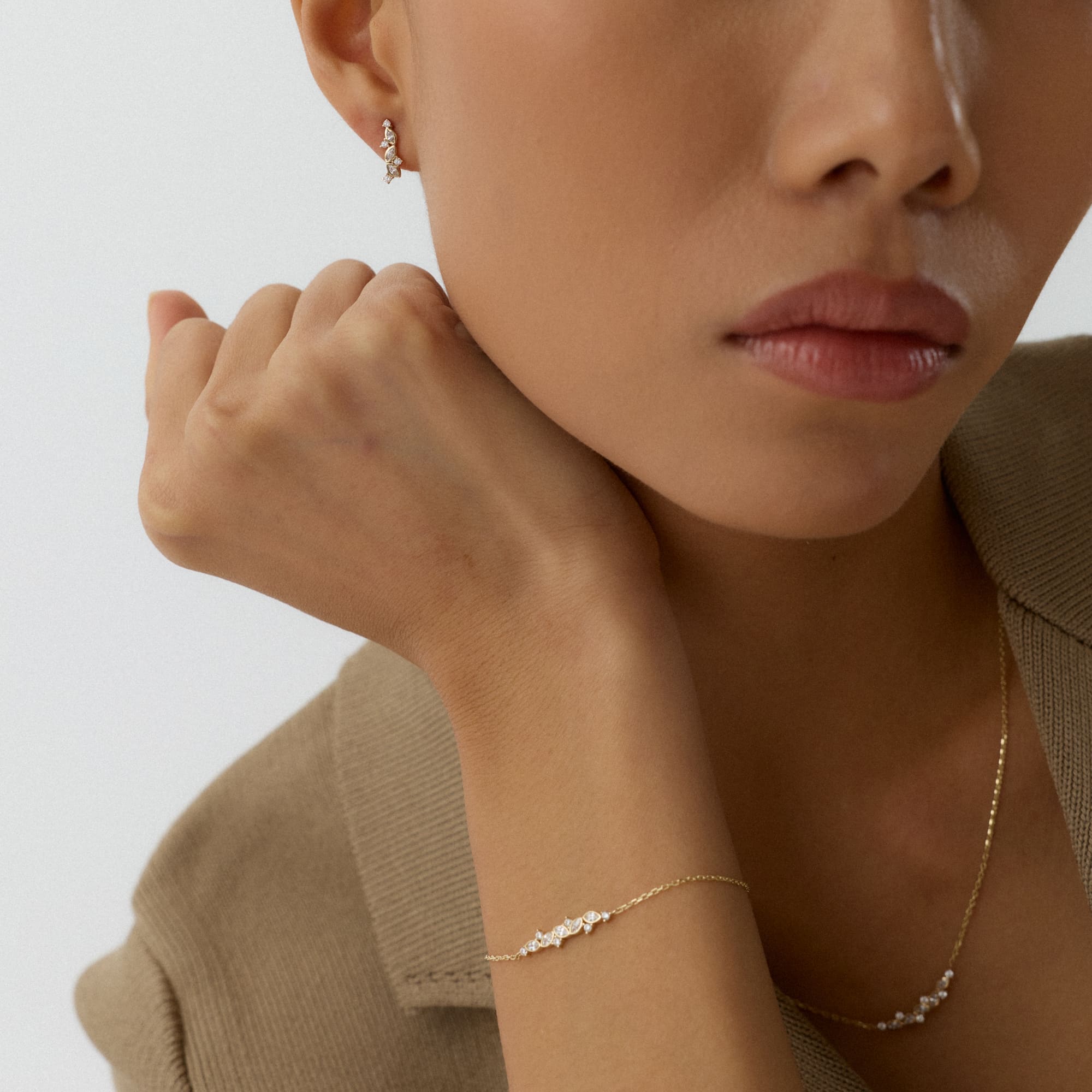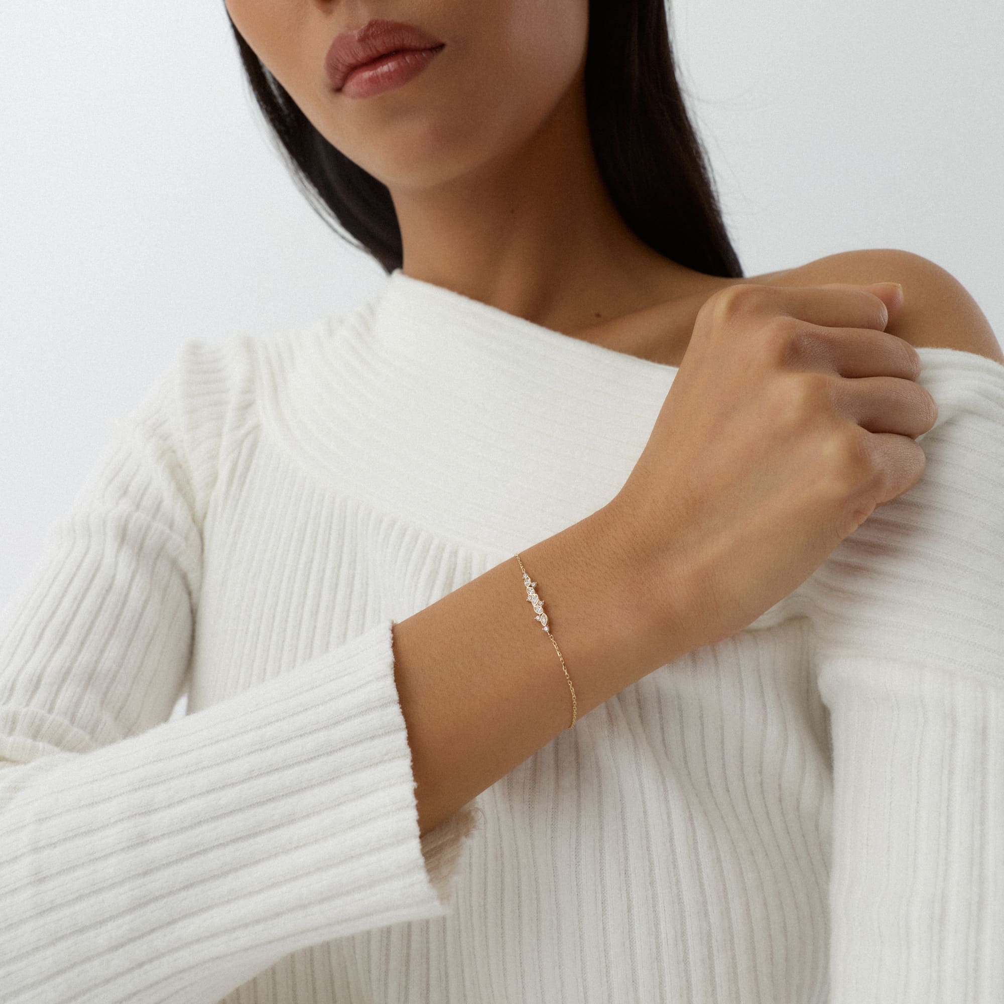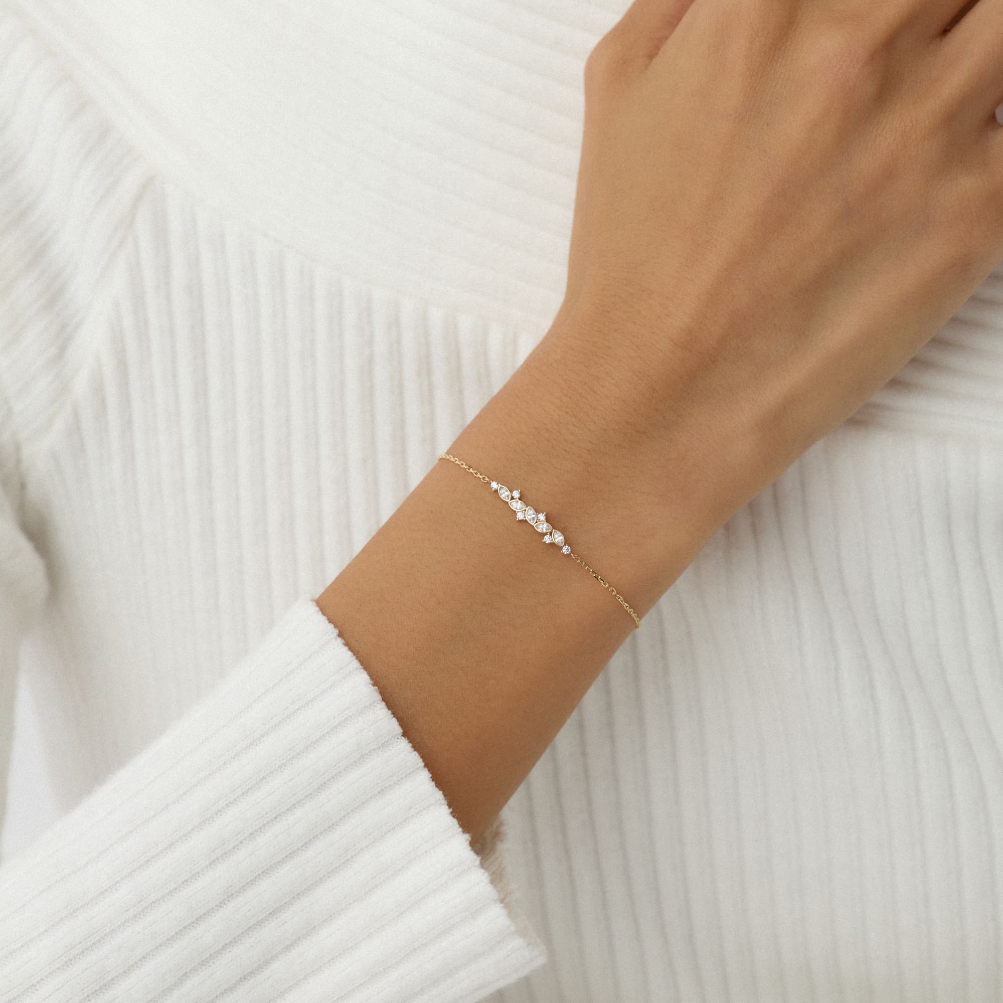 Velora bilekliği, bileğin çevresinde dalga gibi akan bir ışık dizisi oluşturur. Küçük taşlar, altın form üzerinde zarif bir simetriyle ilerler. Her parıltı, kadının enerjik ama sakin ruhunu yansıtır.