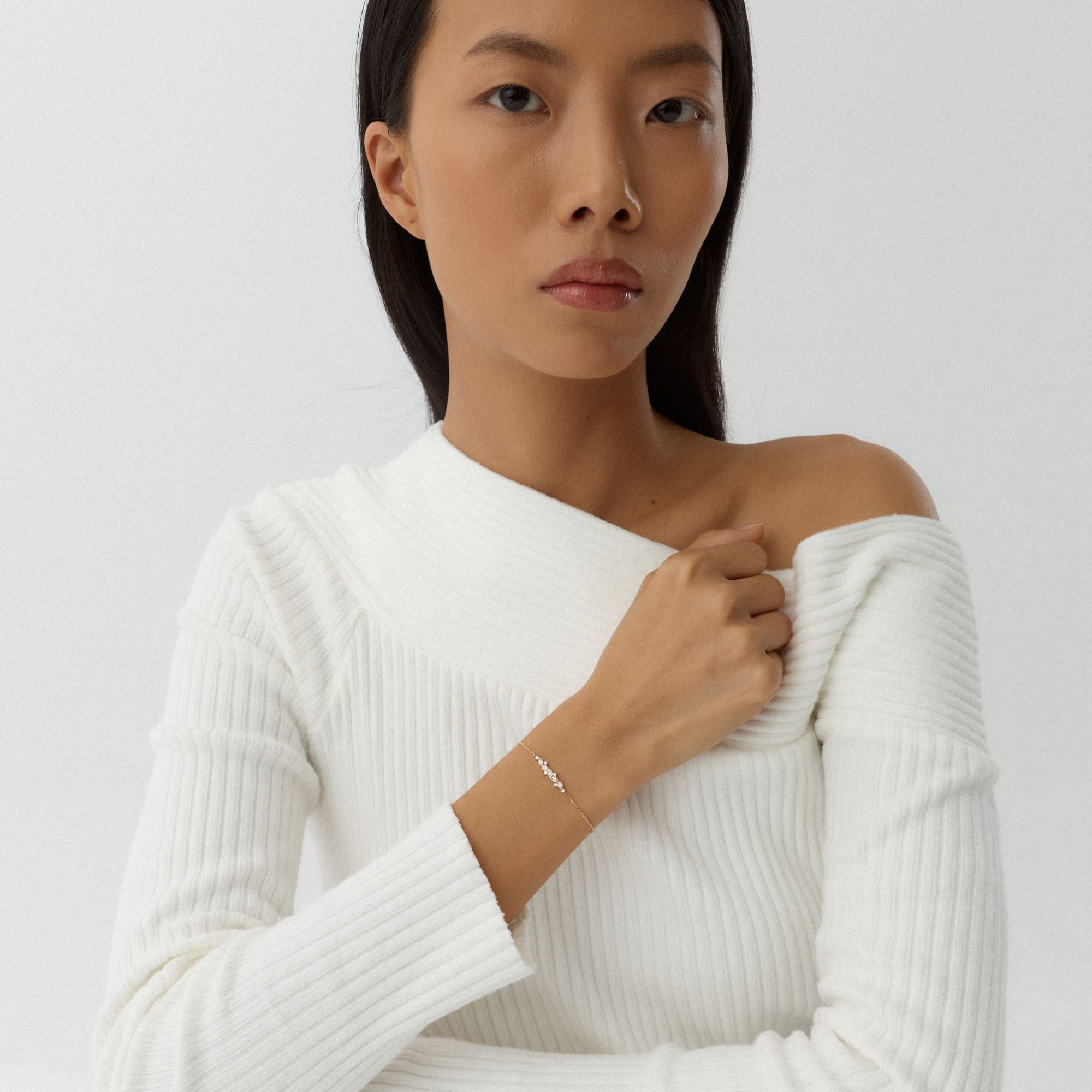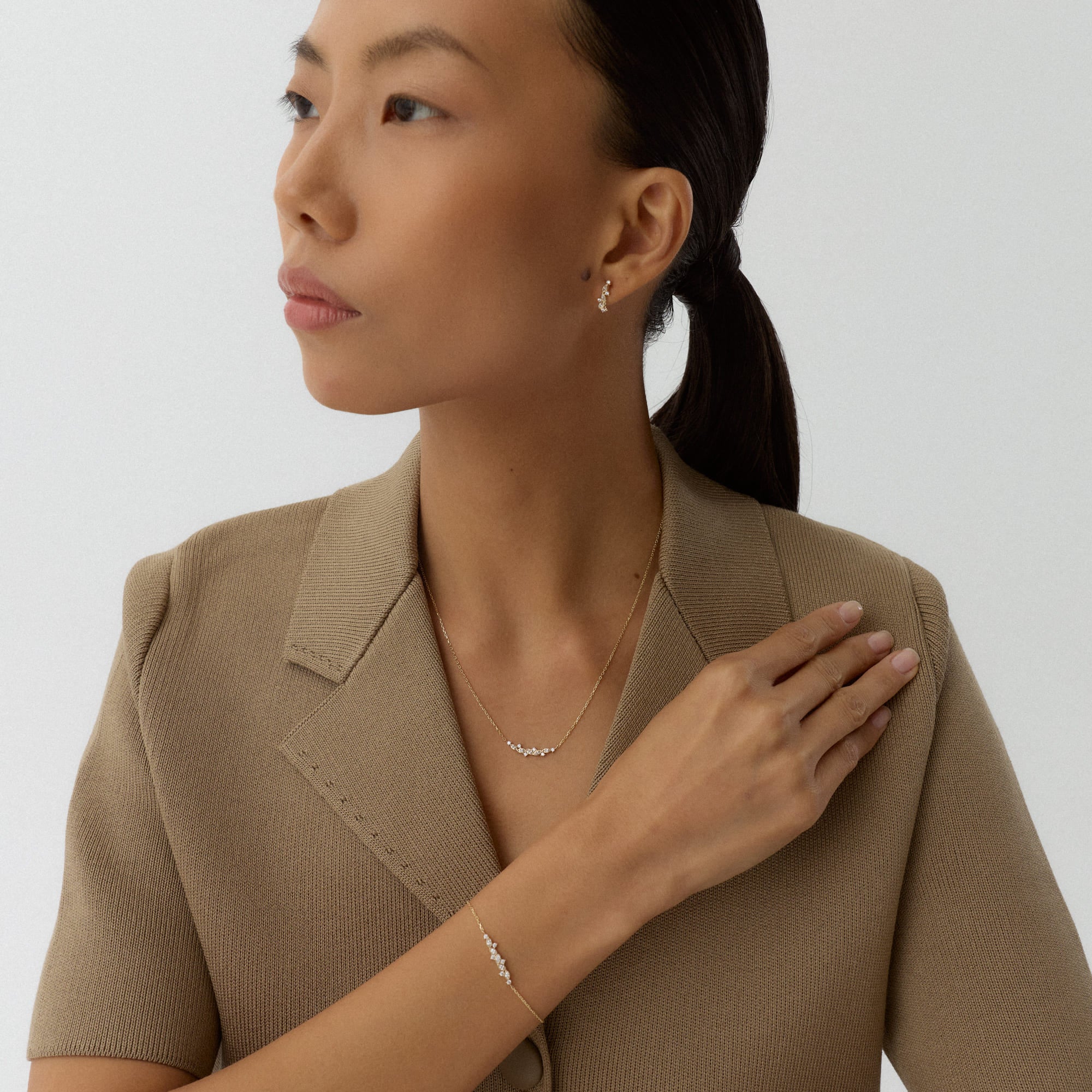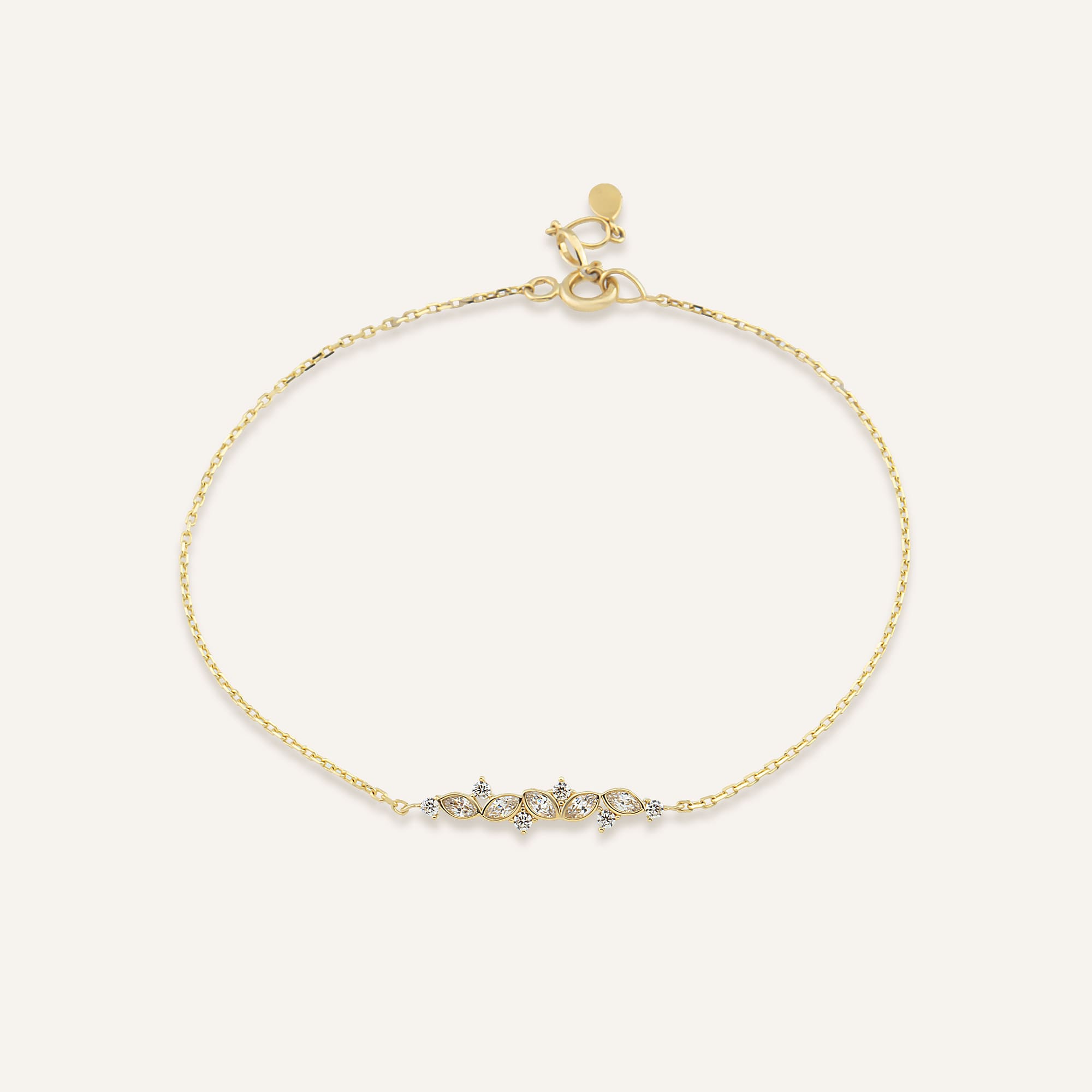 Velora bilekliği, bileğin çevresinde dalga gibi akan bir ışık dizisi oluşturur. Küçük taşlar, altın form üzerinde zarif bir simetriyle ilerler. Her parıltı, kadının enerjik ama sakin ruhunu yansıtır.