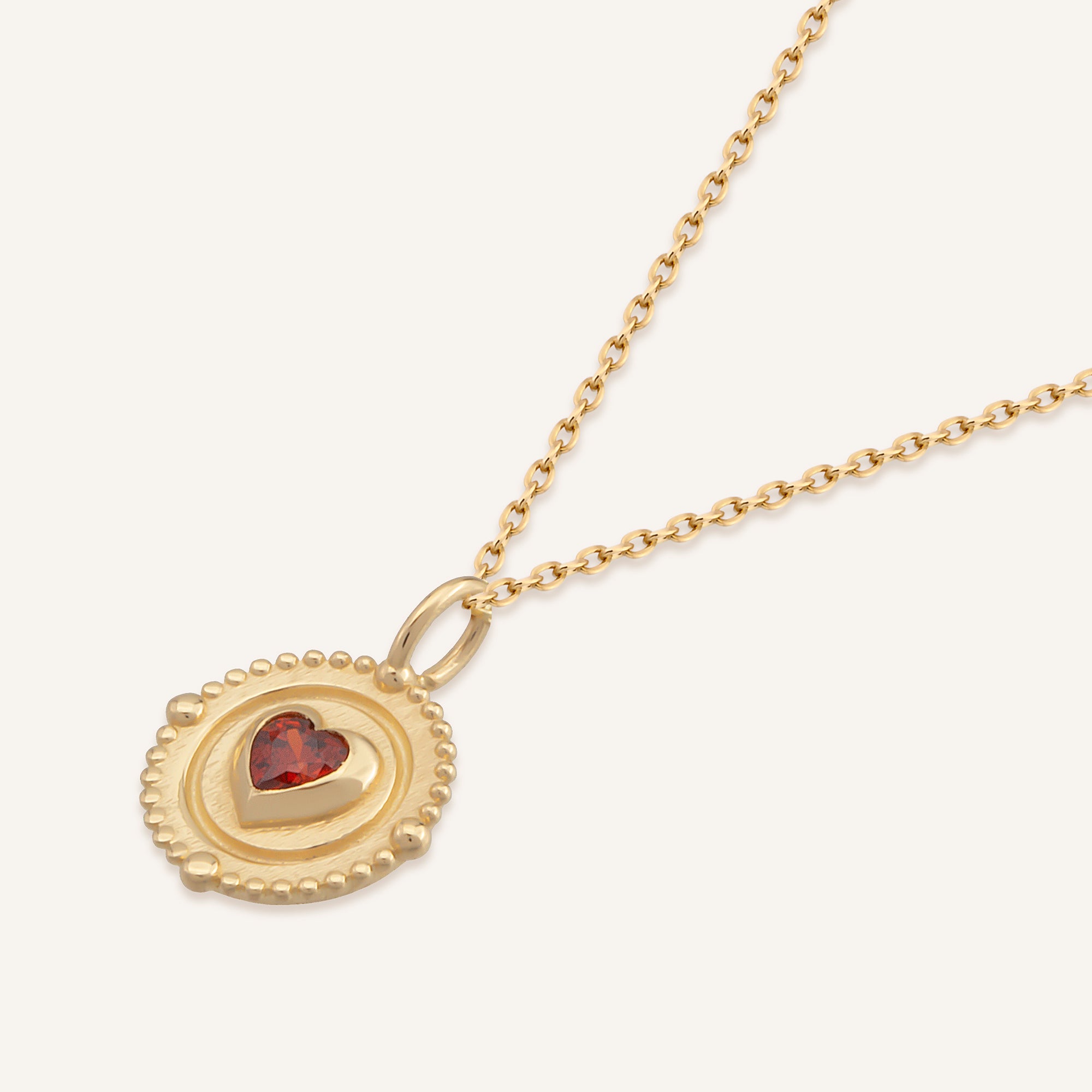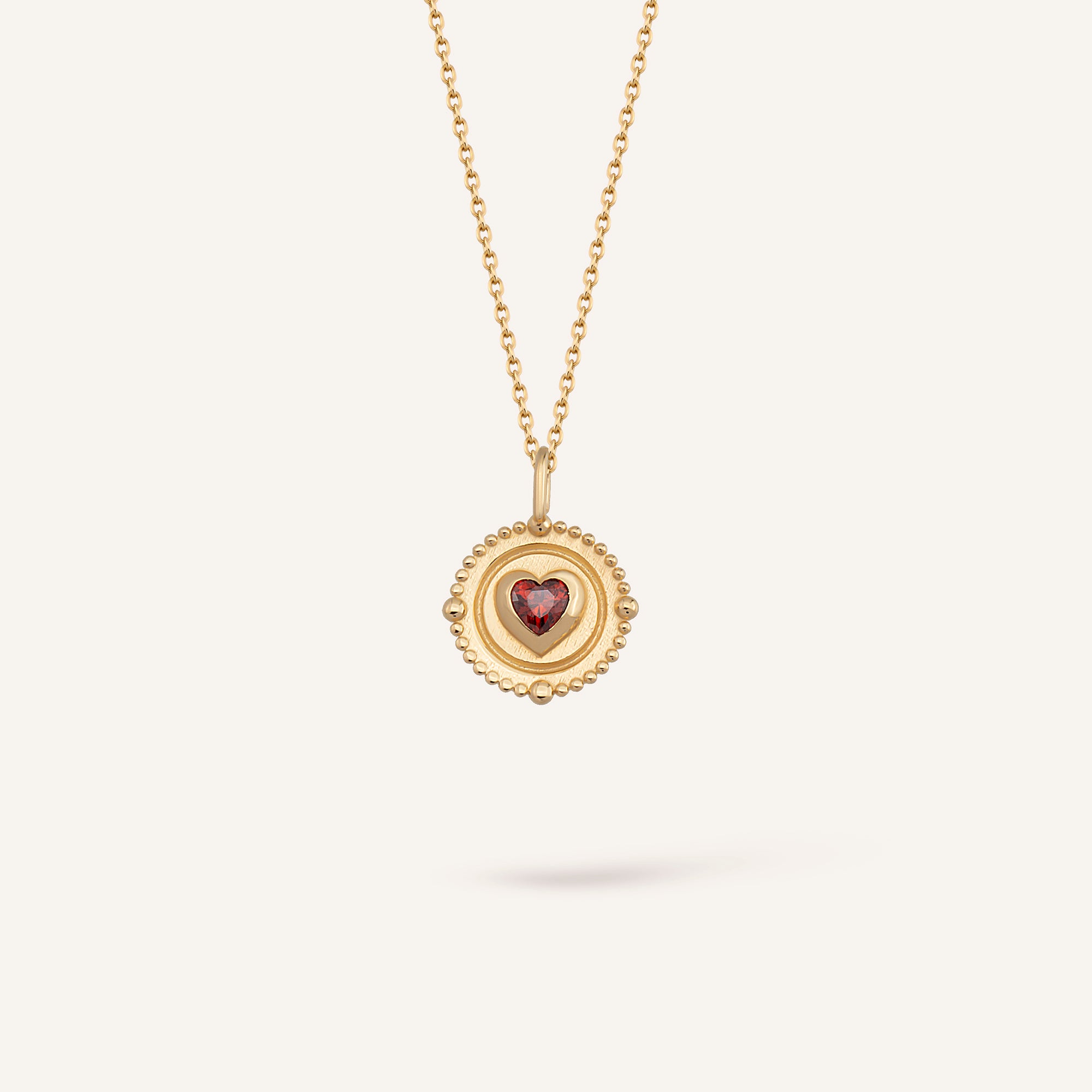 Madalyon formu ve yakut tonunda kalp kesim taşıyla Vintage Love Kolye, romantik bir hatırayı kalbe yakın taşır. 14 ayar altından üretilen bu parça, zamansız bir sevgi ifadesidir.